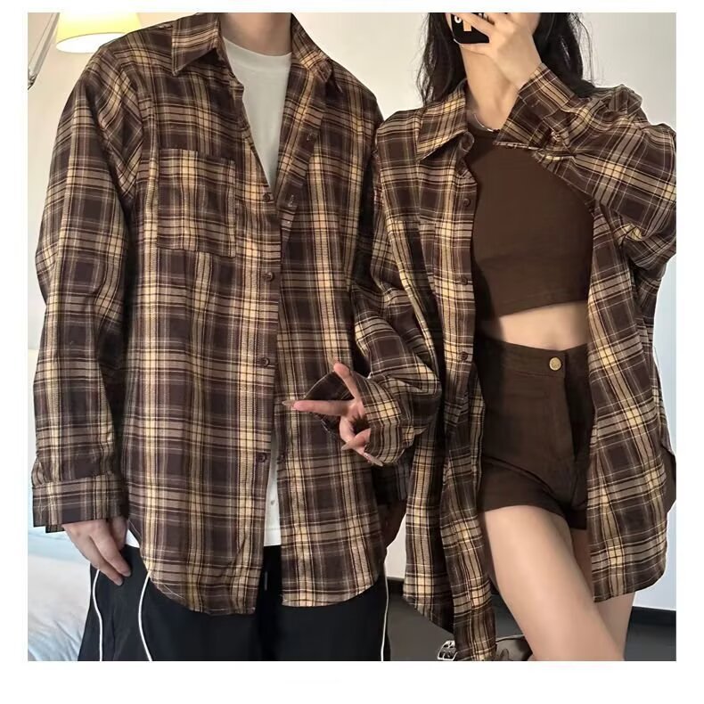 라펠 카디건 패션 느슨한 긴 소매 셔츠 코트를 입은 대외 무역 러프 잘 생긴 격자 무늬 셔츠 복고풍 남녀 커플