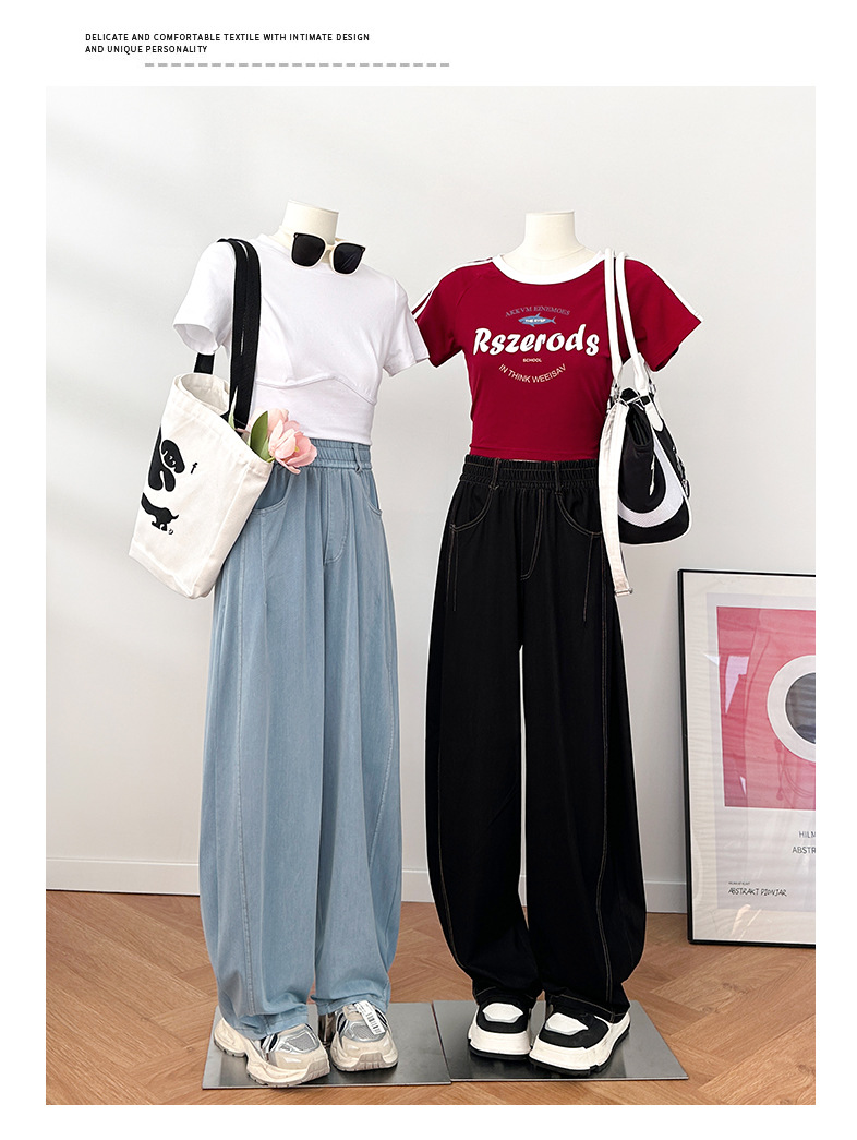 텐셀 청바지 여성의 봄과 여름 얇은 바나나 바지 높은 허리 배 모양의 그림 투약 아이스 실크 캐주얼 스트레이트 와이드 다리 바지스토어 가기
