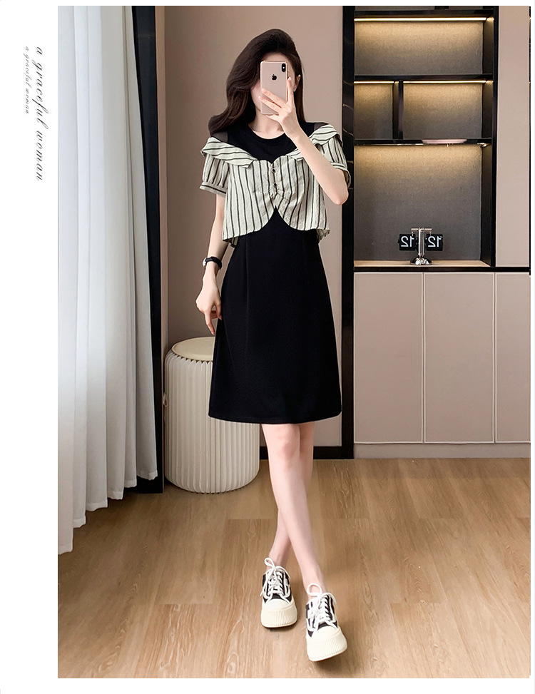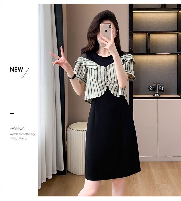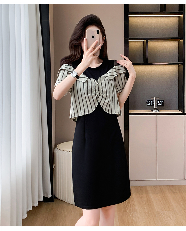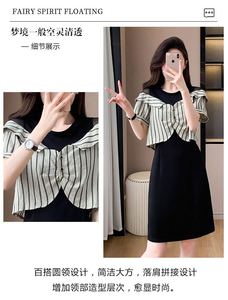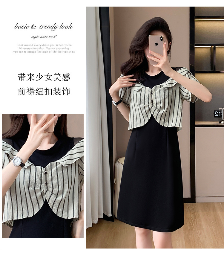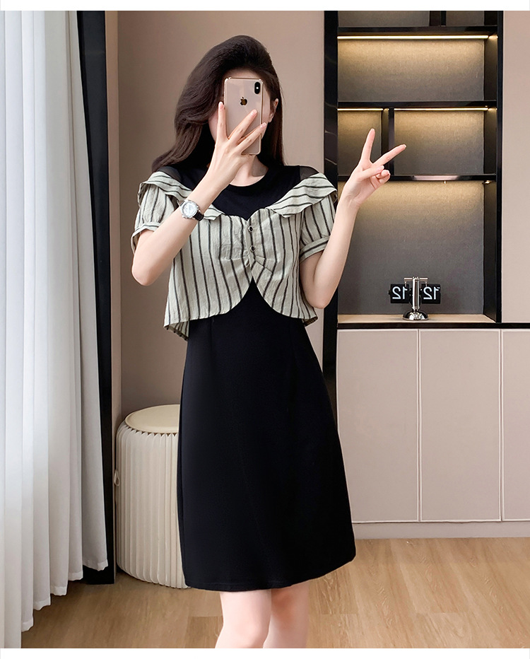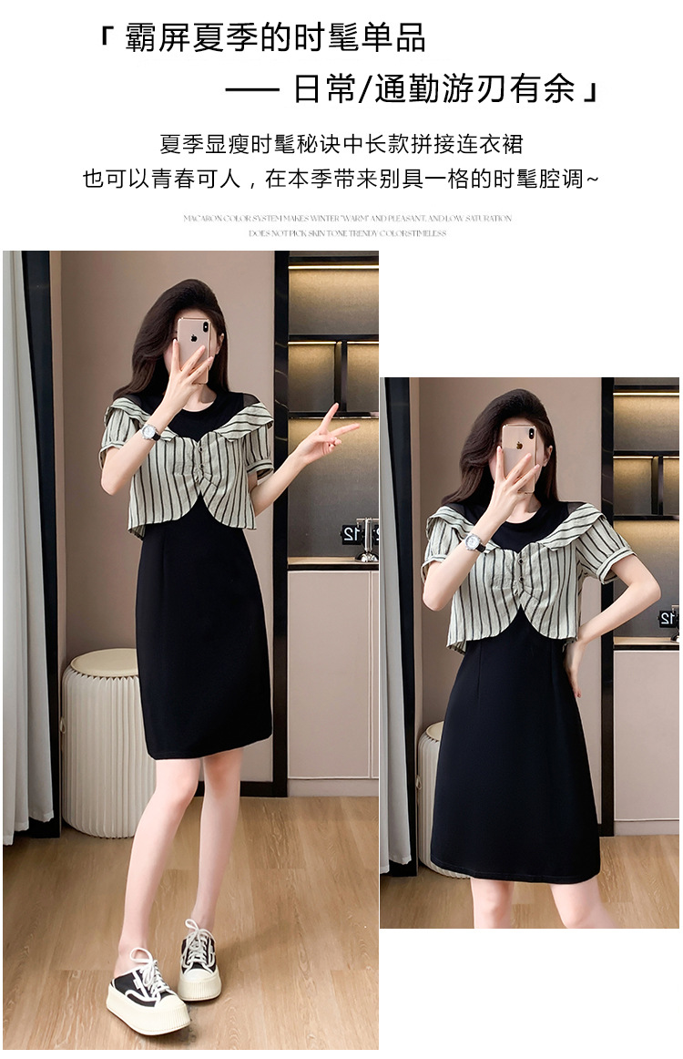 플러스 사이즈 여성 원피스 2025 여름 새로운 바느질 가짜 투피스 약간의 뚱뚱한 패션 슬림 원피스