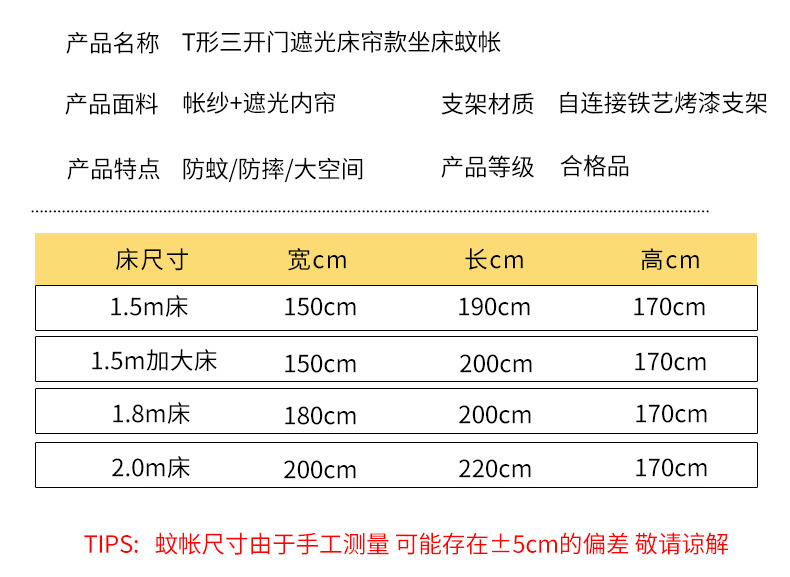 낙상방지, 완전밀폐형, 바닥이 완전히 닫혀있는, 3개의 출입구가 있는, 침대용 지퍼형 암호화 모기장, 1.5m 스탠드, 2.18m 침대 커튼