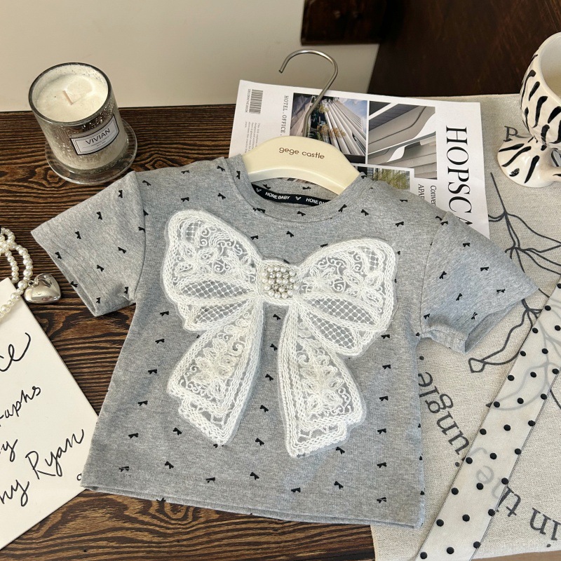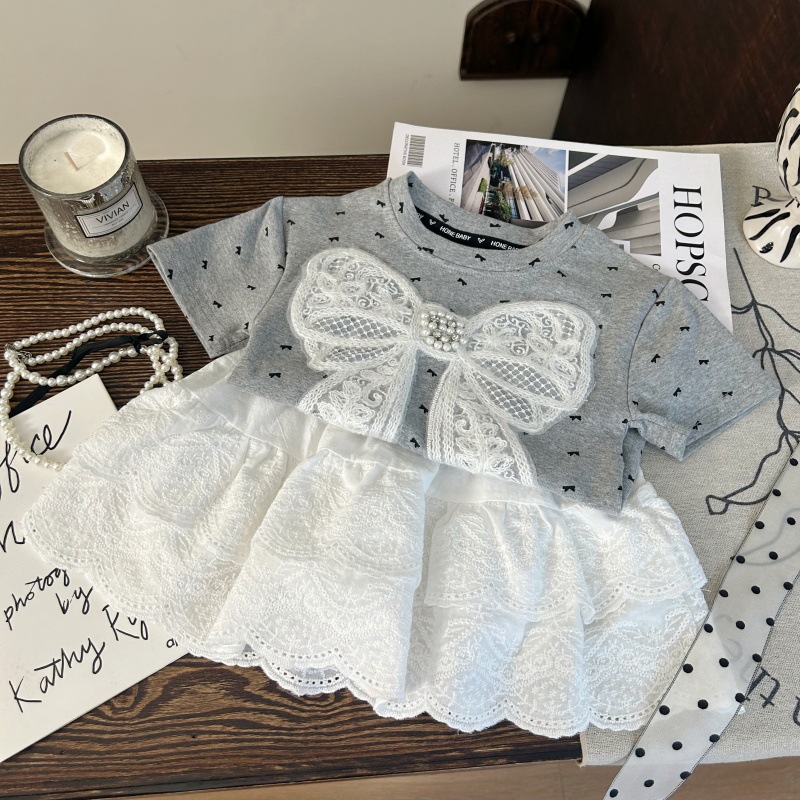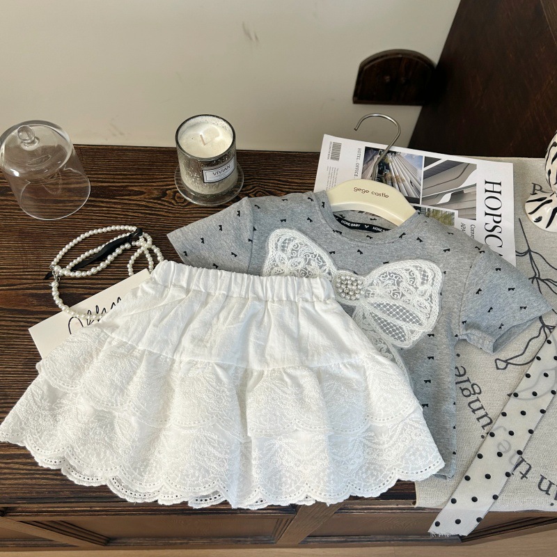 한국 아동복 2025 새로운 여름 소녀 활 반팔 티셔츠 어린이 흰색 레이스 스커트 바지 투피스 세트스토어 가기