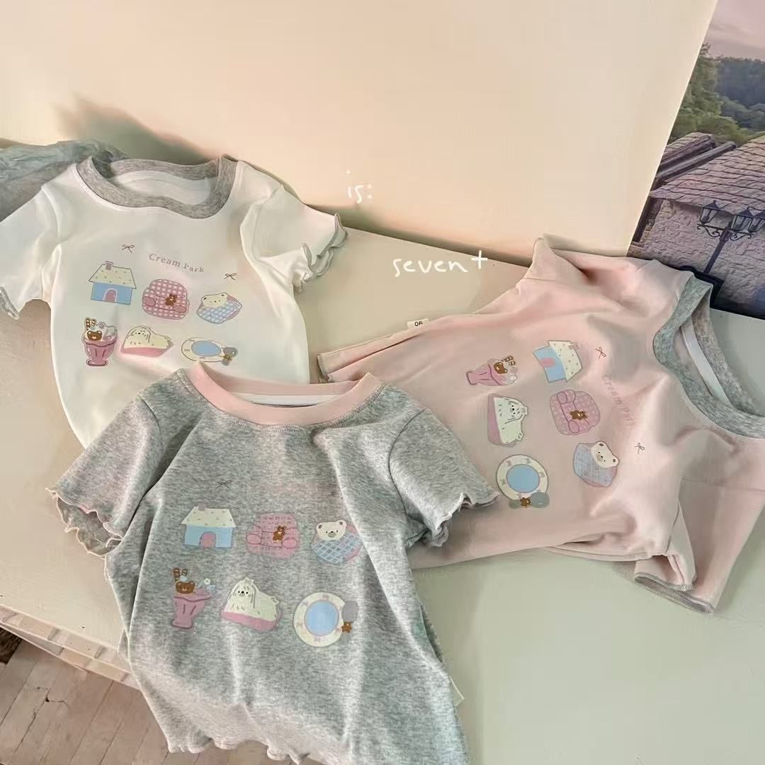 2025 여름 새로운 나무 귀 아동복 면화 소녀 컬러 매칭 만화 인쇄 달콤한 공주 스타일 반팔 티셔츠스토어 가기