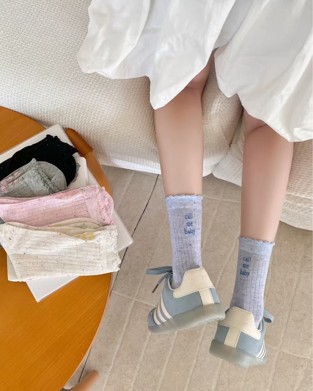 봄과 여름 양말 여성의 중간 배럴 얇은 핀 트렌디 한 한국 간단한 뒤꿈치 편지 더미 양말 회색 레이스 스타킹스토어 가기