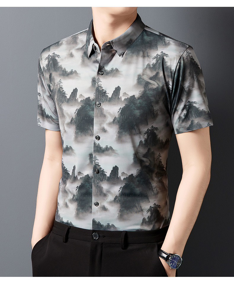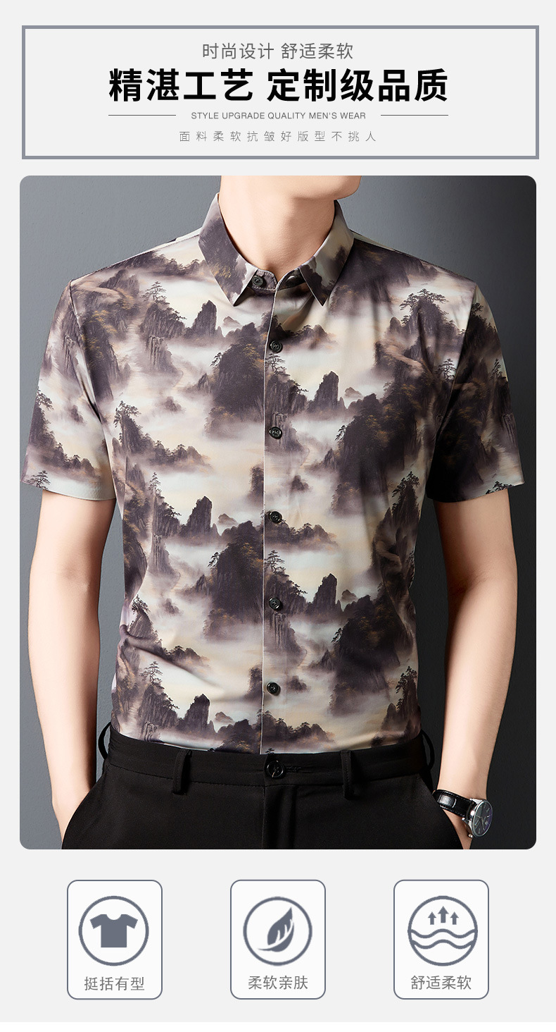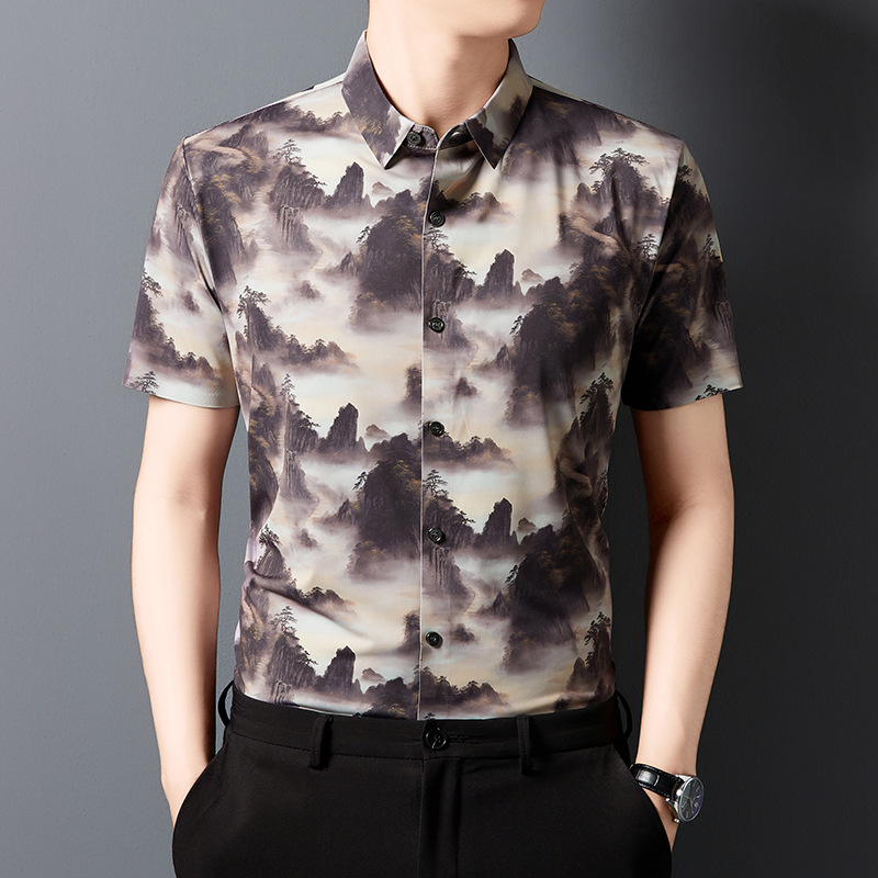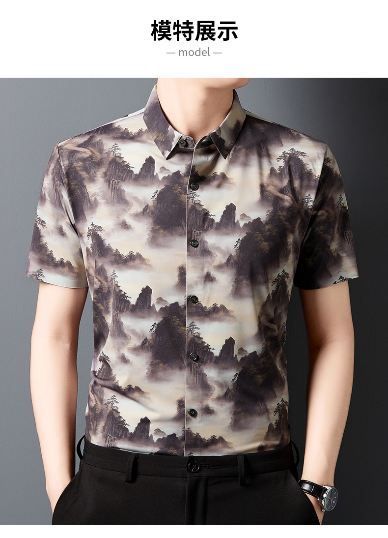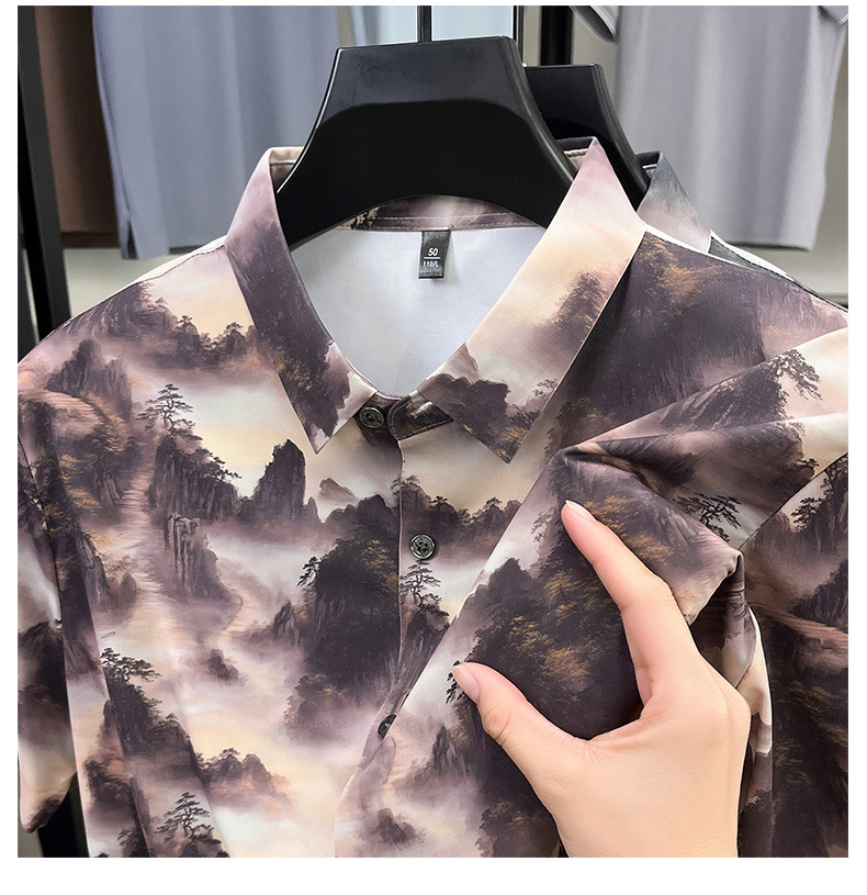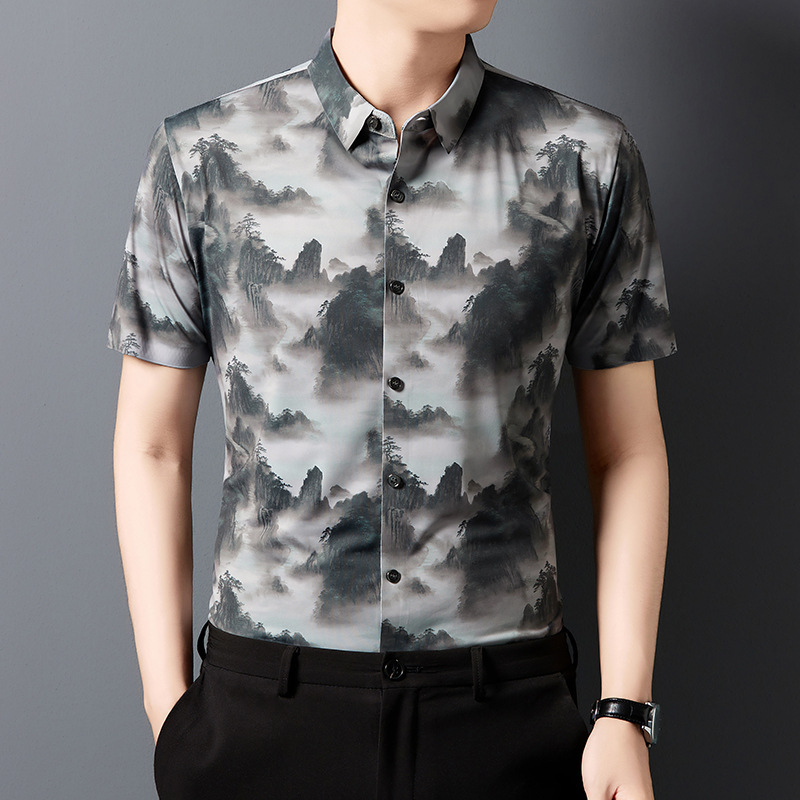 2025 여름 얼음 실크 남성 꽃 셔츠 높은 감각 새로운 중년 비즈니스 캐주얼 인쇄 남성 셔츠 도매스토어 가기