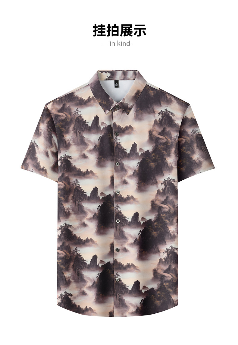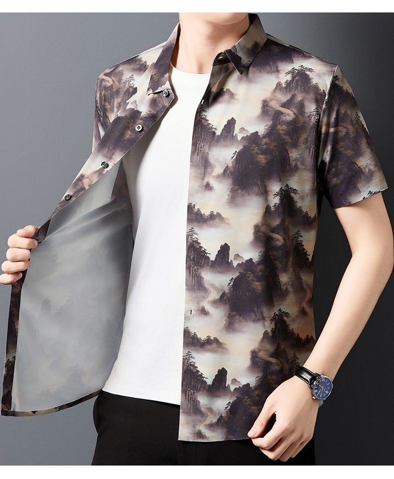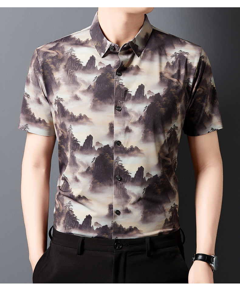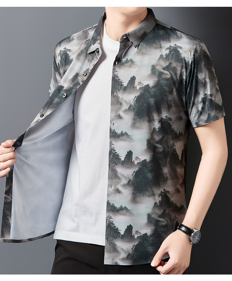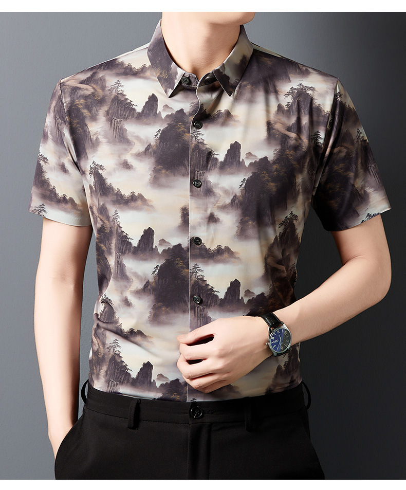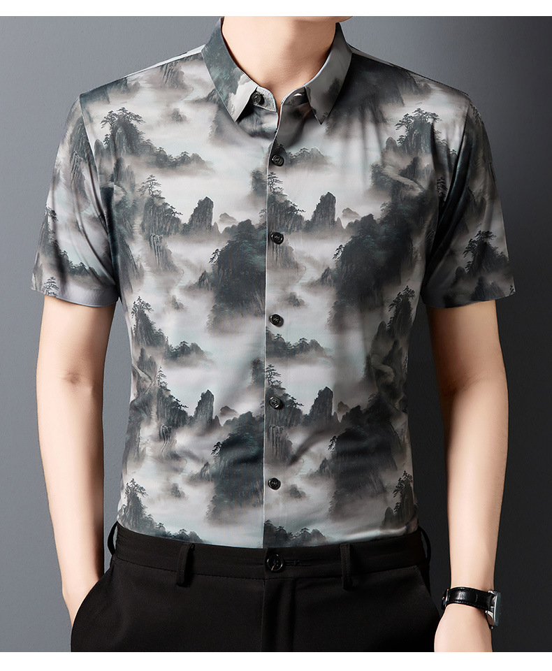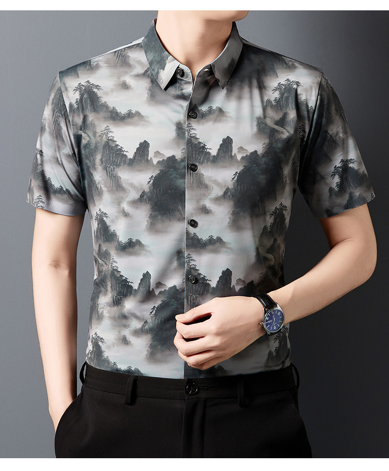 2025 여름 얼음 실크 남성 꽃 셔츠 높은 감각 새로운 중년 비즈니스 캐주얼 인쇄 남성 셔츠 도매