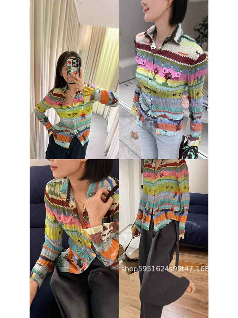 배송 준비 완료! 25 여름 신작 주름 쉬폰 디자인 프린트 컬러 셔츠 여성