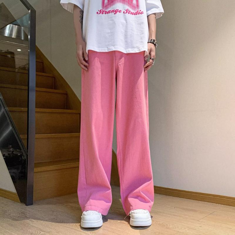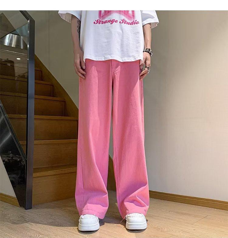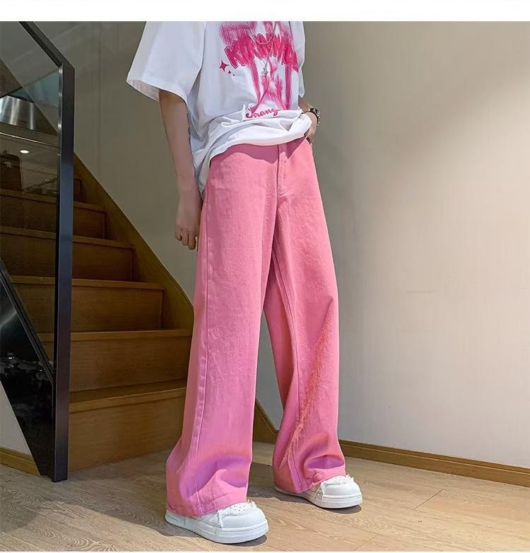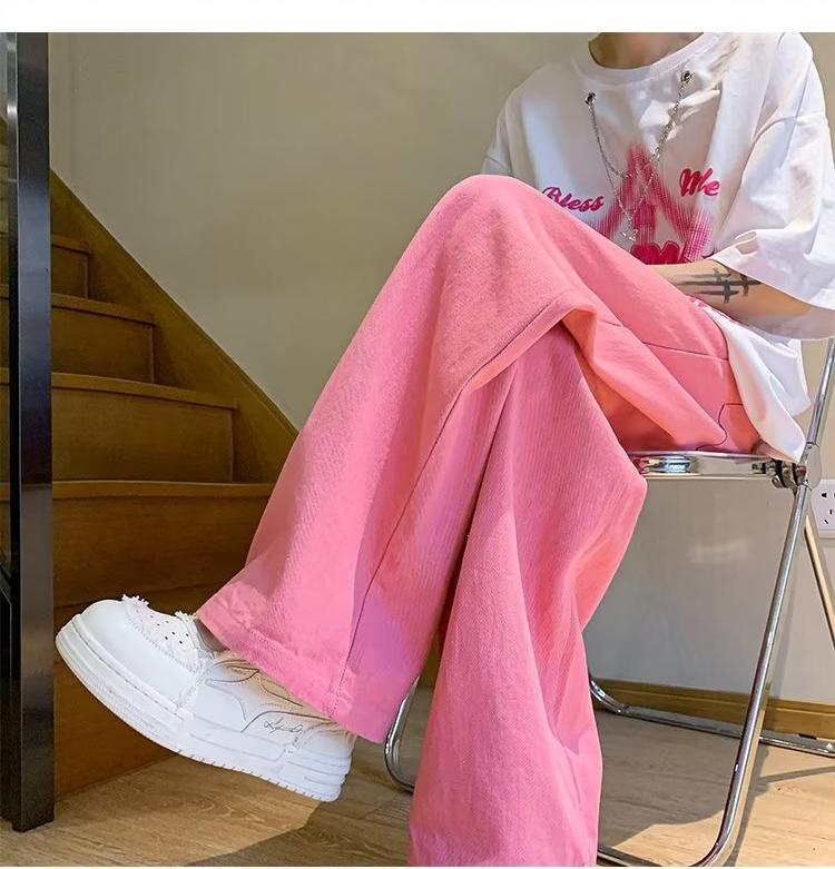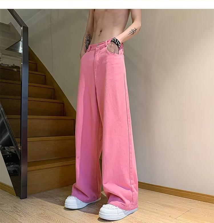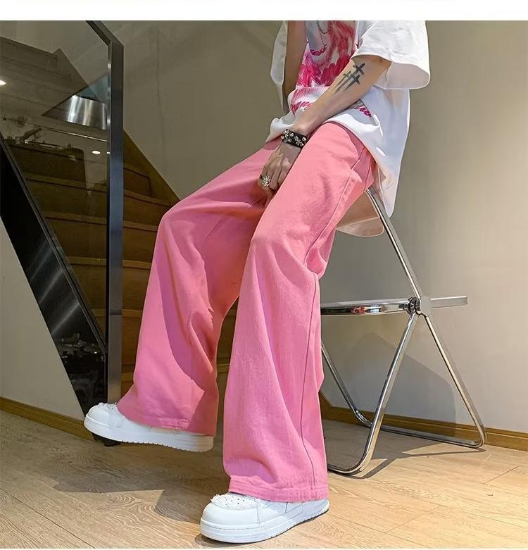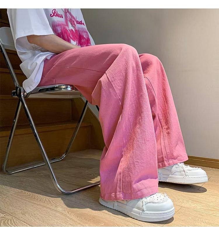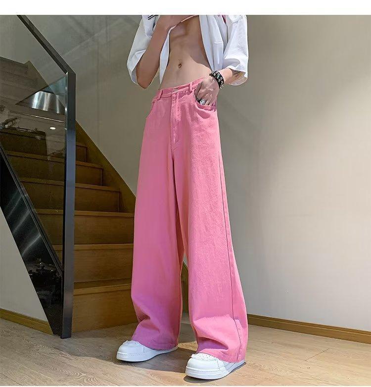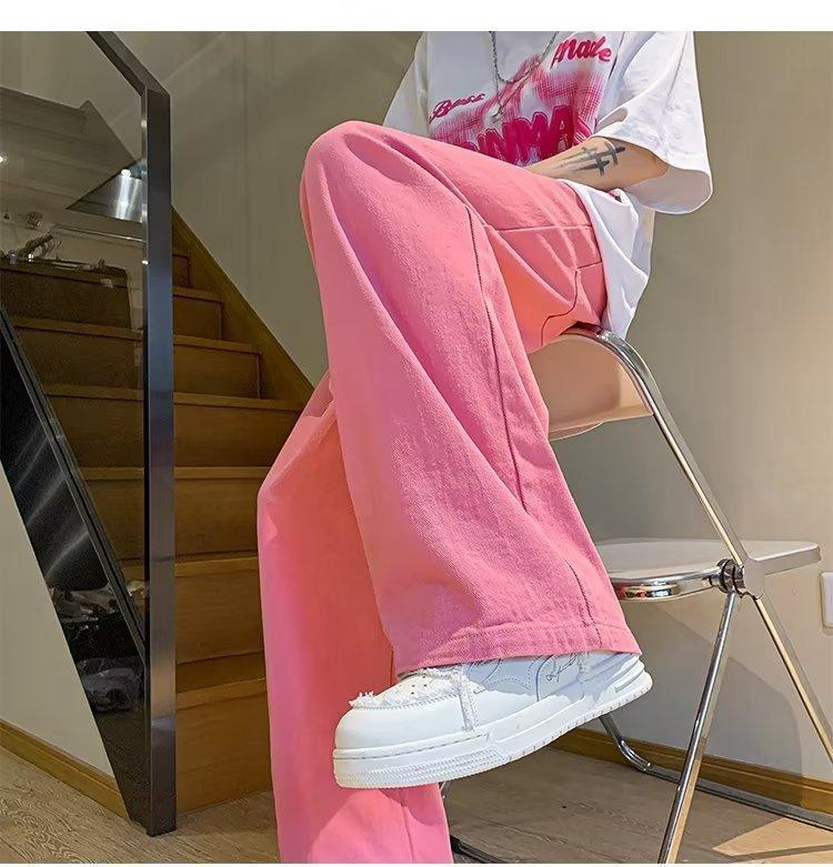 美式复古夏季彩色阔腿牛仔裤粉红色多巴胺穿搭宽松直筒拖地长裤男