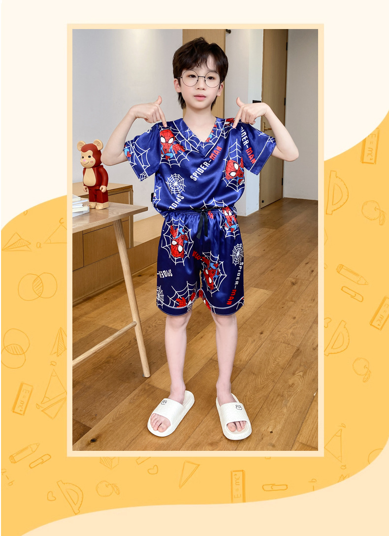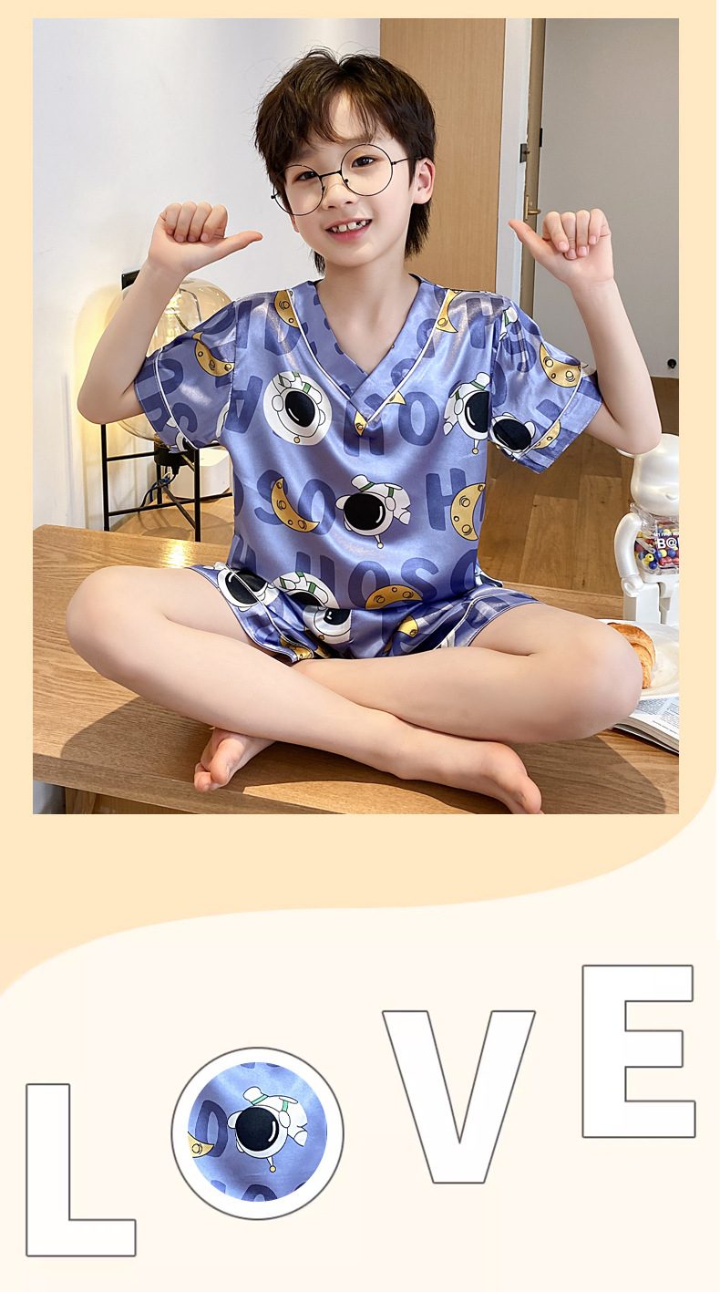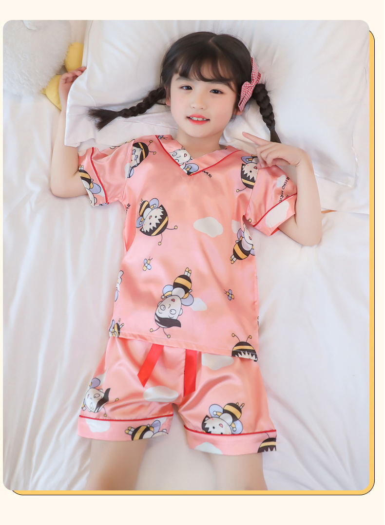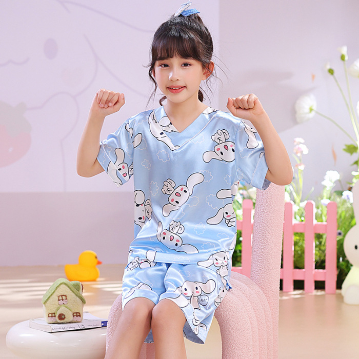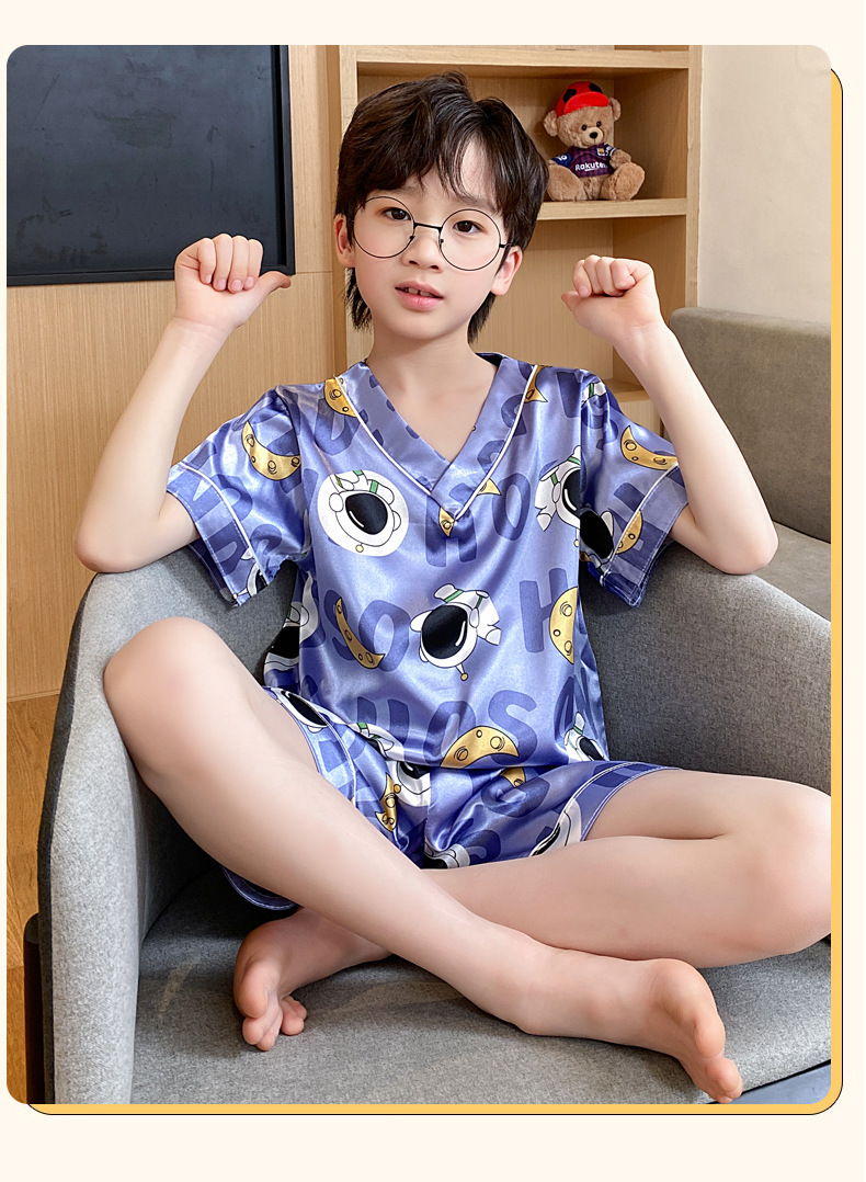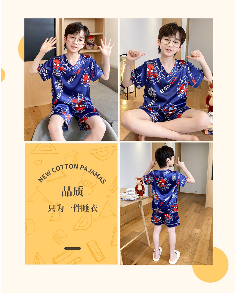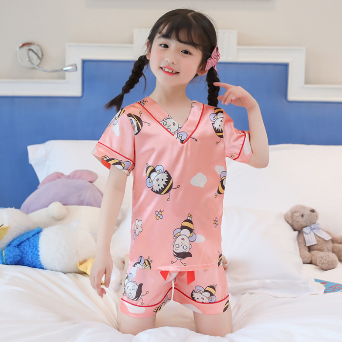 사드 여름 만화 V넥 아이스 실크 어린이 한국 잠옷 소년 소녀 반바지 반바지 반팔 통기성 사랑스러운 의류