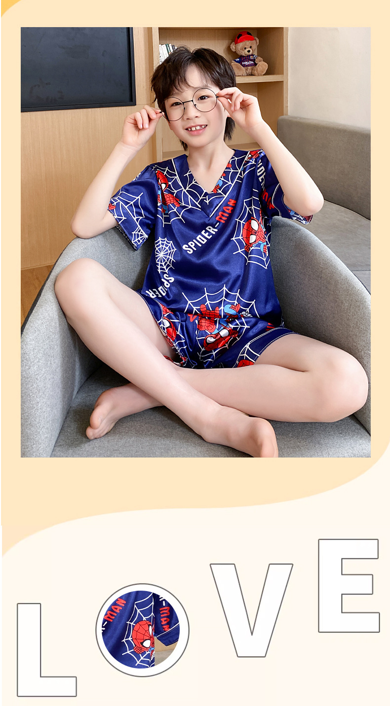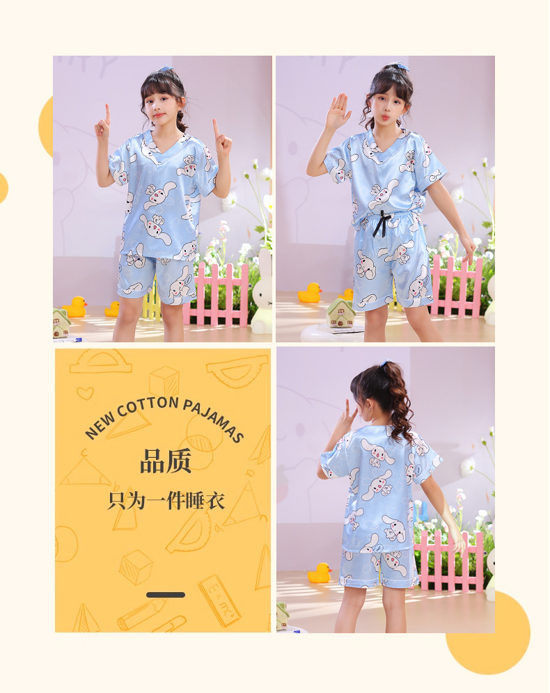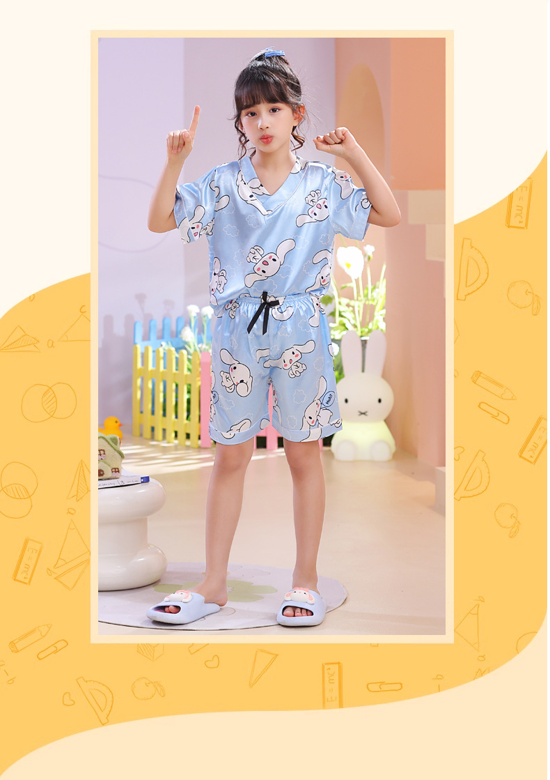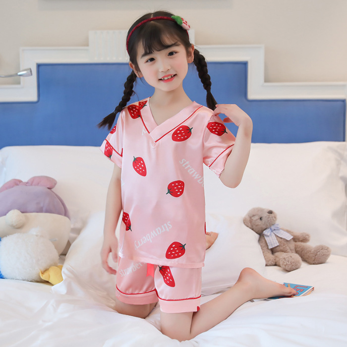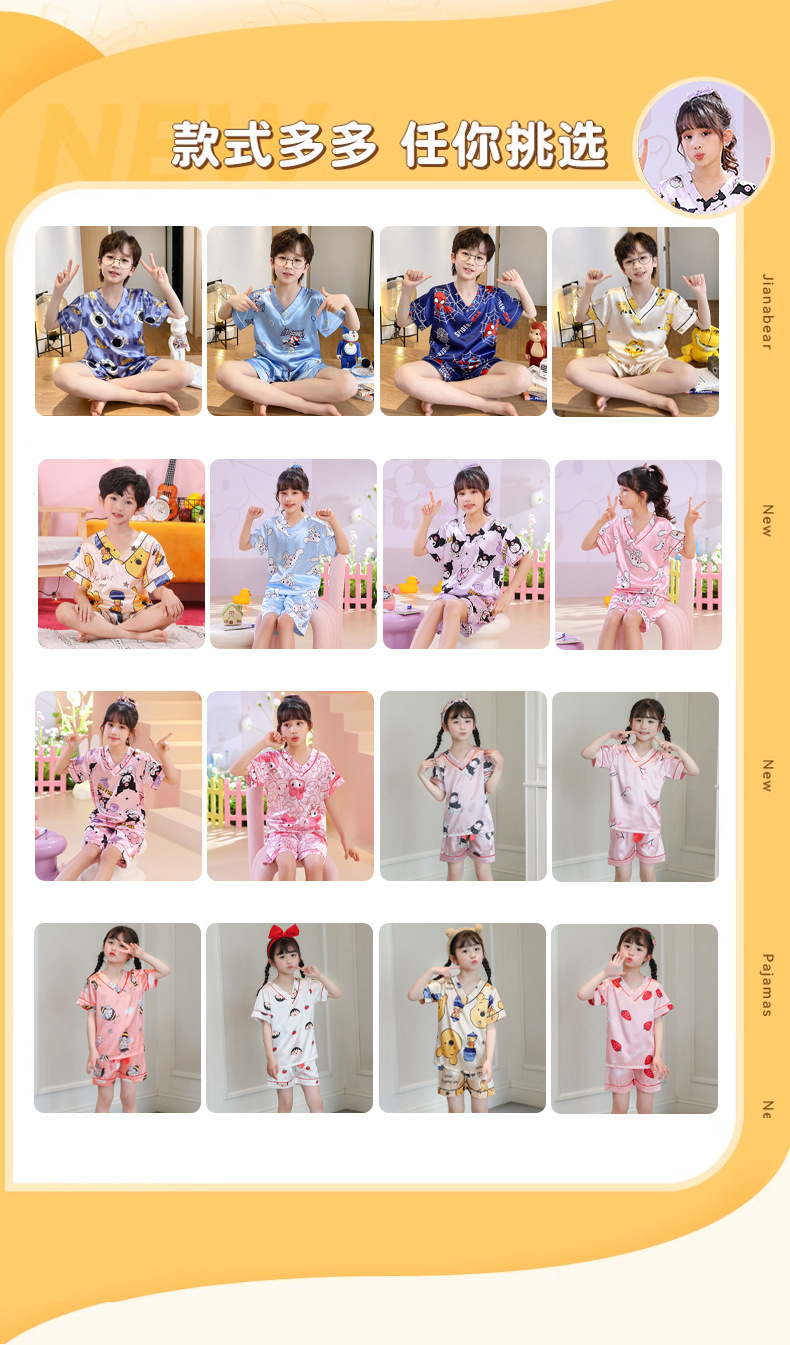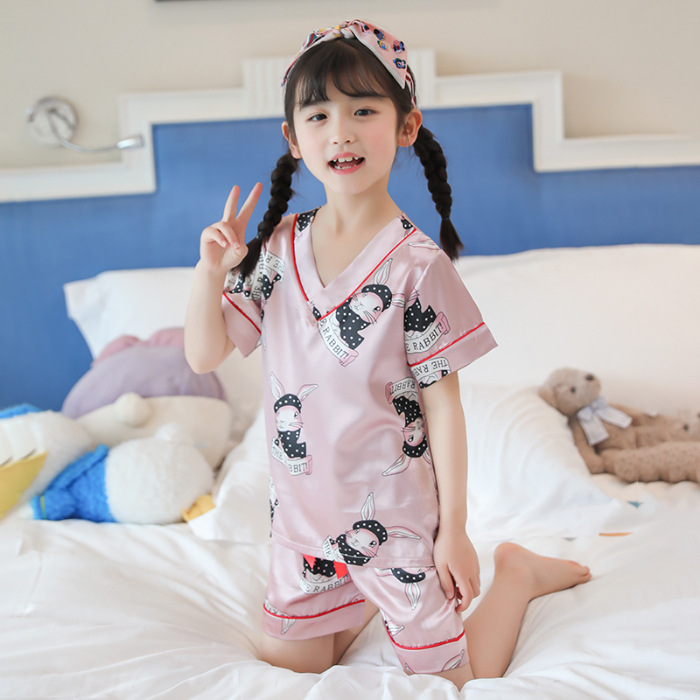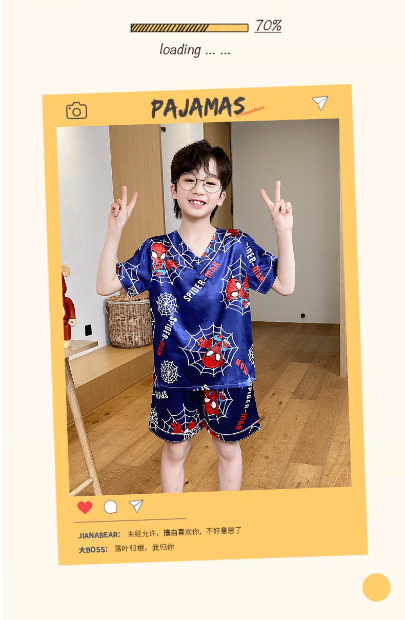 사드 여름 만화 V넥 아이스 실크 어린이 한국 잠옷 소년 소녀 반바지 반바지 반팔 통기성 사랑스러운 의류