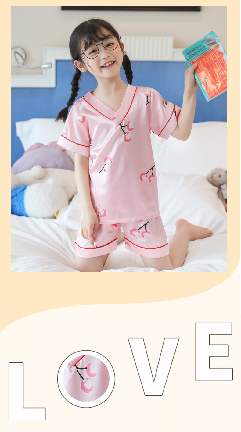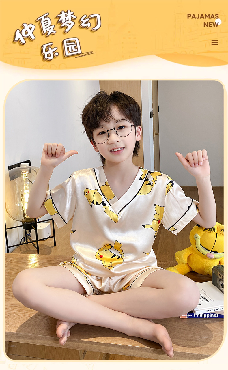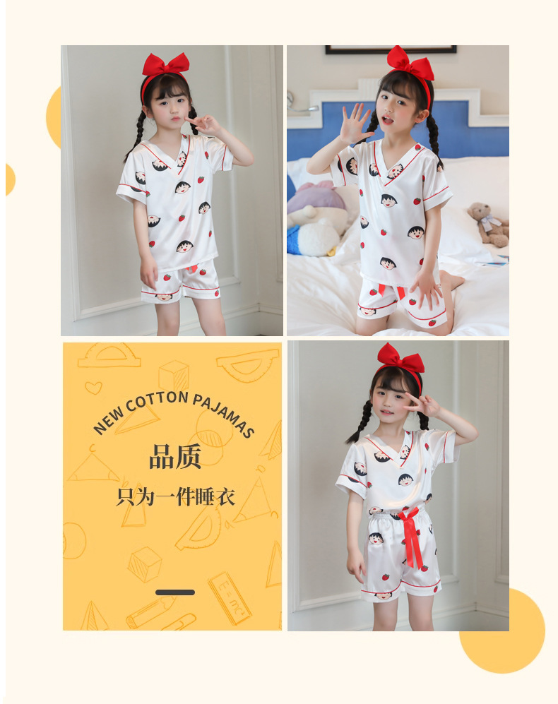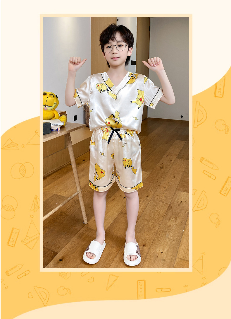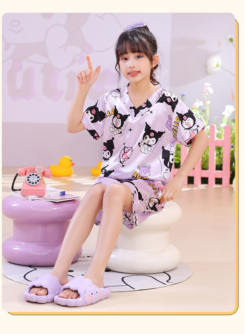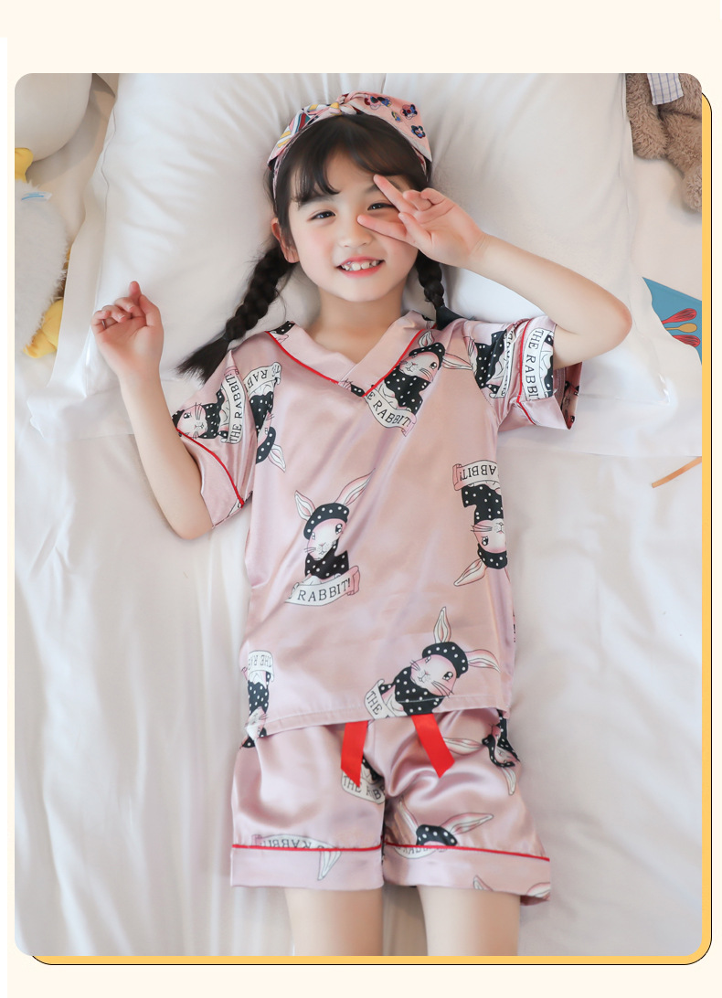 사드 여름 만화 V넥 아이스 실크 어린이 한국 잠옷 소년 소녀 반바지 반바지 반팔 통기성 사랑스러운 의류