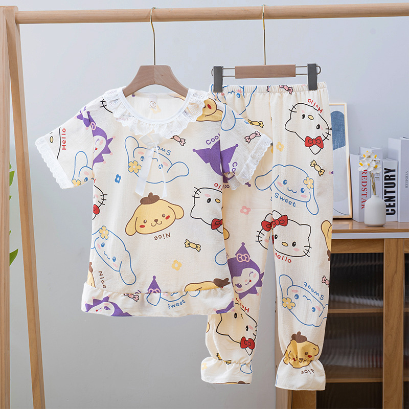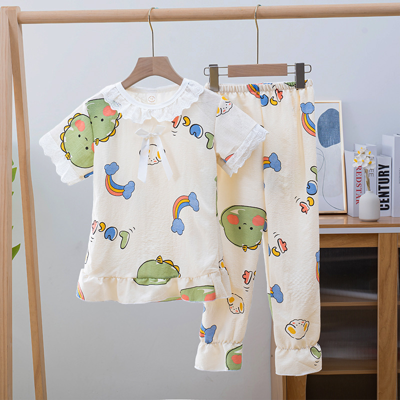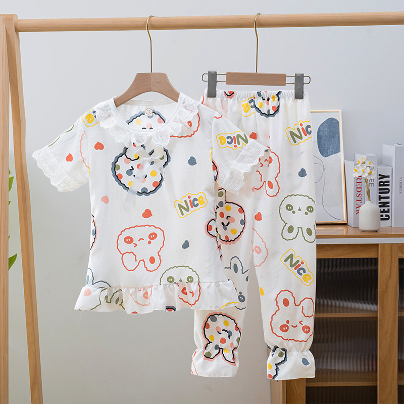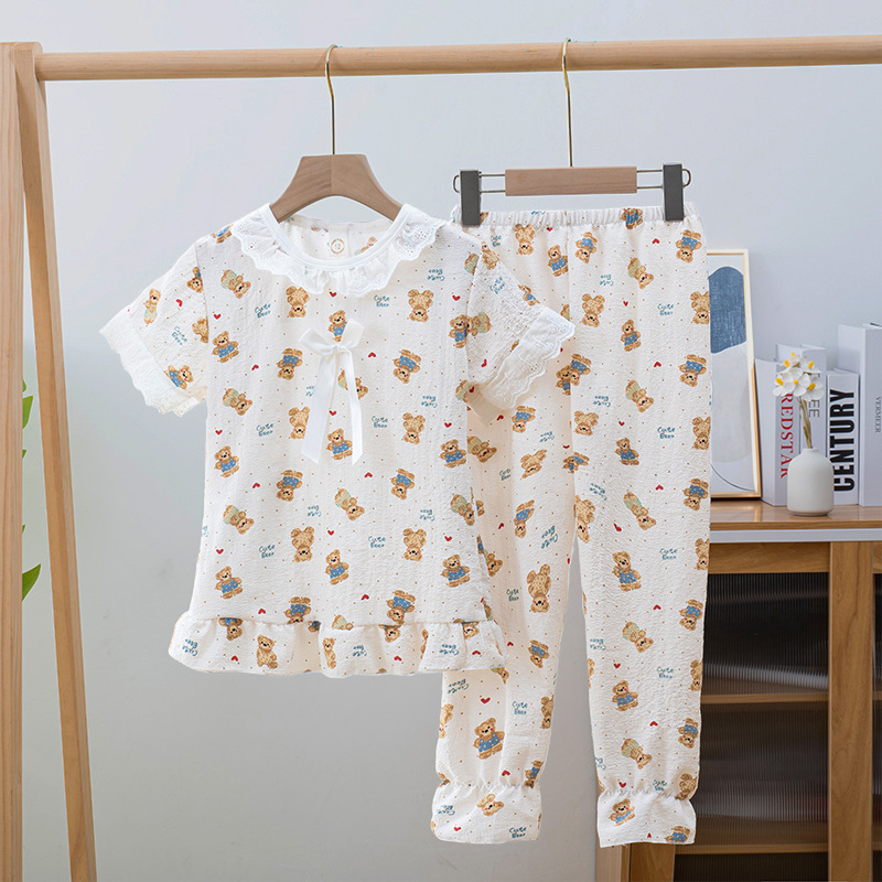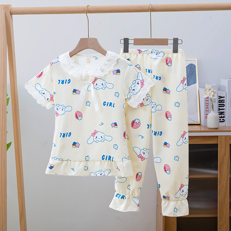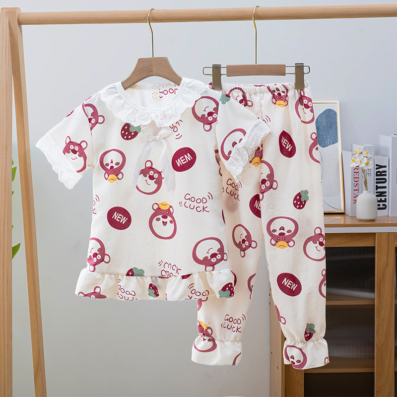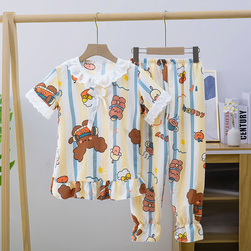 여자 잠옷 새로운 짧은 소매 바지 세트 한국 여자 여름 귀여운 공주 스타일 홈 의류 아동복 도매스토어 가기
