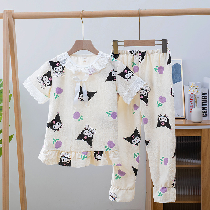 여자 잠옷 새로운 짧은 소매 바지 세트 한국 여자 여름 귀여운 공주 스타일 홈 의류 아동복 도매