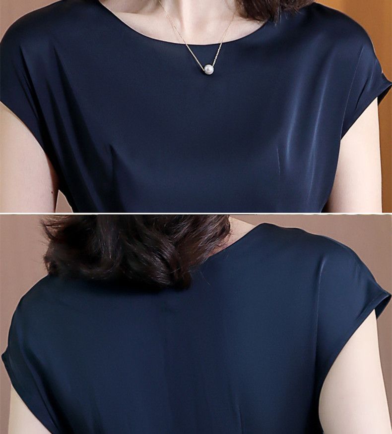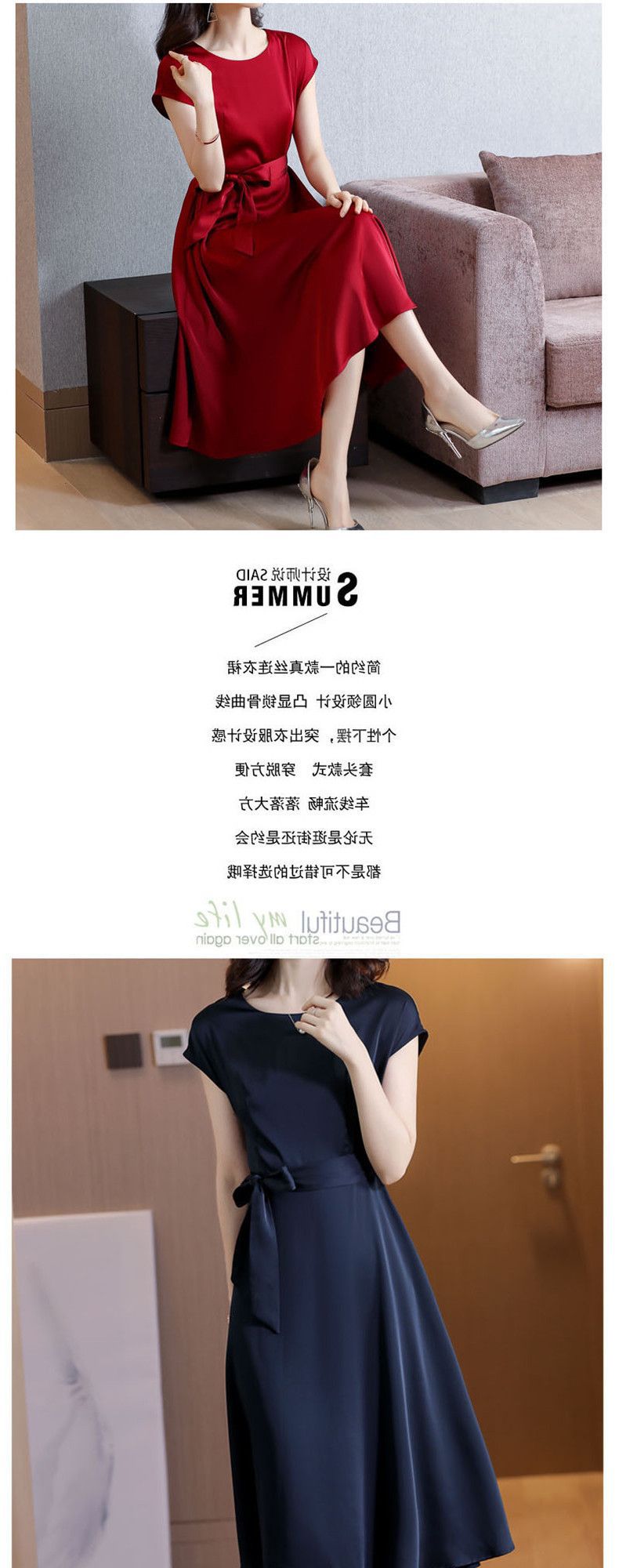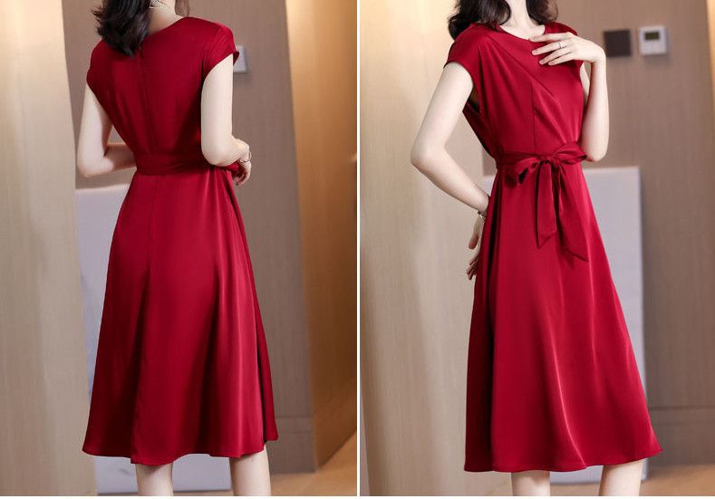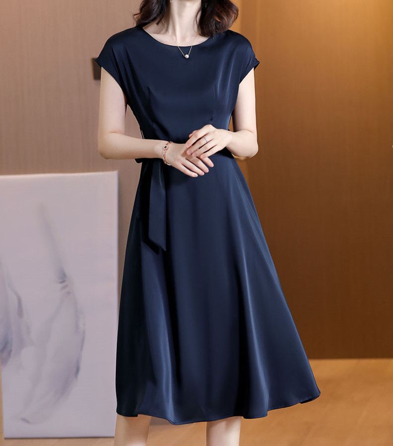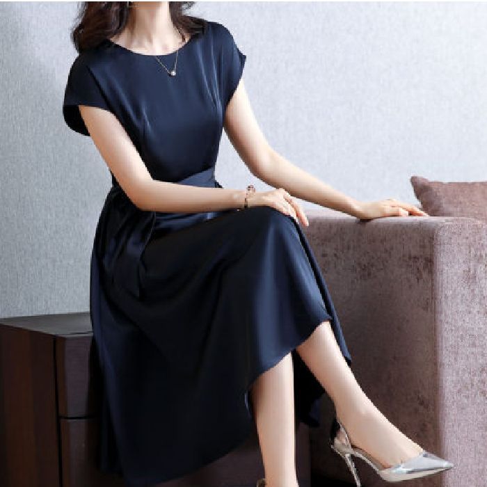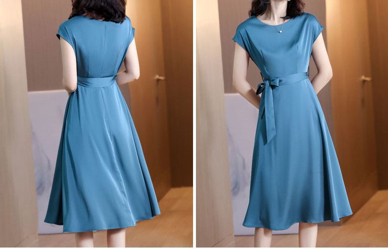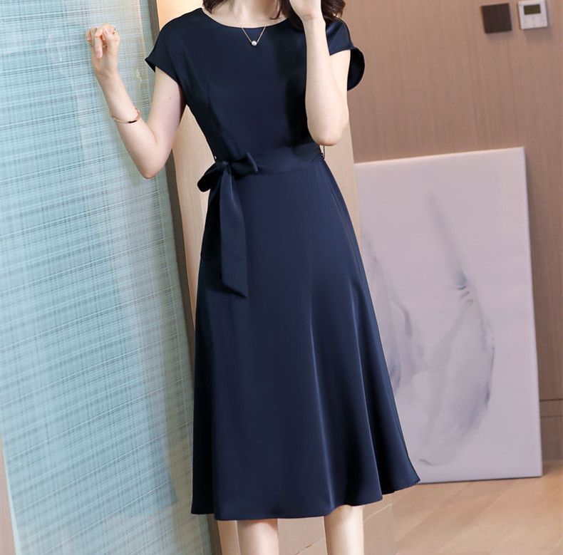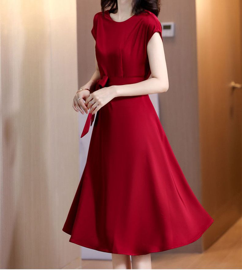 플러스 사이즈 단색 반팔 여성 원피스 여자 2025 년 여름 새로운 슬림핏 슬리밍 어머니의 중간 길이 스커트스토어 가기