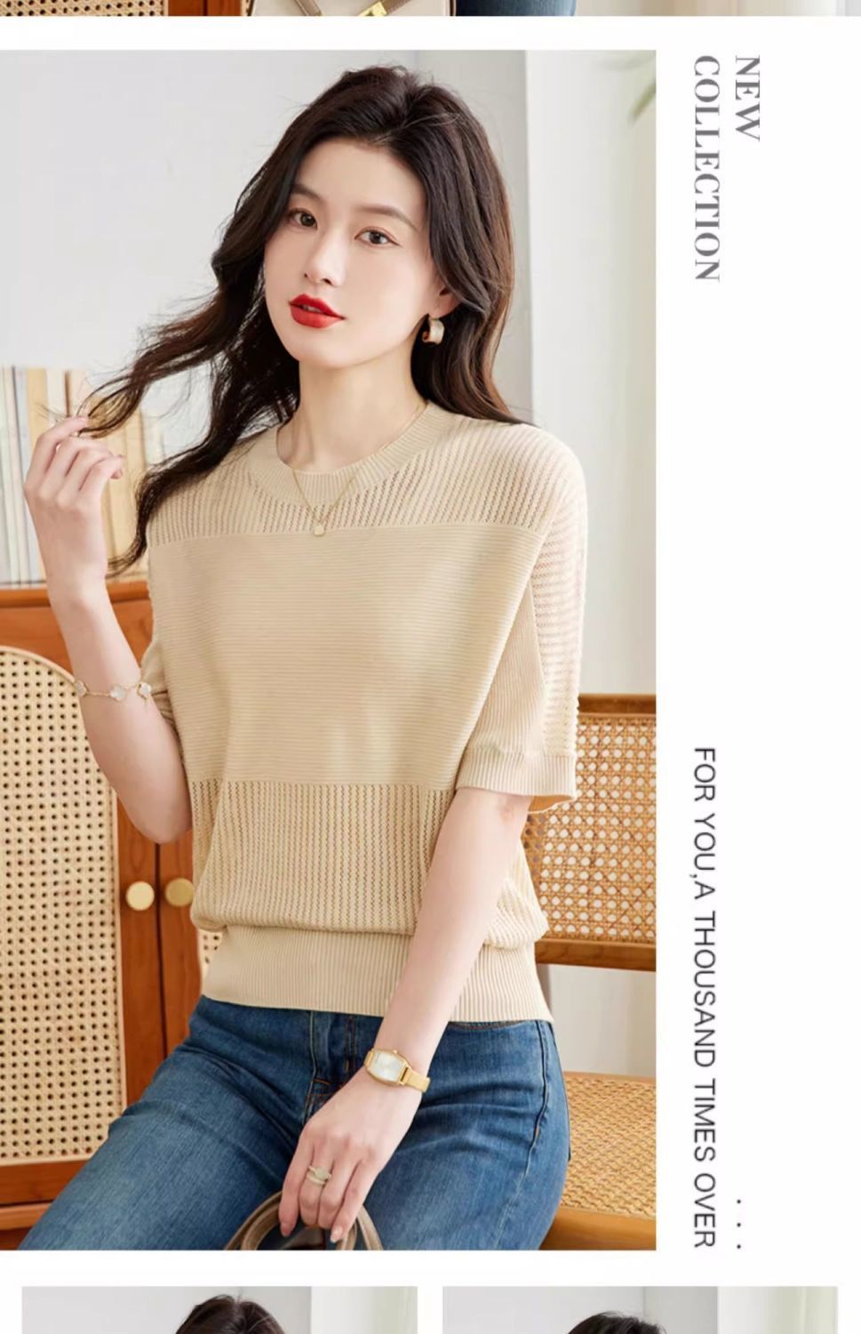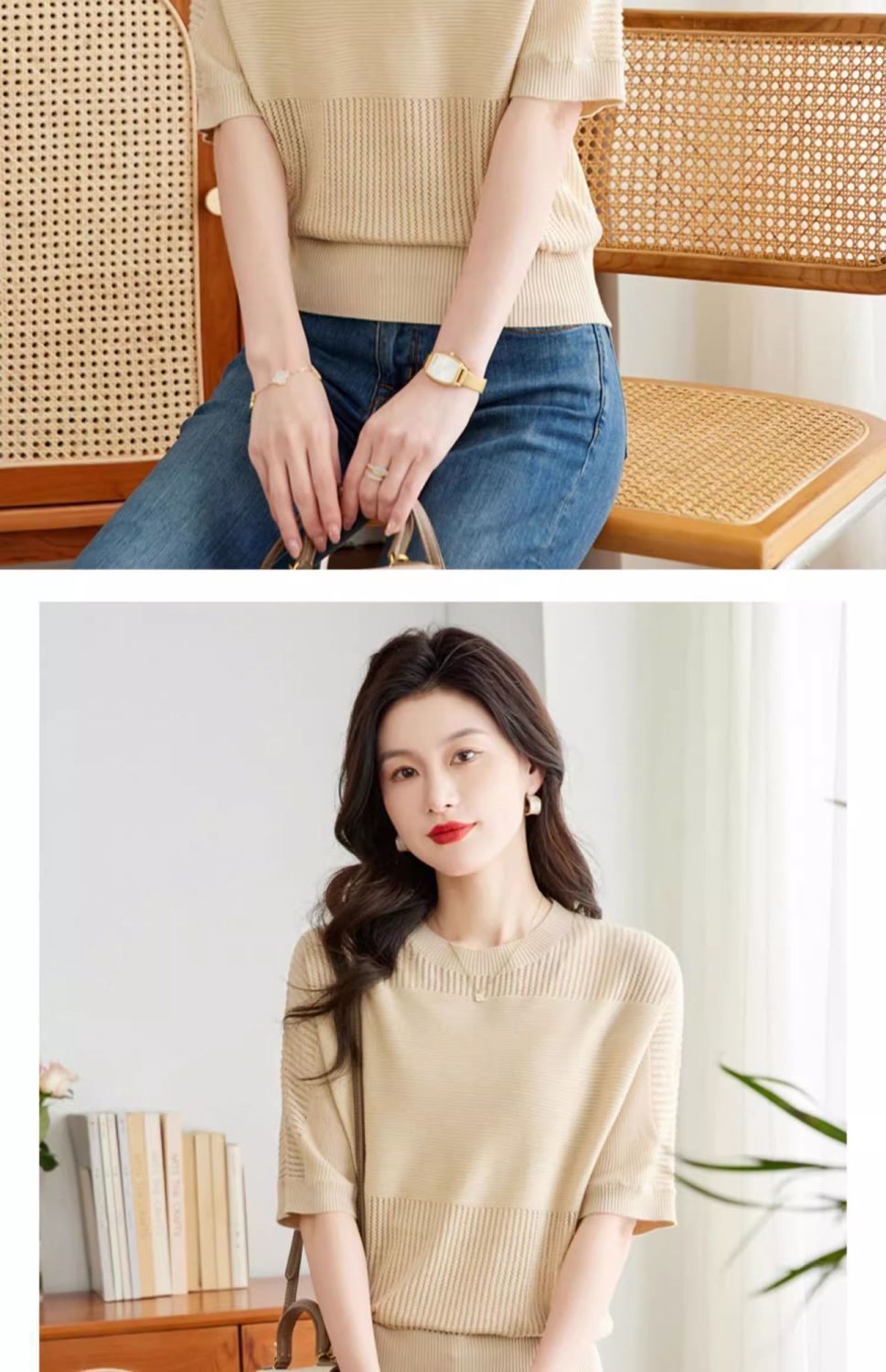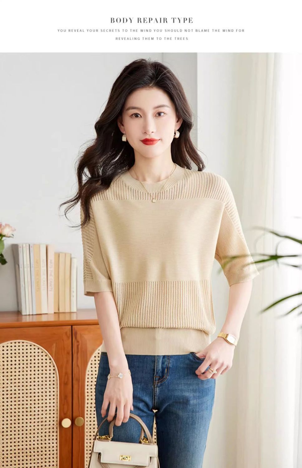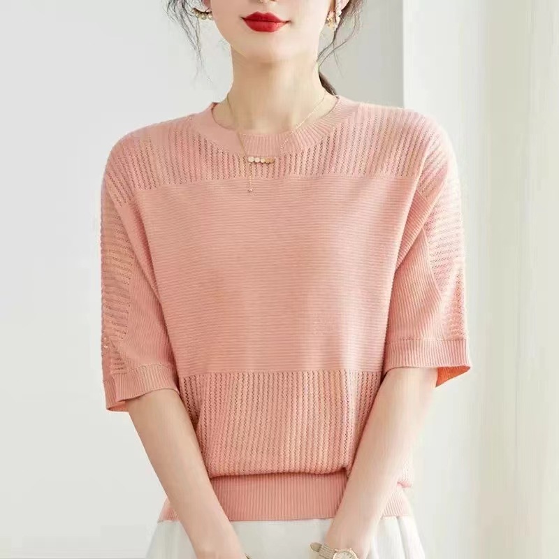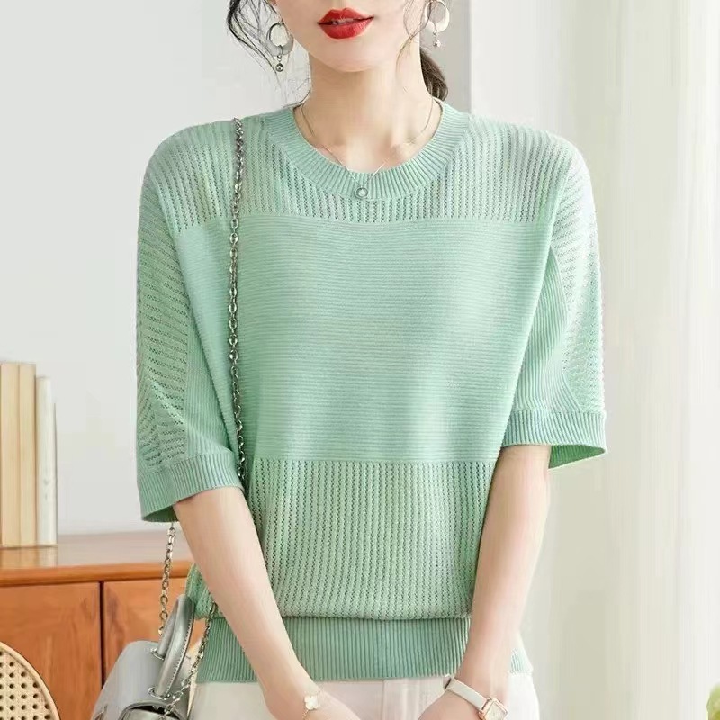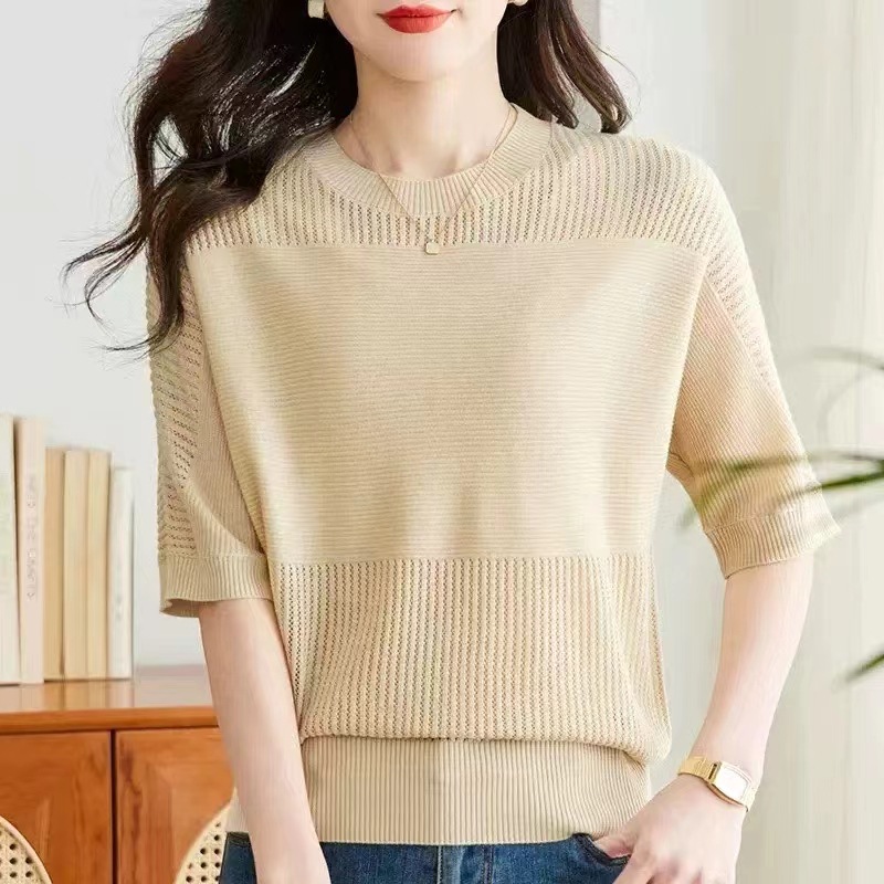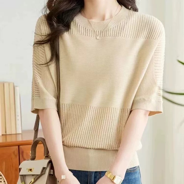 중공 둥근 목 짧은 소매 봄과 여름 2025 새로운 간단한 모든 경기 중간 소매 니트 셔츠 아이스 실크 짧은 최고 배팅 셔츠