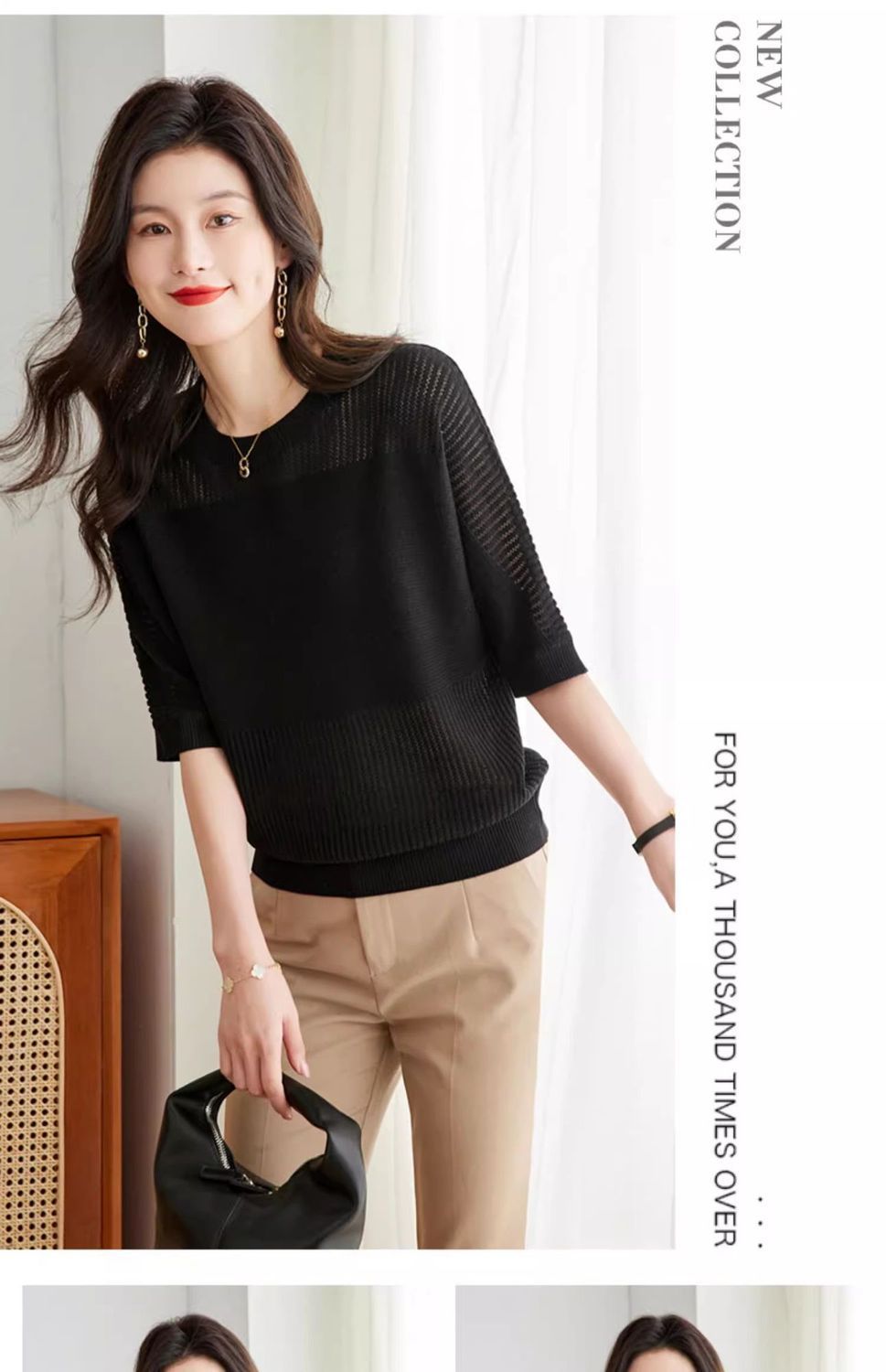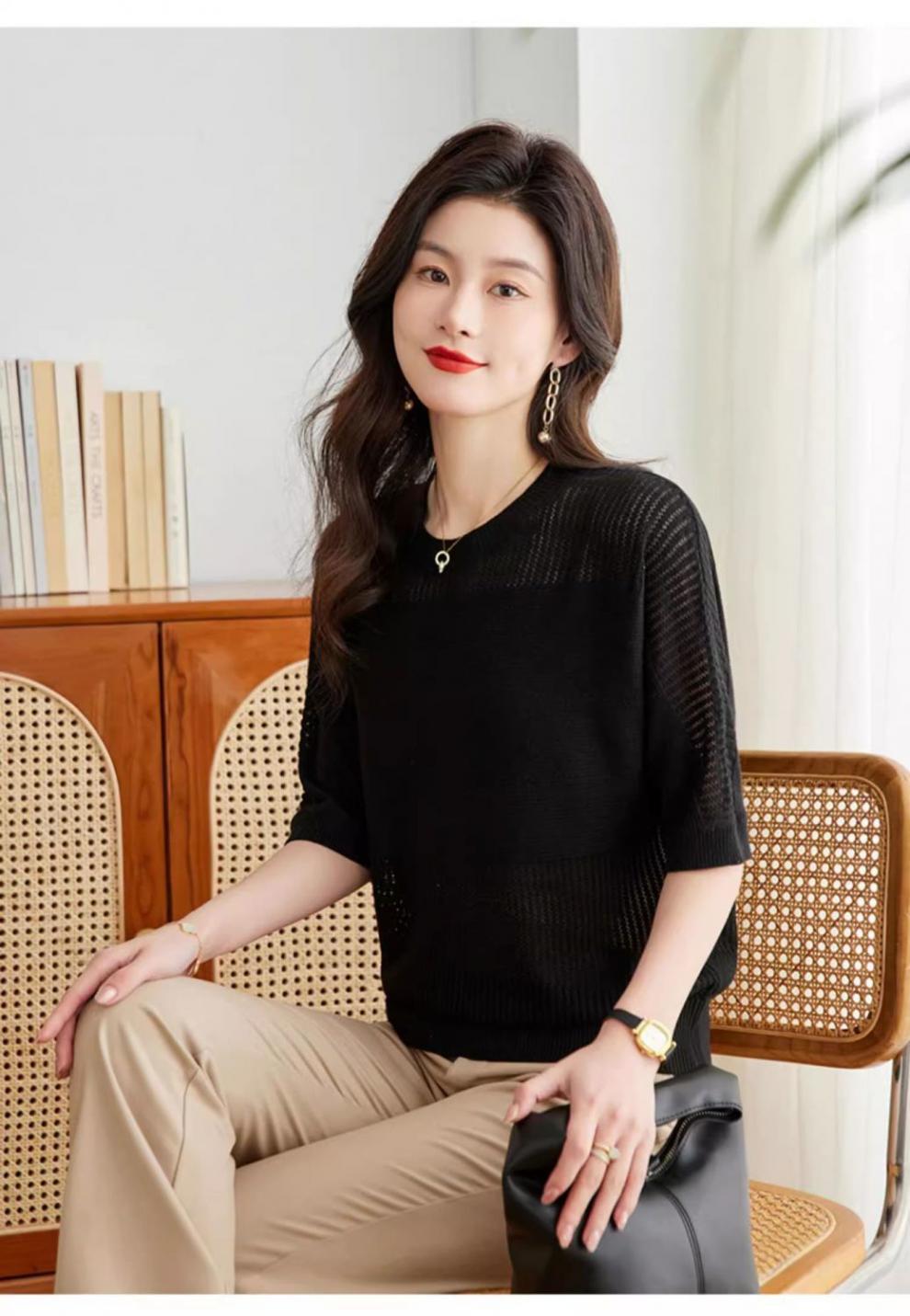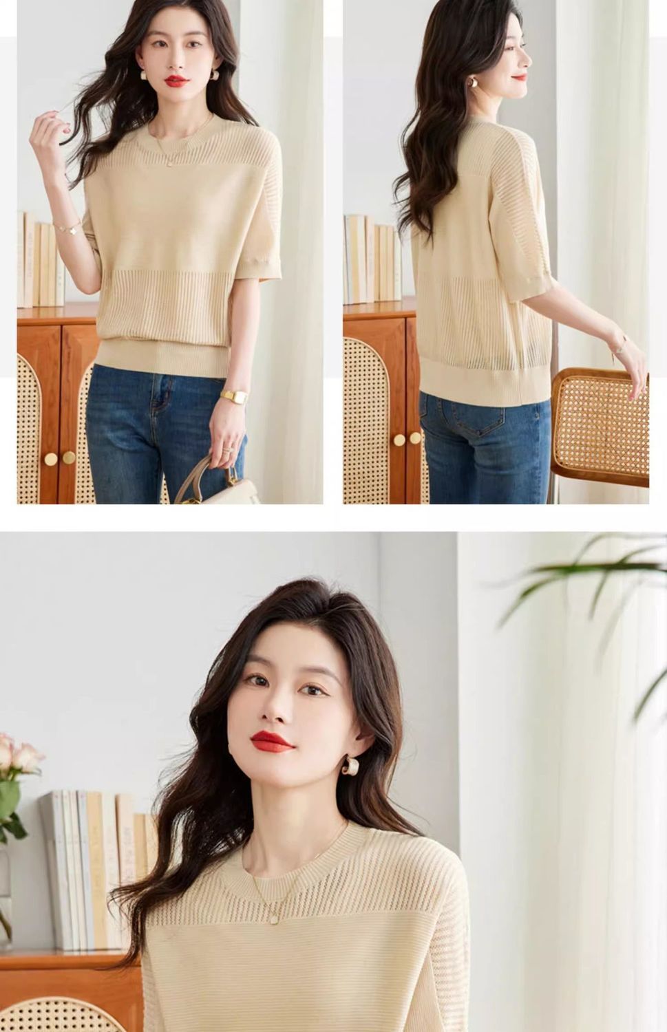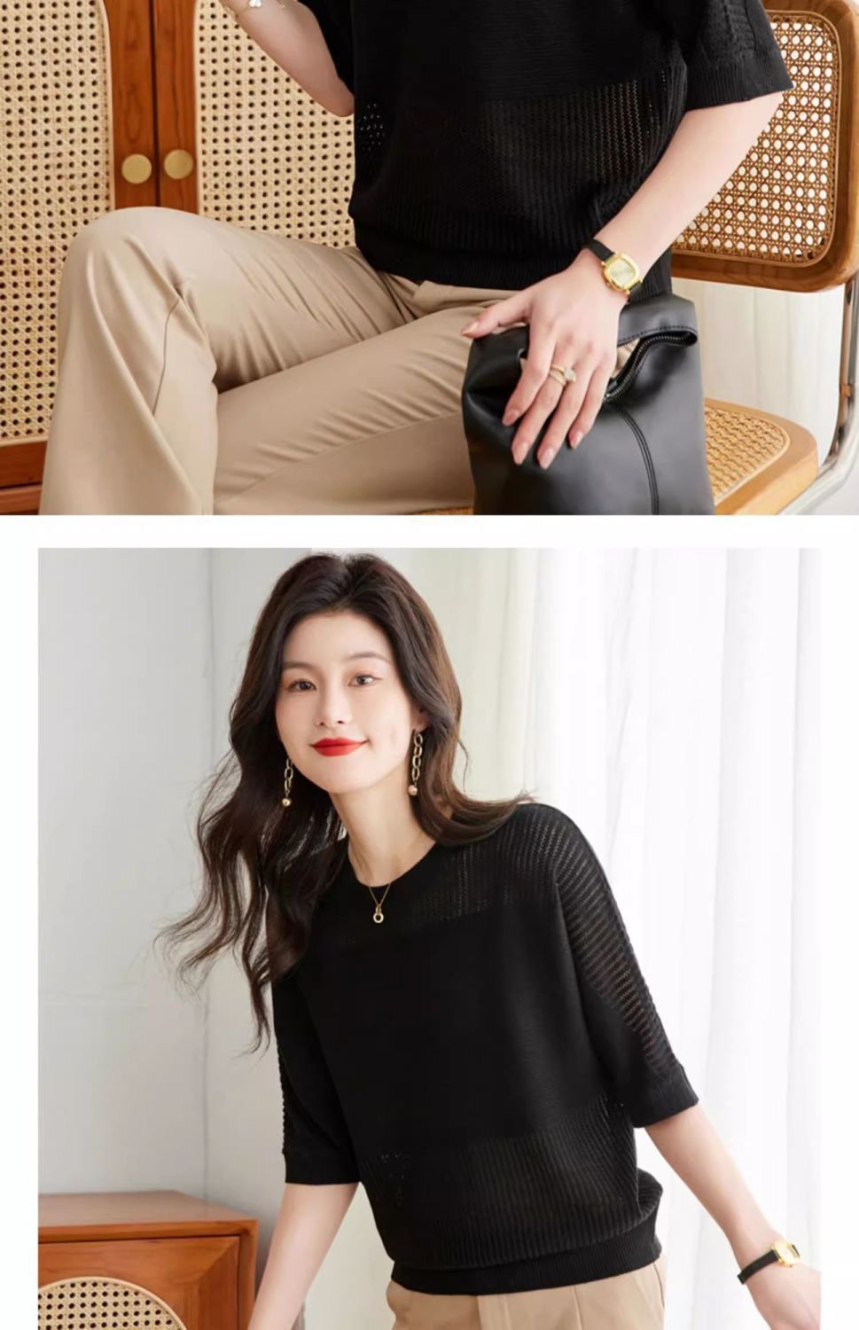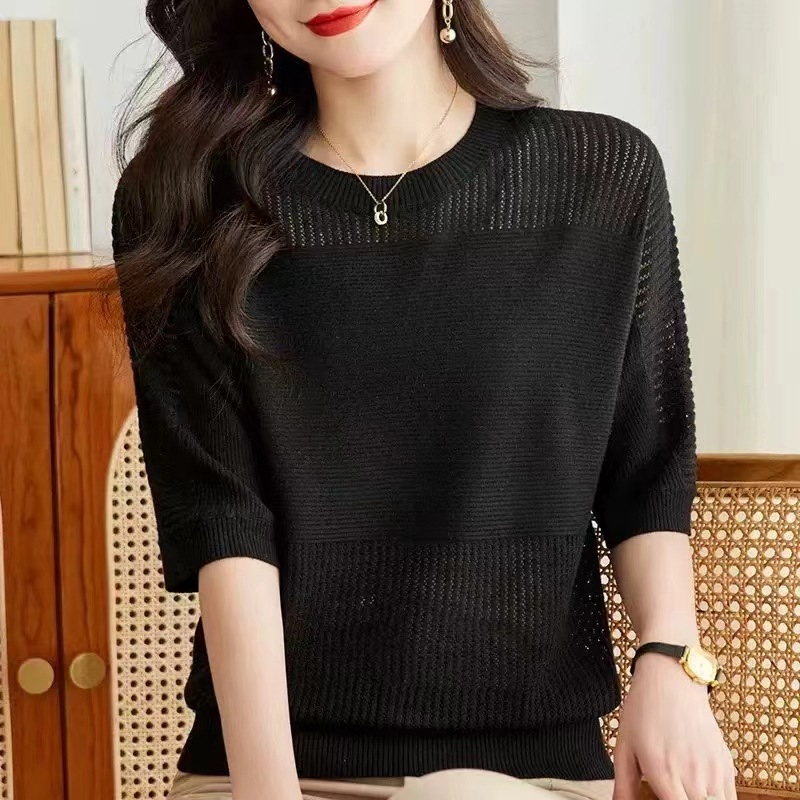 중공 둥근 목 짧은 소매 봄과 여름 2025 새로운 간단한 모든 경기 중간 소매 니트 셔츠 아이스 실크 짧은 최고 배팅 셔츠