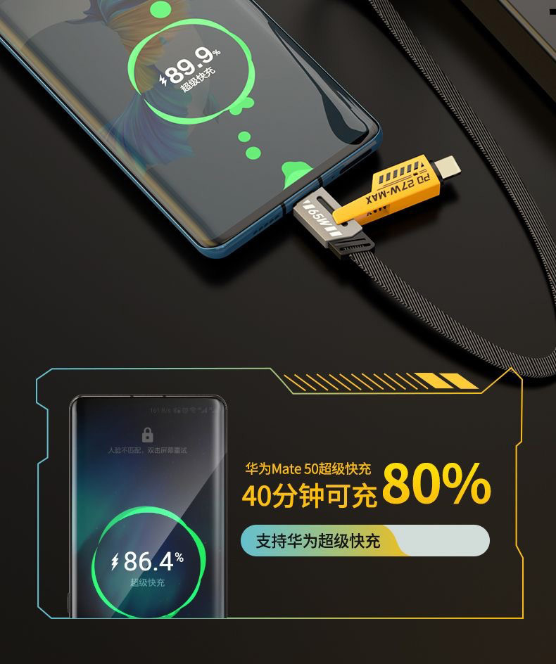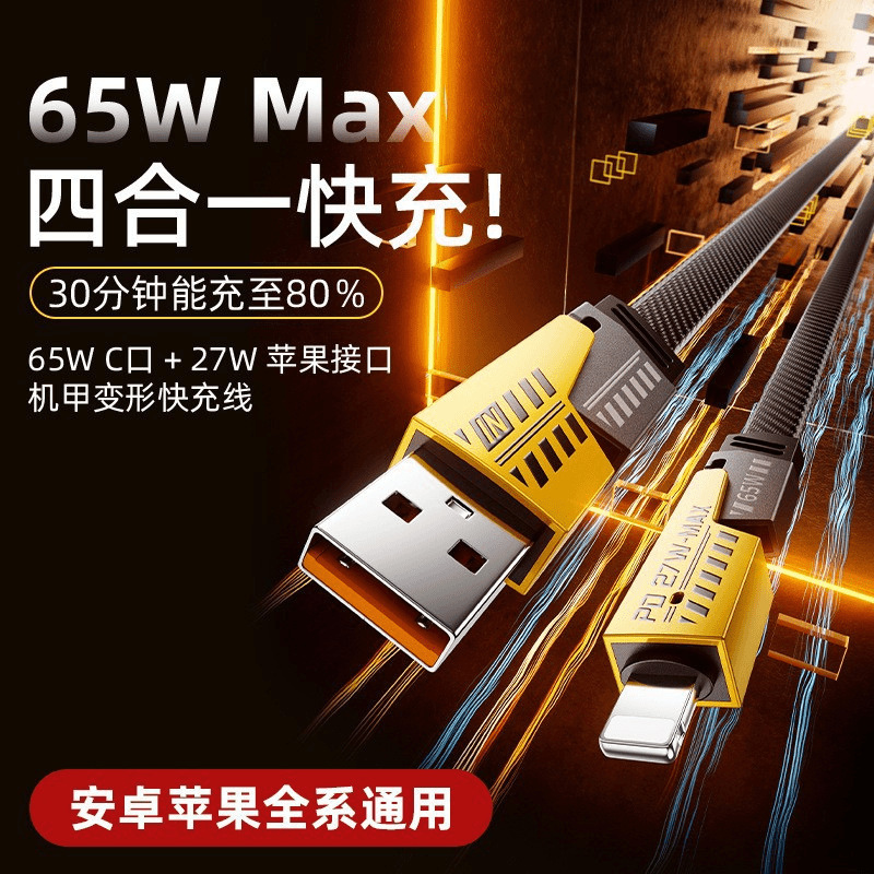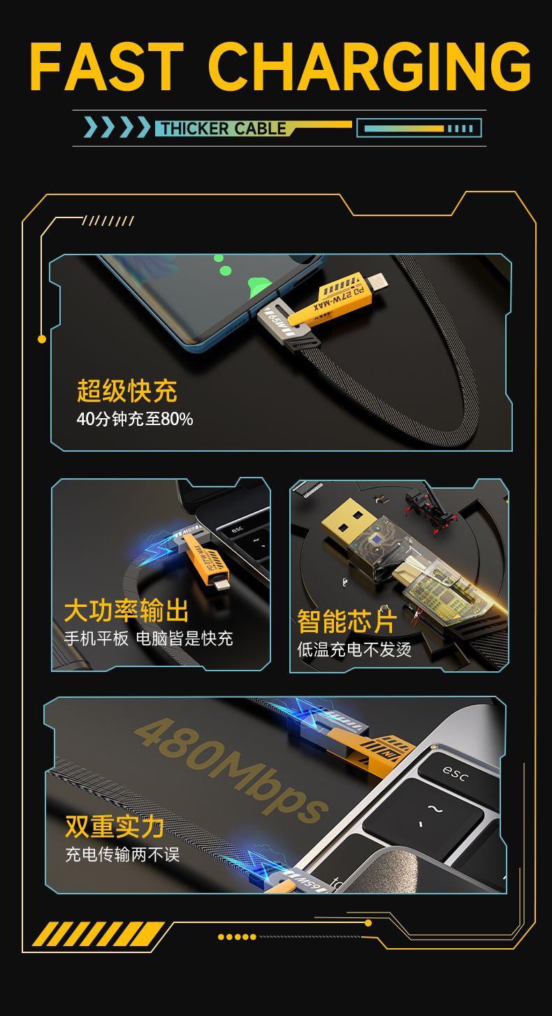 【产品亮点】:一线二头设计,硅胶加粗手感更好,耐拉伸,防缠绕,智能涓流,Type-c接口支持数据传输,支持苹果15手机,部分笔记电脑,平板电脑充电