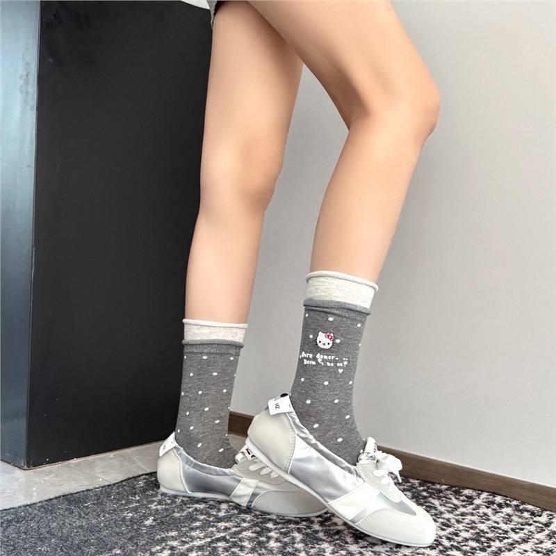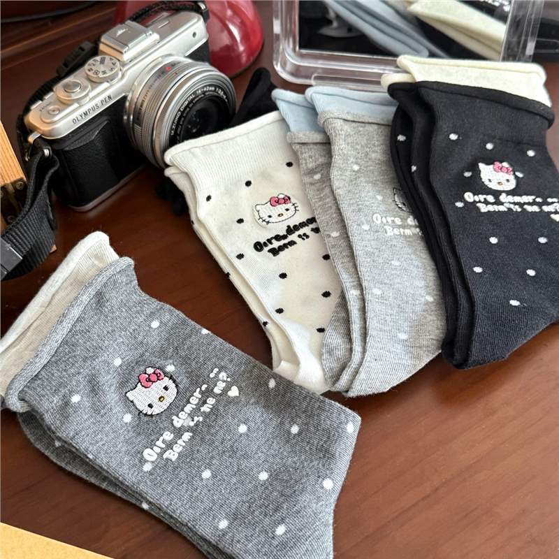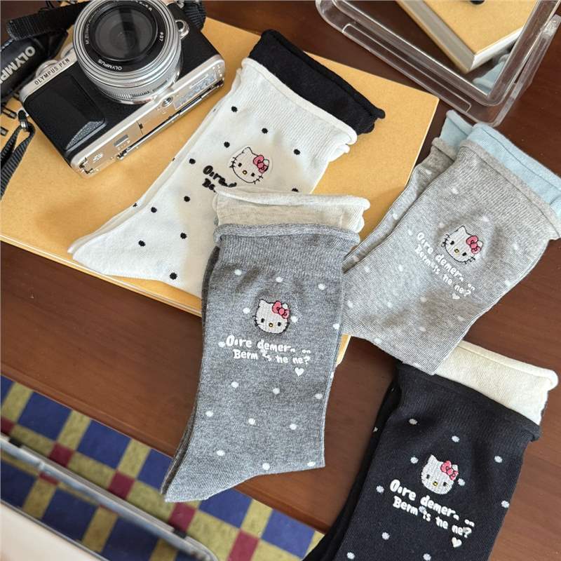 봄과 여름 새로운 만화 KT 고양이 폴카 도트 여성용 양말 달콤하고 귀여운 대비 더블 Luokou 미드 튜브 양말 스타일리스트 편지스토어 가기