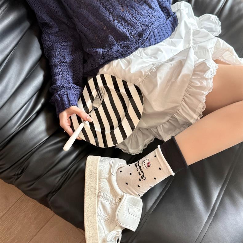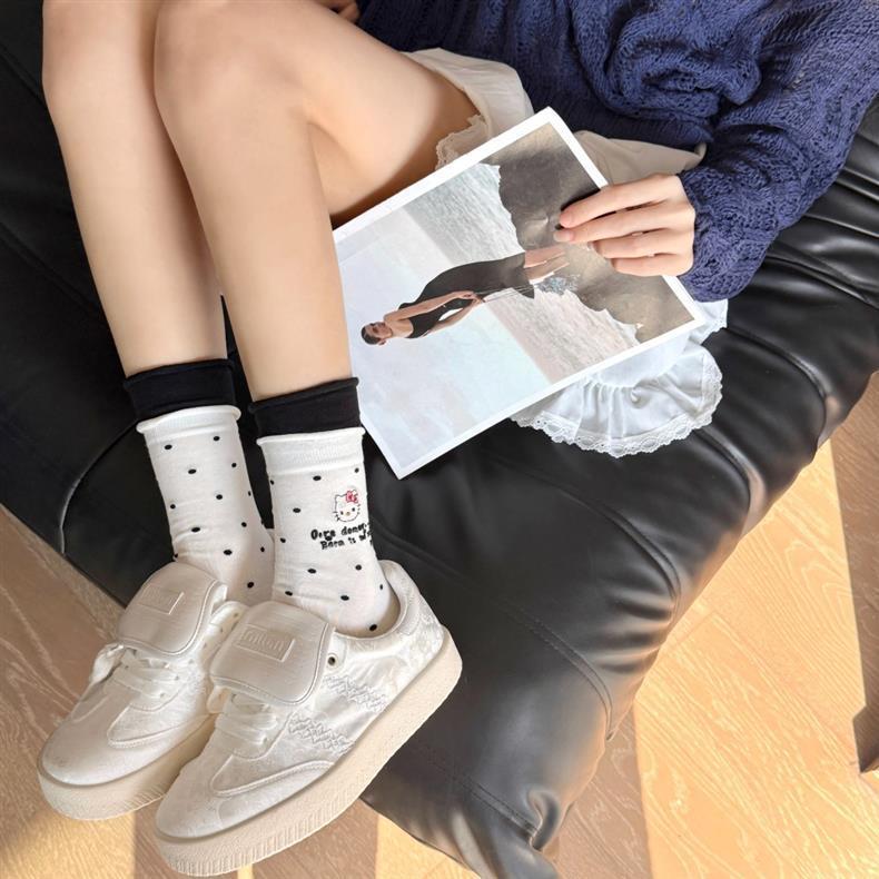 봄과 여름 새로운 만화 KT 고양이 폴카 도트 여성용 양말 달콤하고 귀여운 대비 더블 Luokou 미드 튜브 양말 스타일리스트 편지