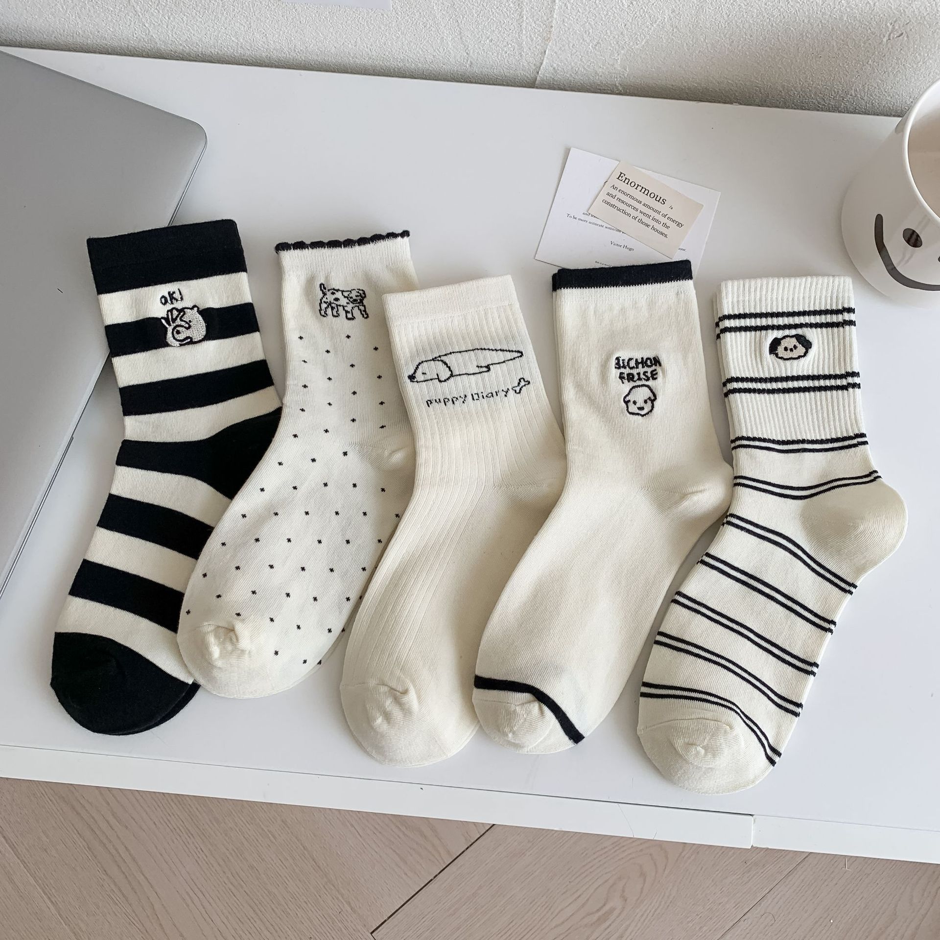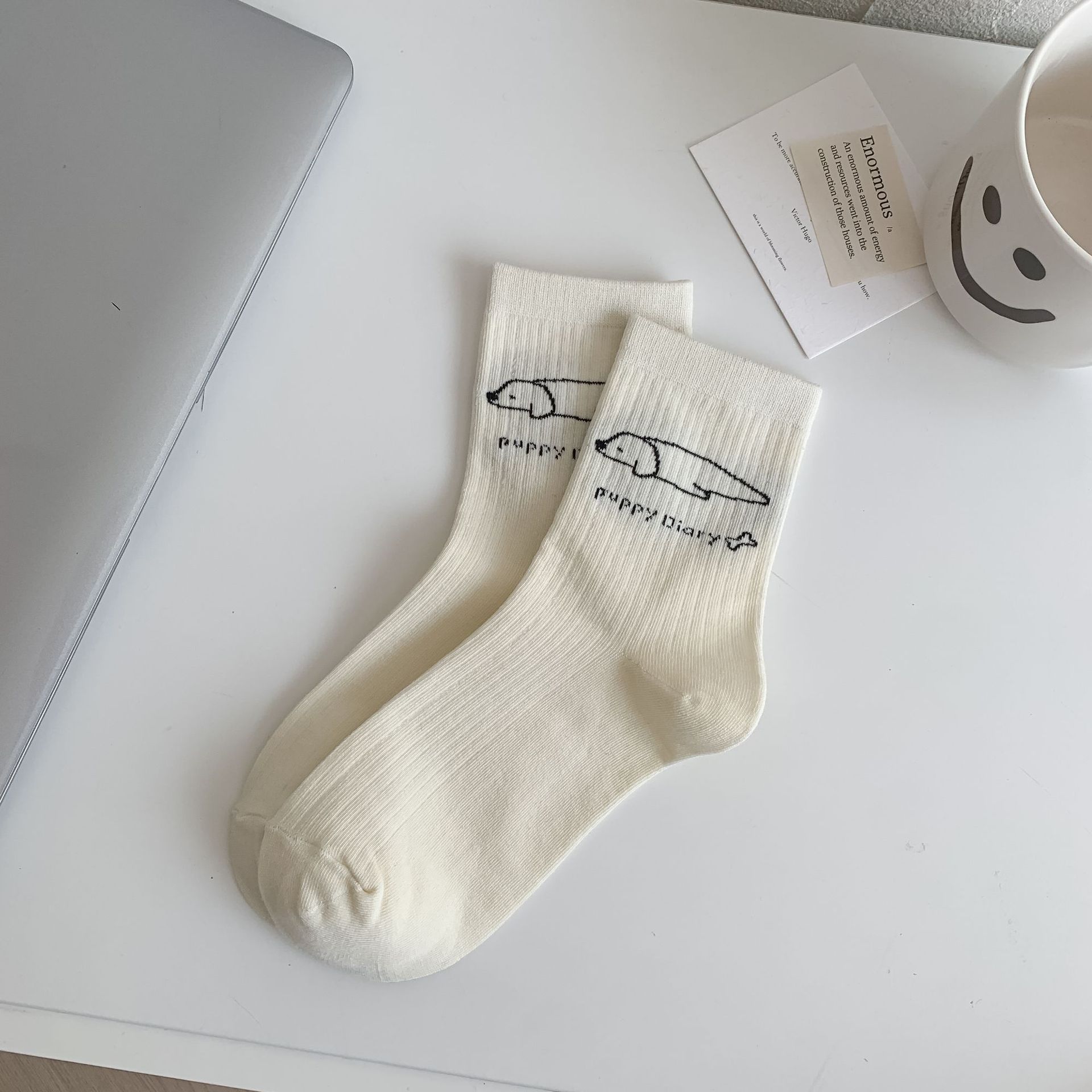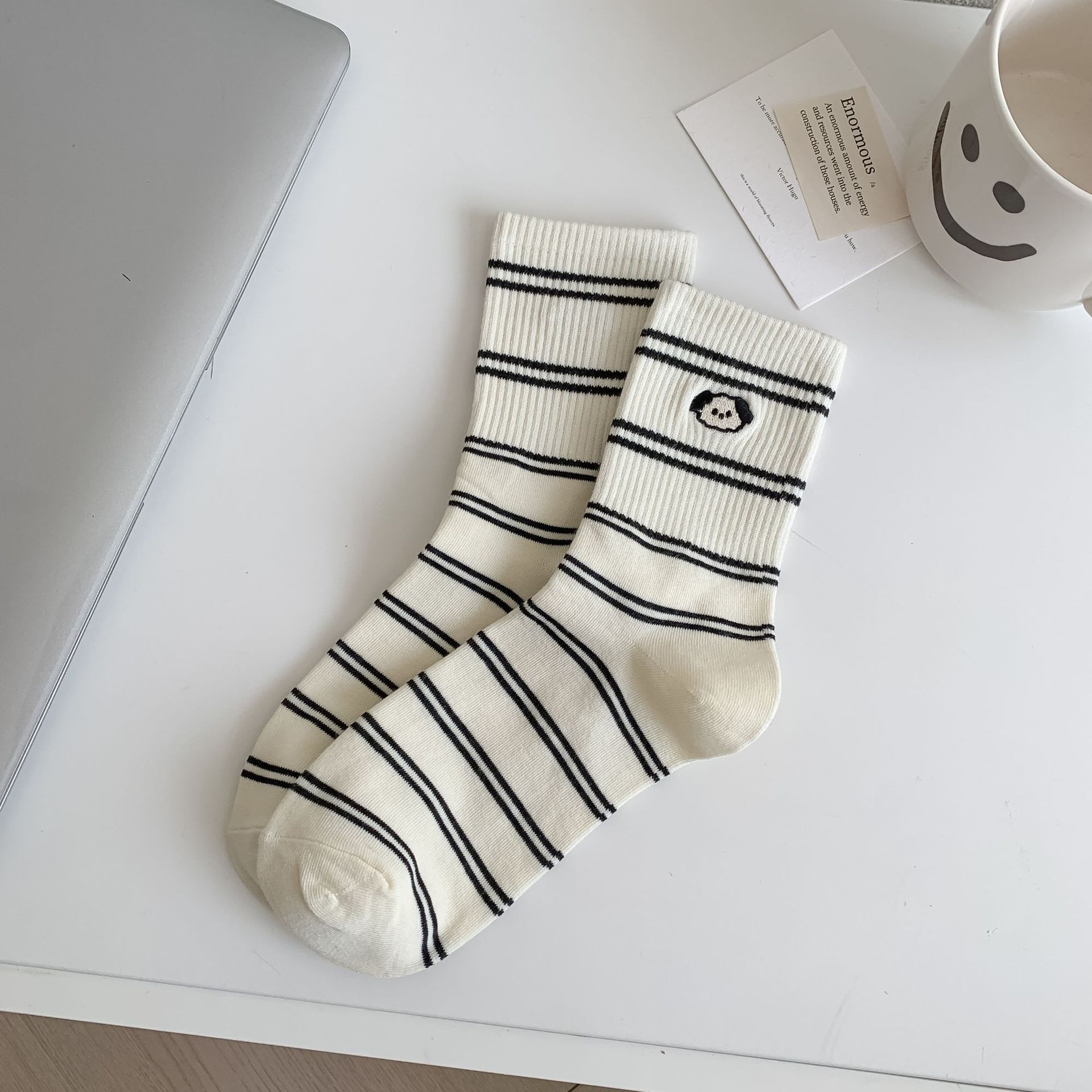 줄무늬 만화 강아지 양말 여성용 중간 길이 양말 인스 트렌드 봄 가을 스타일 무봉제 일본식 귀여운 스포츠 겨울 긴 양말