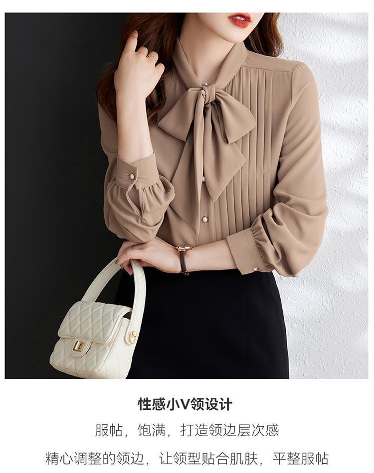 라이트 브라운 레이스 업 쉬폰 긴팔 셔츠 여성용 활 칼라 불규칙한 디자인 2025 새로운 스타일 패션스토어 가기