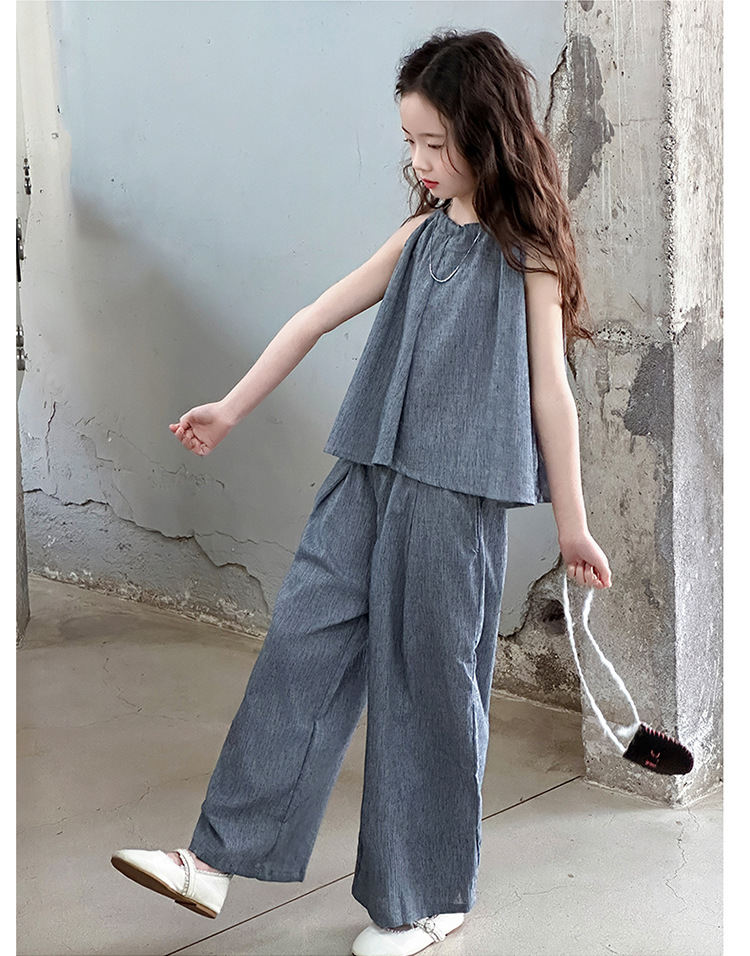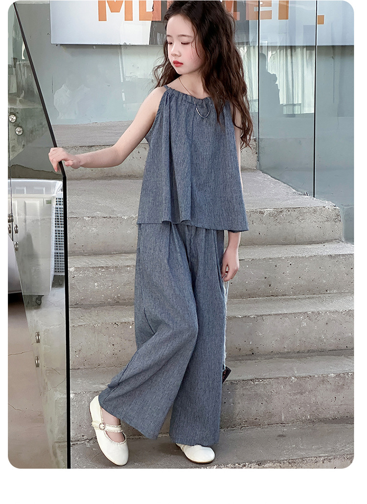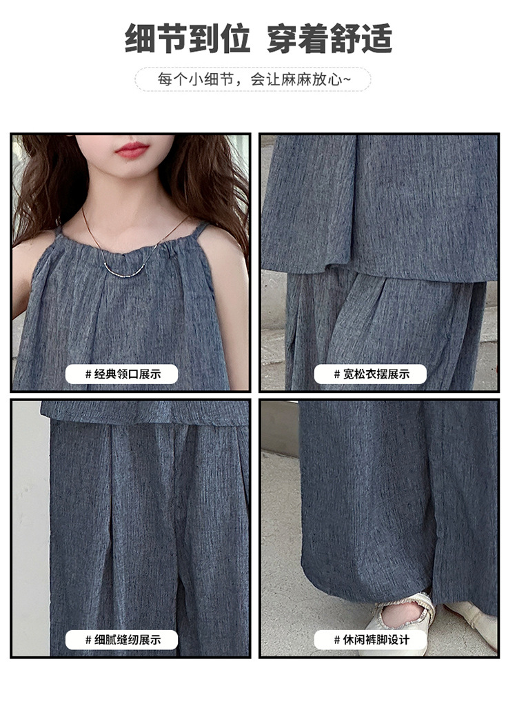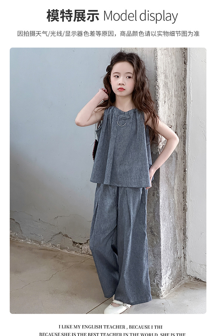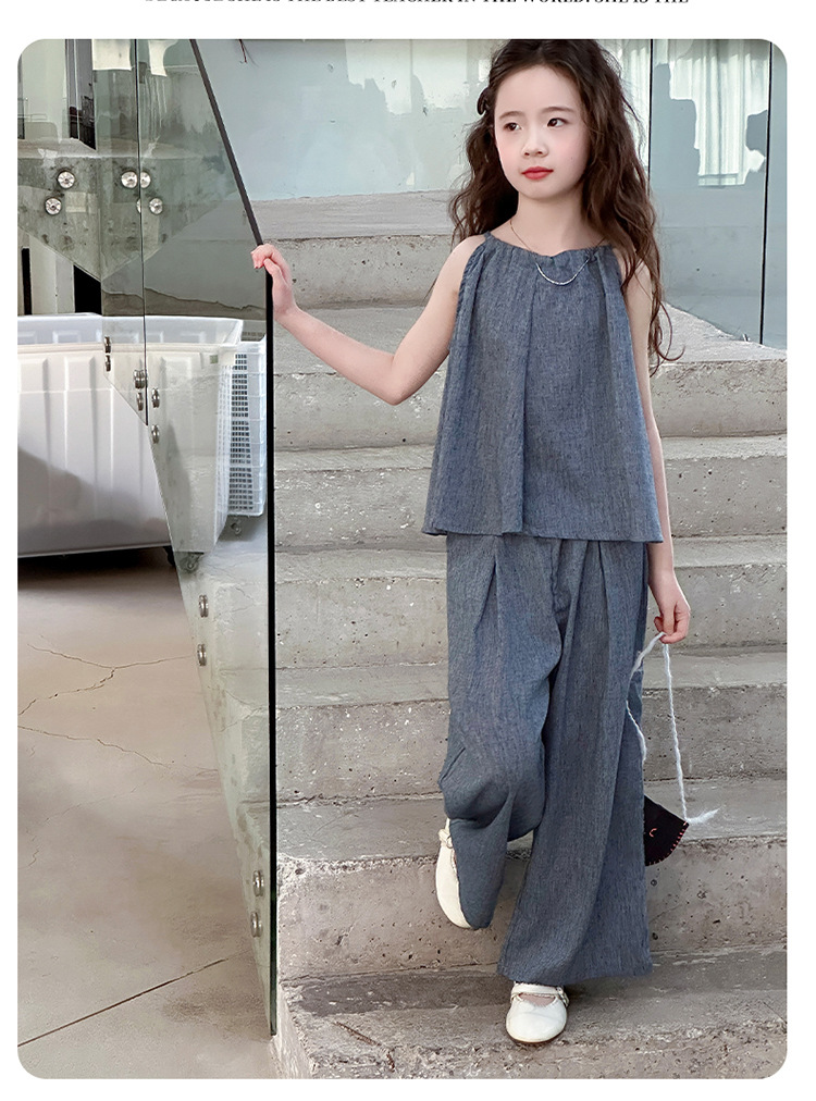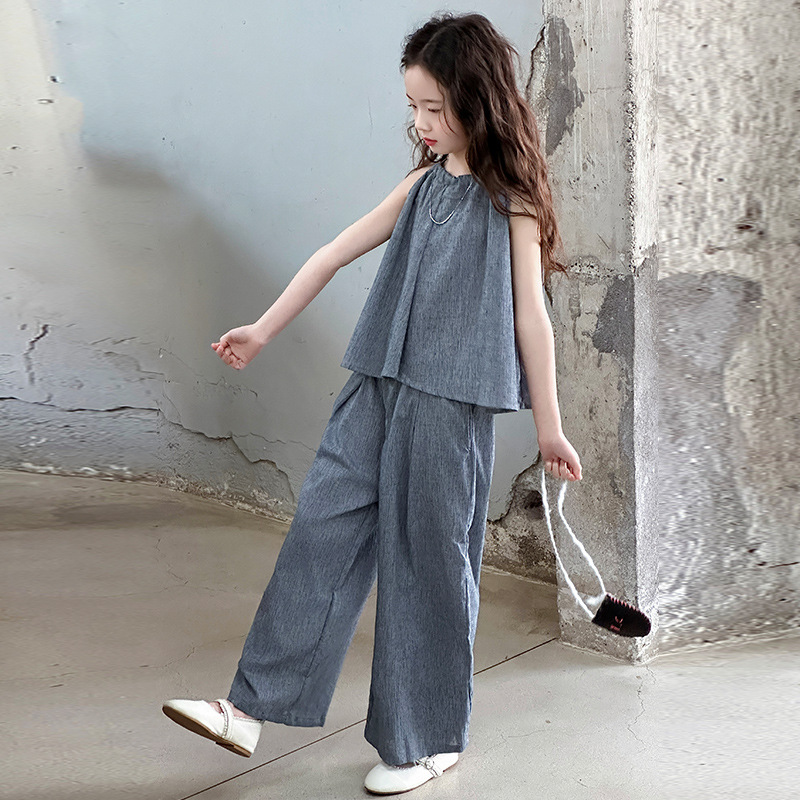 소녀 여름 대마 면화 세트 2025 새로운 한국 스타일 중대형 어린이 캐주얼 민소매 넓은 다리 바지 투피스 트렌디스토어 가기