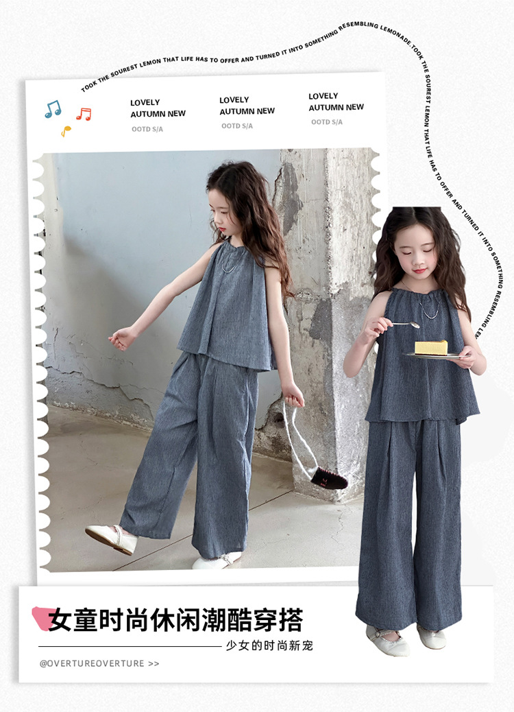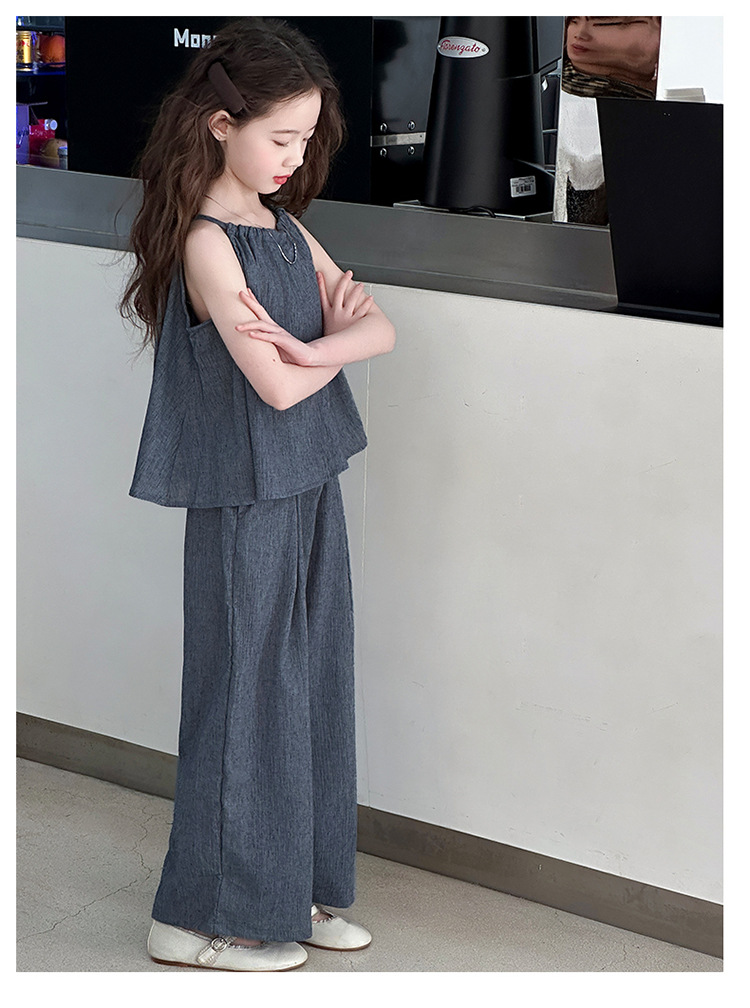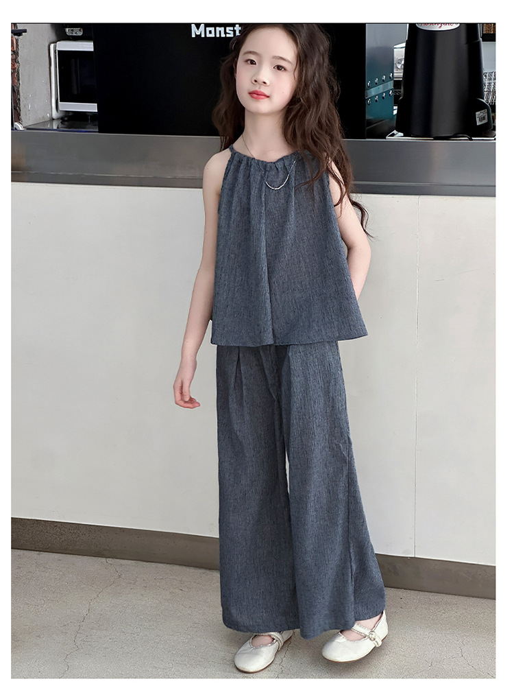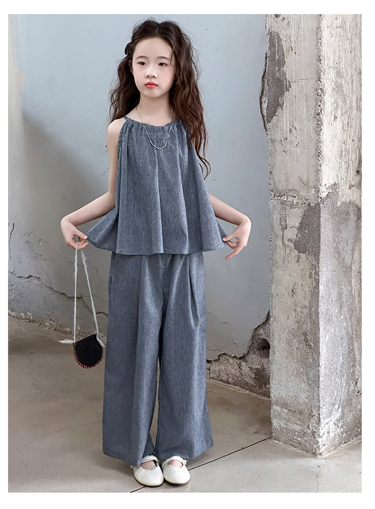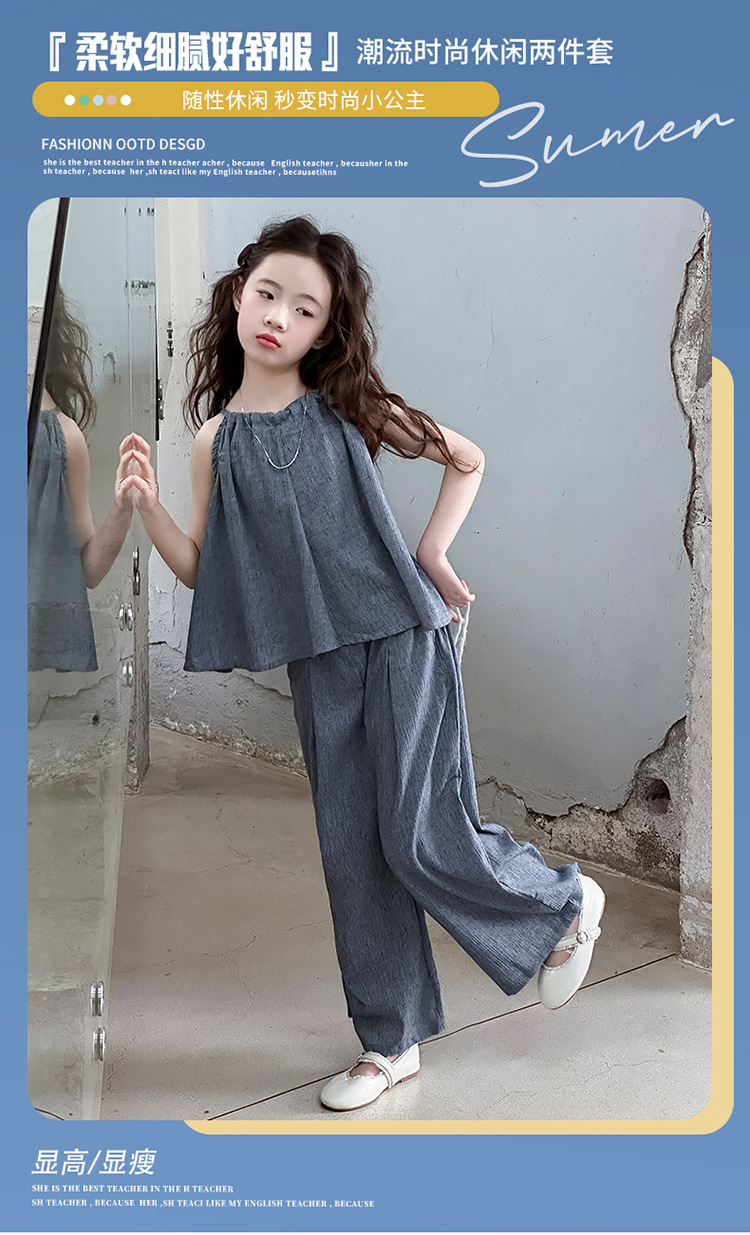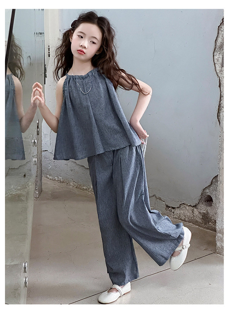 소녀 여름 대마 면화 세트 2025 새로운 한국 스타일 중대형 어린이 캐주얼 민소매 넓은 다리 바지 투피스 트렌디스토어 가기