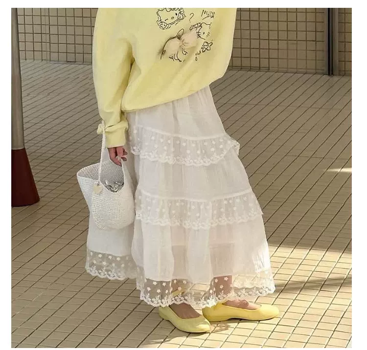리틀 레드 피쉬 여아 스커트 봄 가을 2026 신상 한국 스타일 여아 레이스 스플라이싱 화이트 공주 스커트