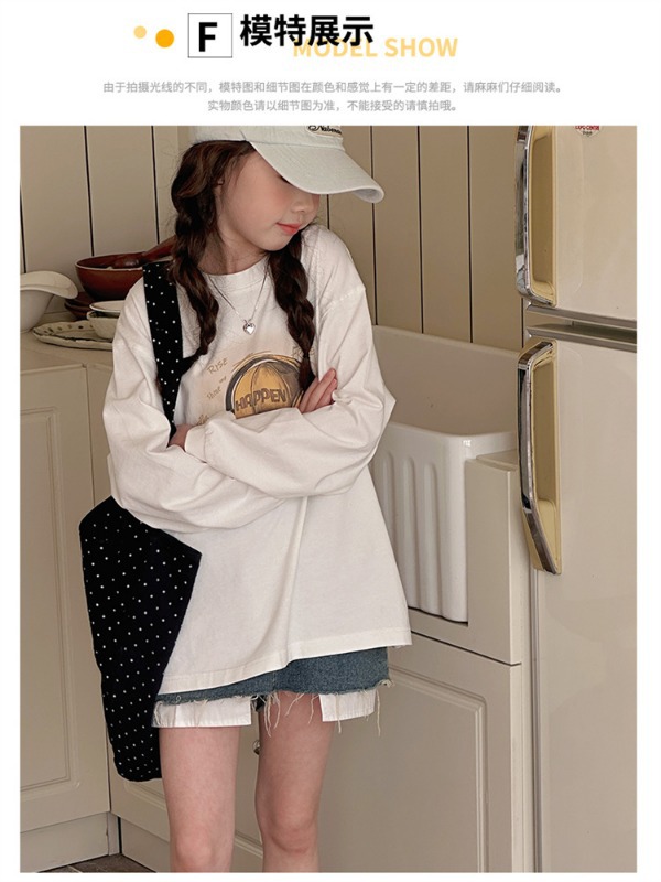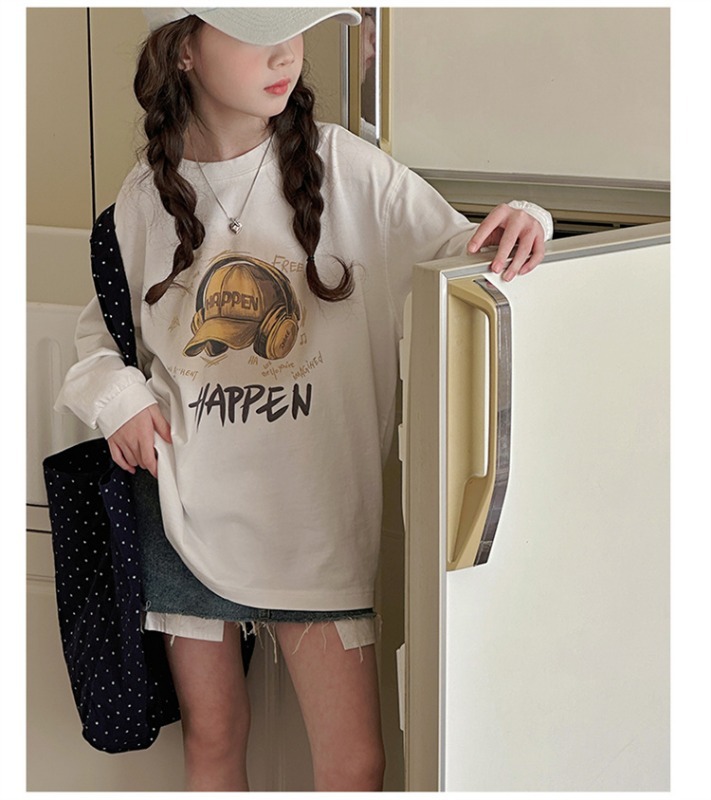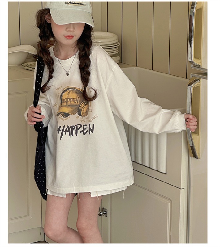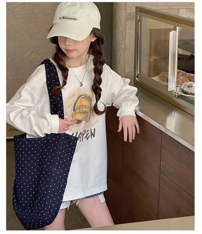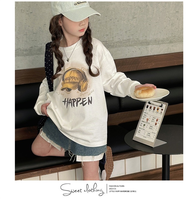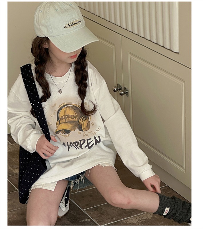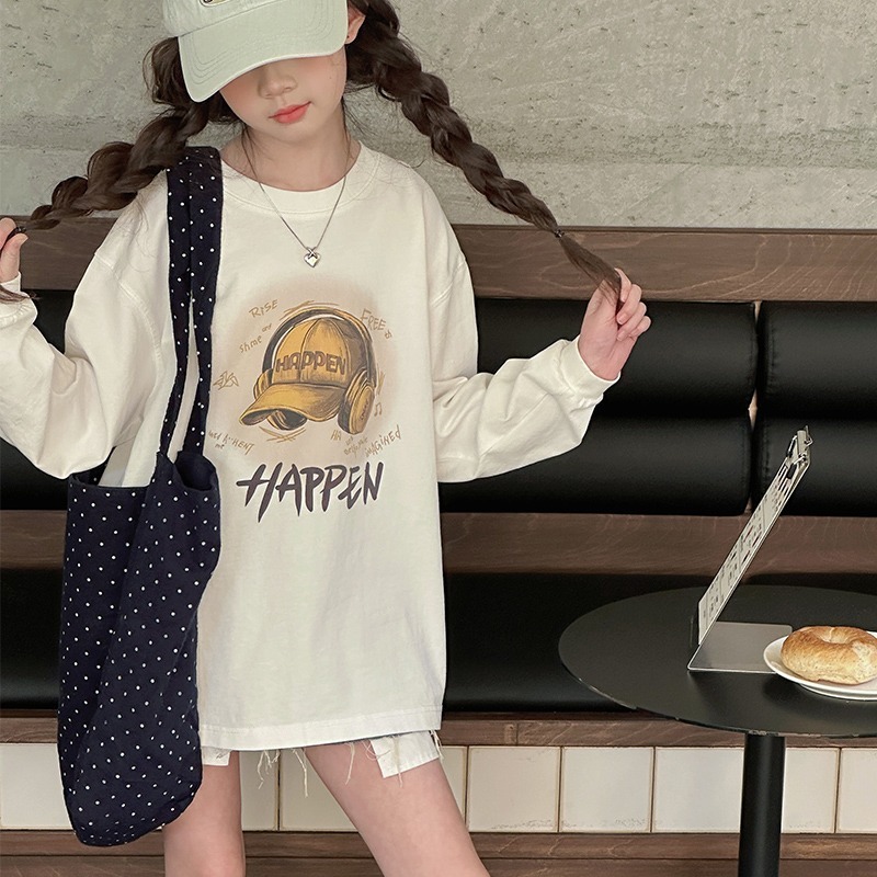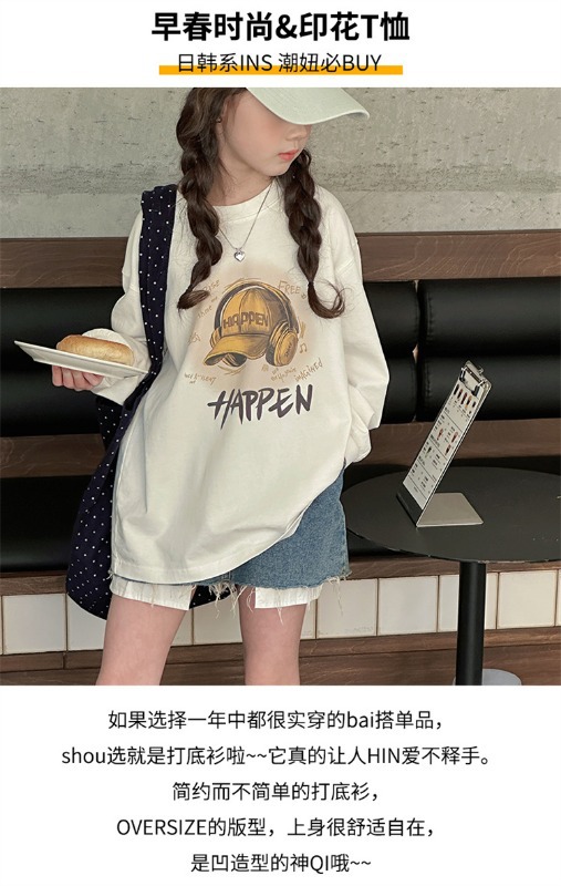 어린이 의류 소녀 2025 봄 새 소녀 긴팔 면화 티셔츠 한국 둥근 목 캐주얼 큰 어린이 올 매치스토어 가기