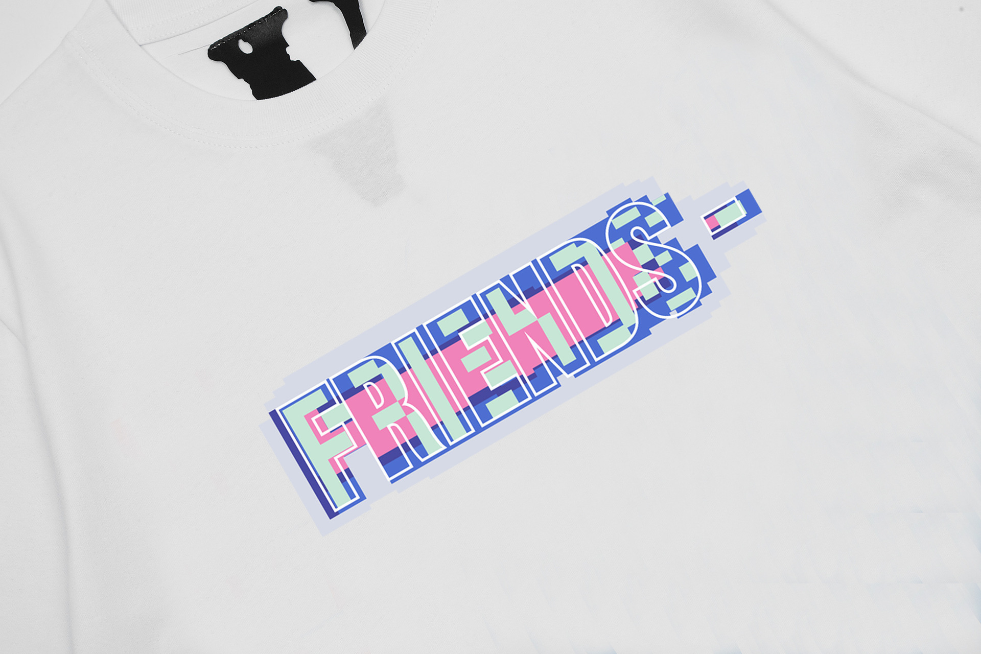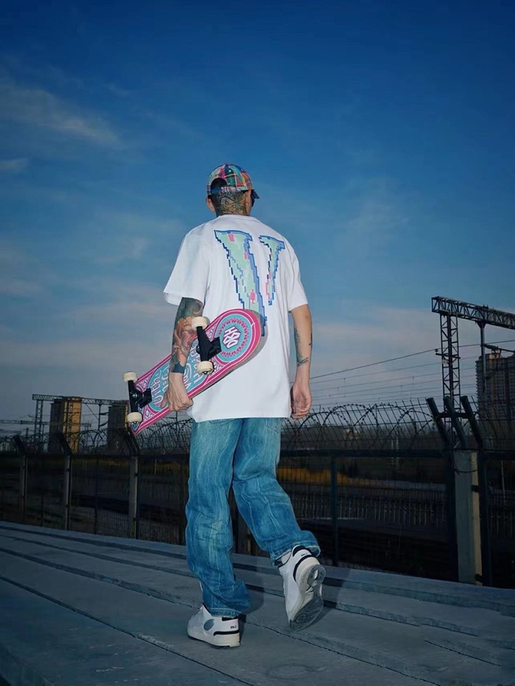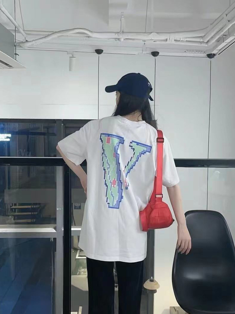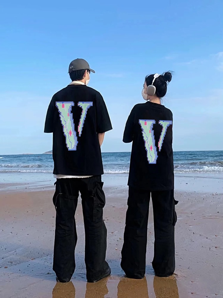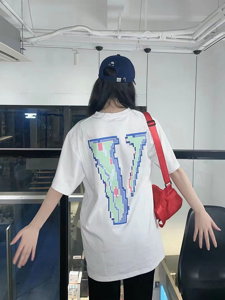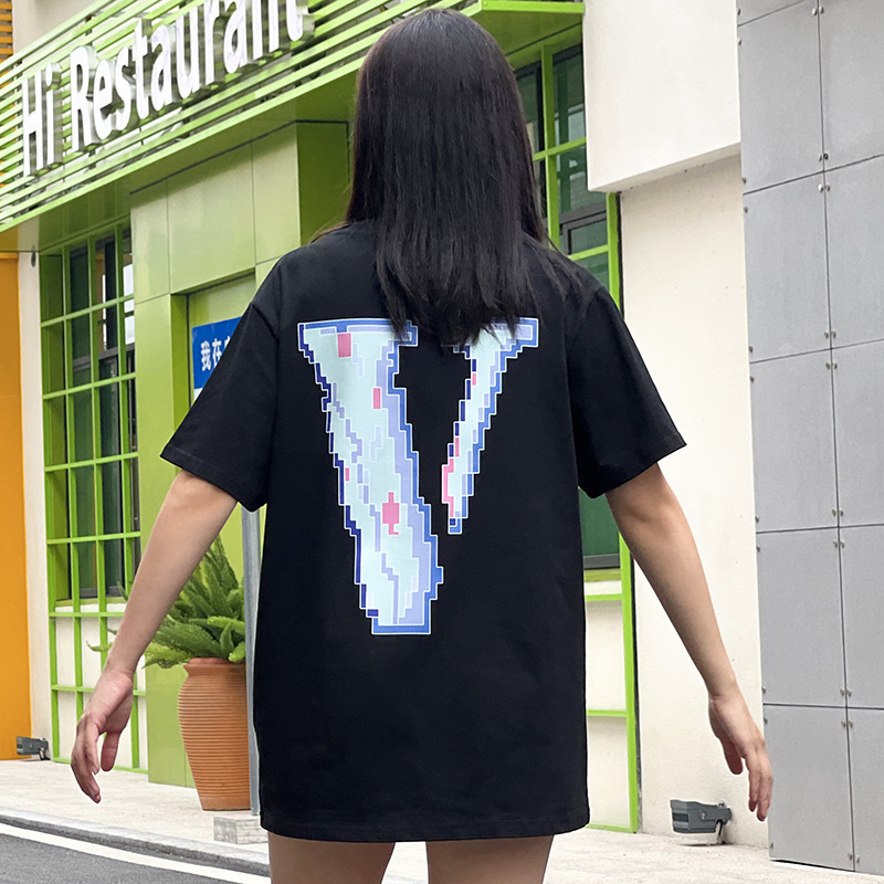 VLONE 새로운 픽셀 스타일 모자이크 반팔 순면 루즈 티셔츠 빅 V 남성과 여성 스타 같은 스타일 아름다운 트렌디 하이 스트리트스토어 가기