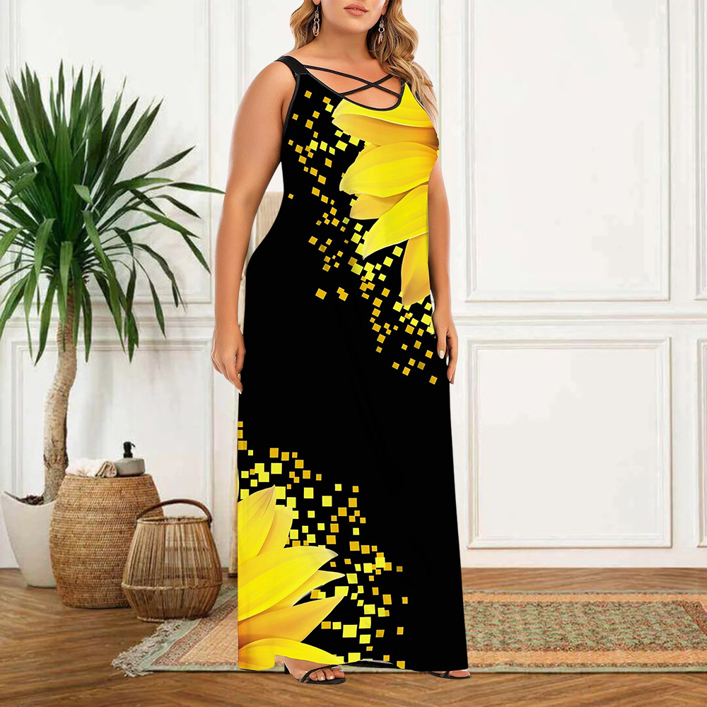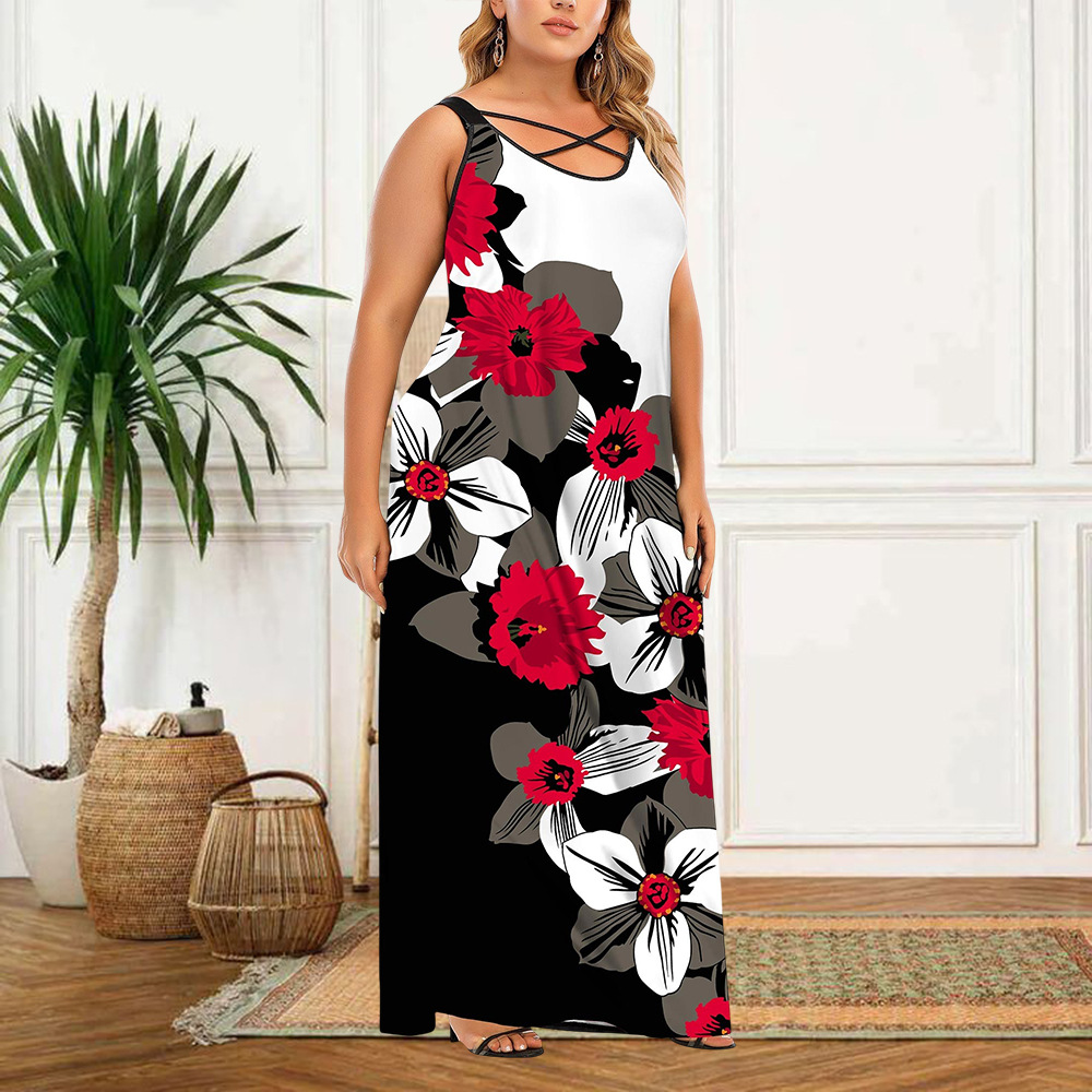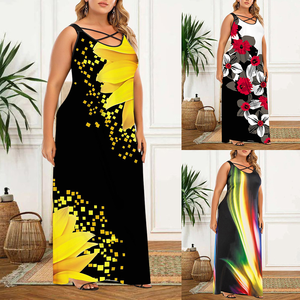 2025 새로운 유럽과 미국의 국경 아마존 레저 패션 꽃 패턴 짧은 소매 둥근 목 원피스 WQ9