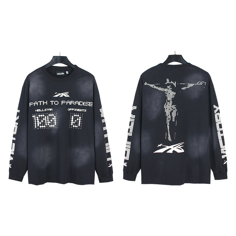 트렌디 브랜드 하이 스트리트 헬스타 아름다운 트렌디 디스트레스드 워싱 캐주얼 루즈 바닥 긴팔 라운드 넥 티셔츠 남성과 여성 대외 무역스토어 가기