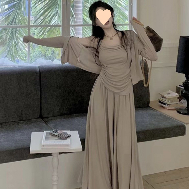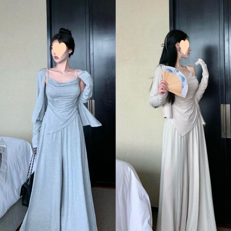 게으른 캐주얼 세트 여성의 봄과 가을 새로운 불규칙한 슬링 카디건 높은 허리 걸레 바지 슬리밍 우아한 3 피스 세트