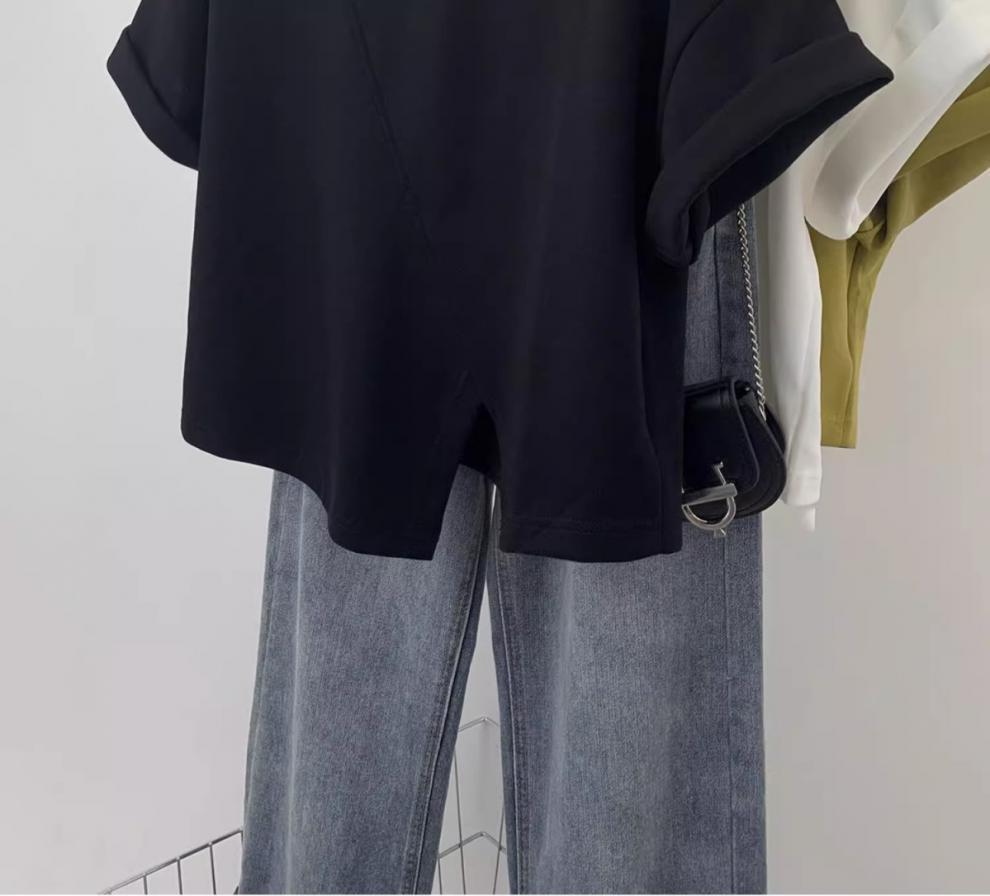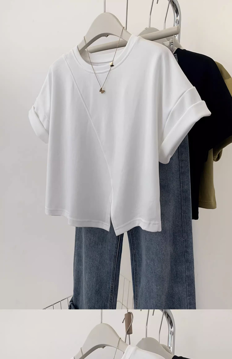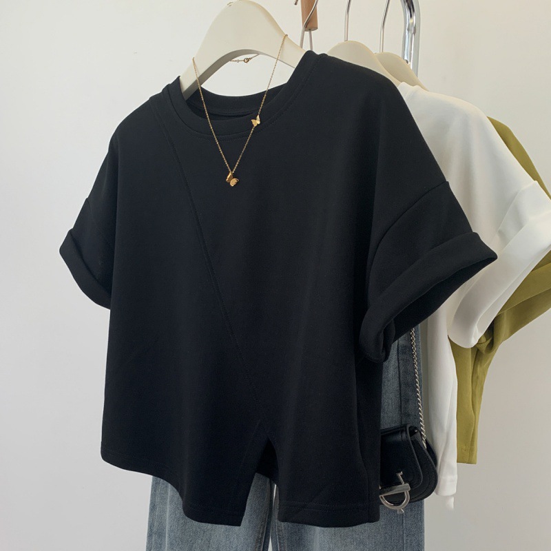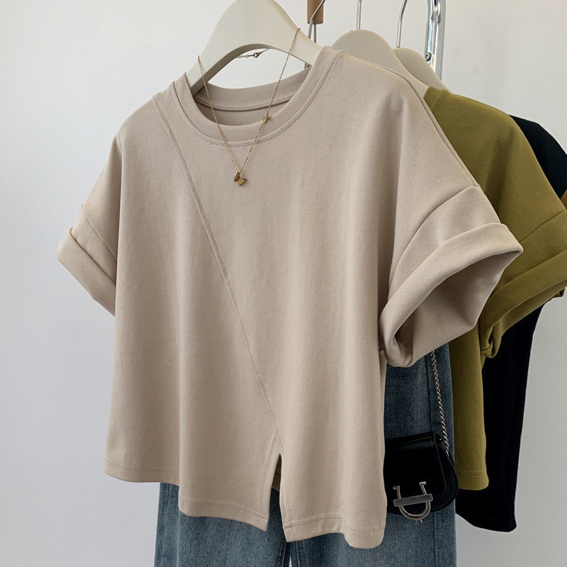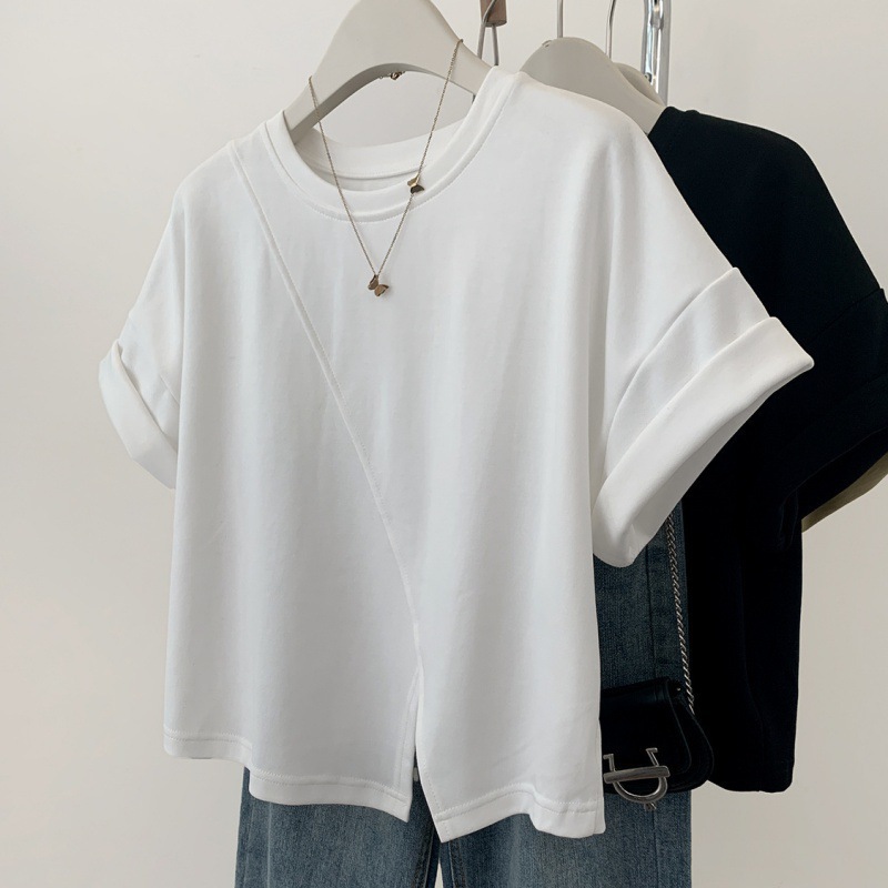 불규칙한 짧은 어깨 반팔 티셔츠 여성 여름 2025 새로운 디자인 센스 작은 어깨 반소매 탑스토어 가기