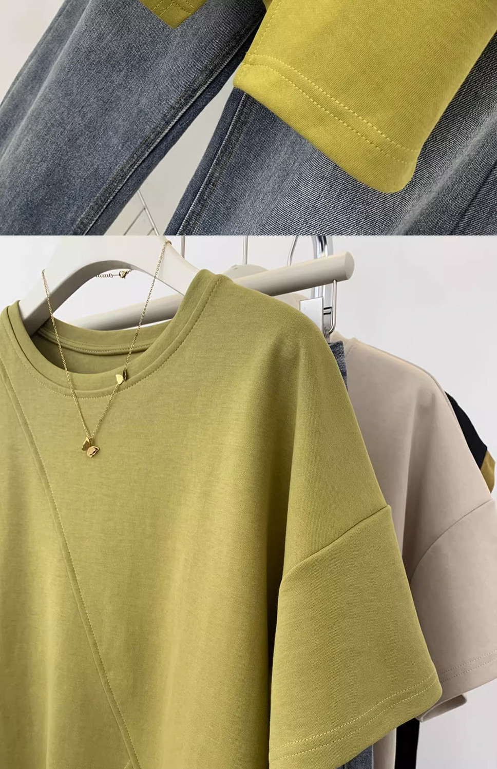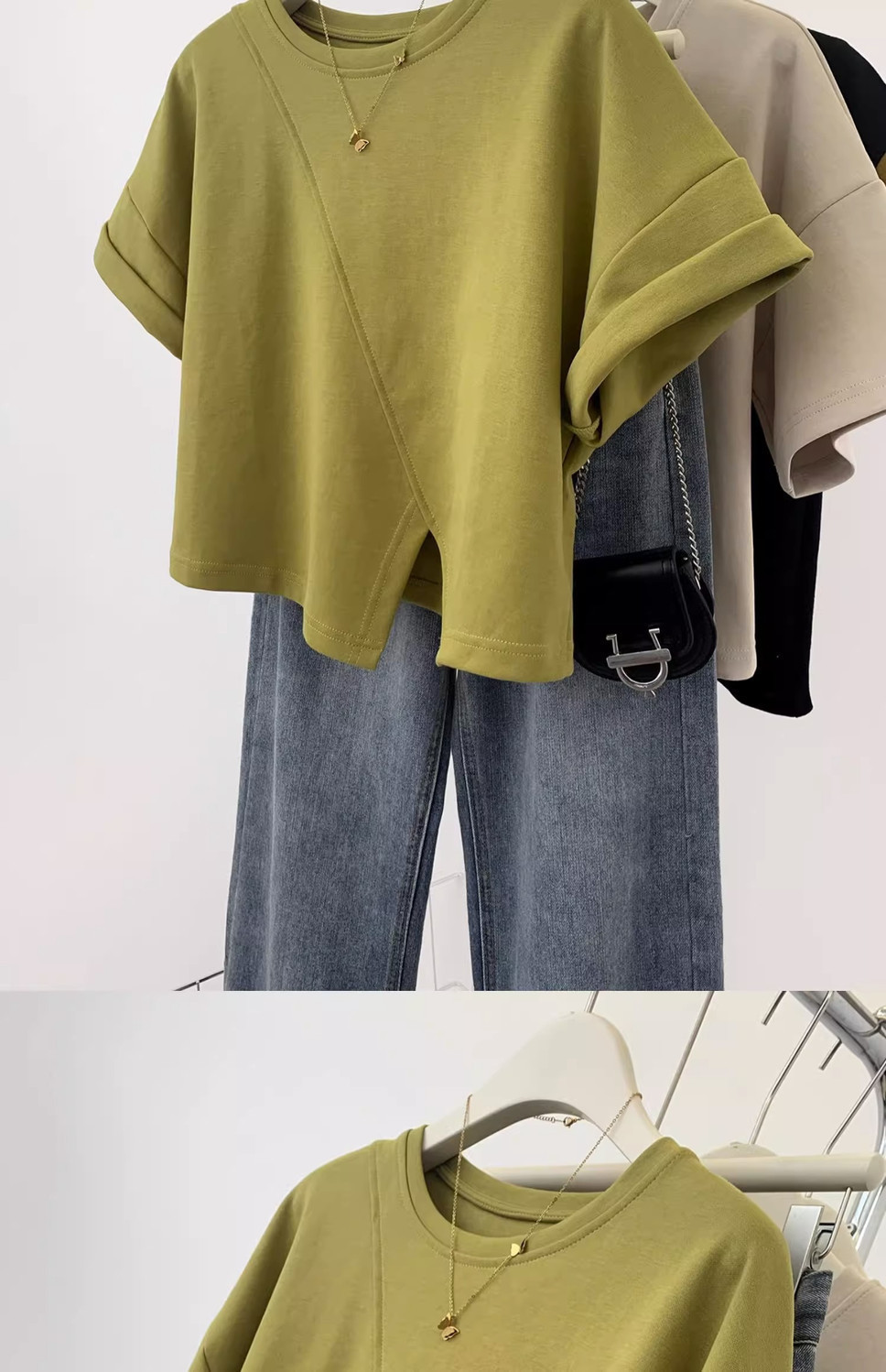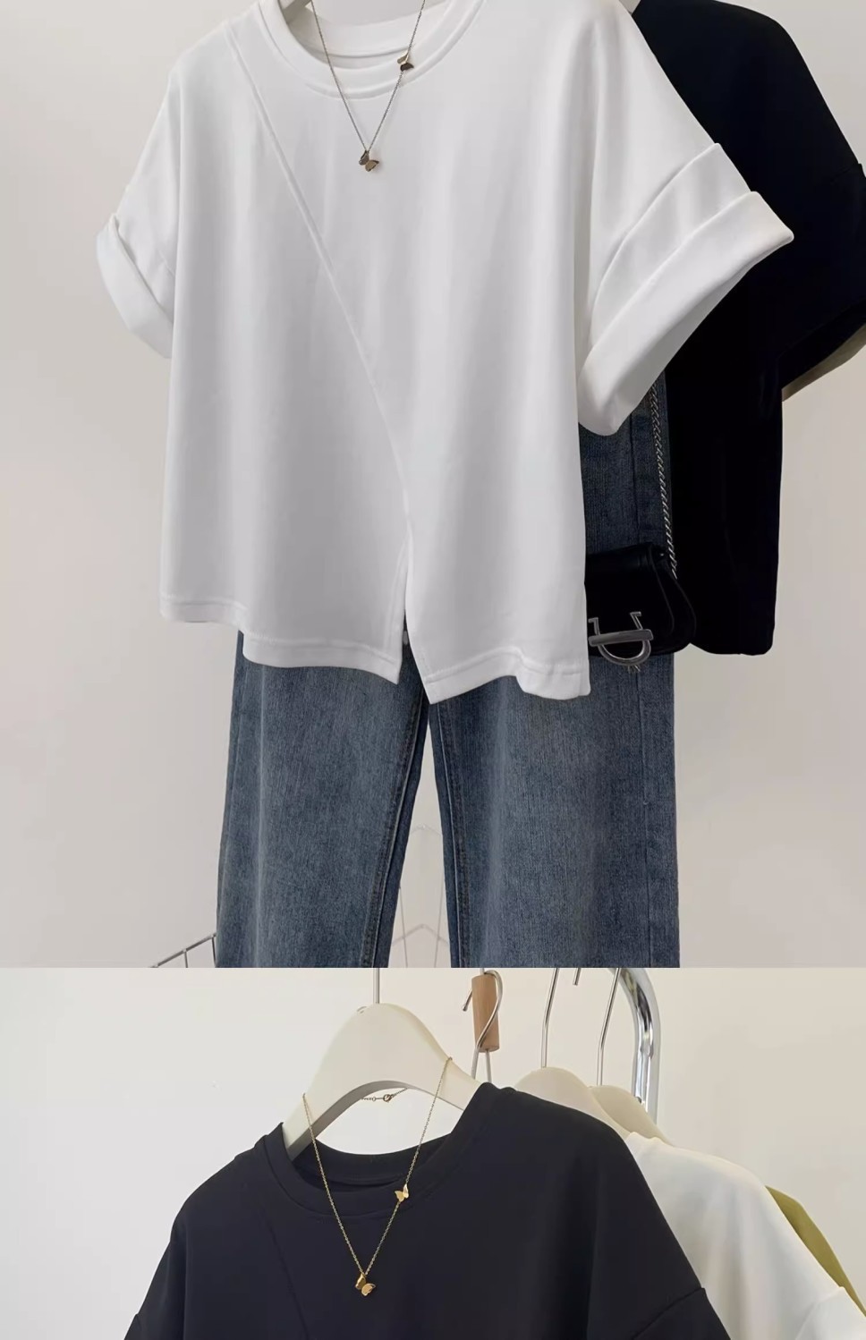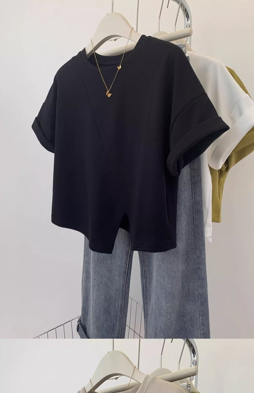 불규칙한 짧은 어깨 반팔 티셔츠 여성 여름 2025 새로운 디자인 센스 작은 어깨 반소매 탑스토어 가기