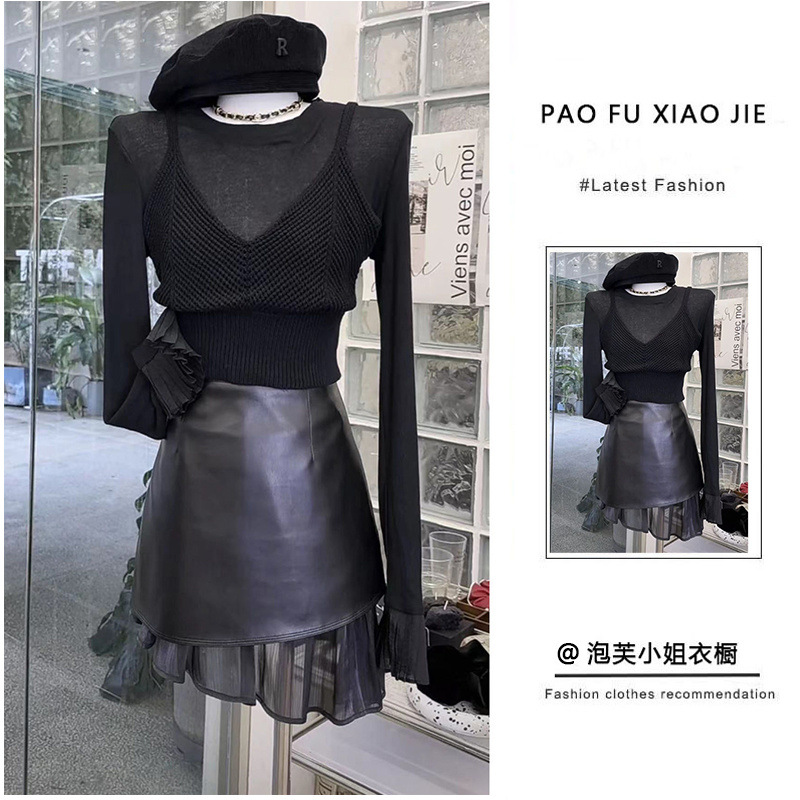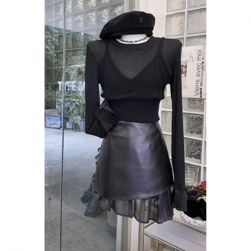 올해, 여성의 가을 한국 게으른 스타일 탑 니트 멜빵 높은 허리 스커트 3 피스 세트스토어 가기
