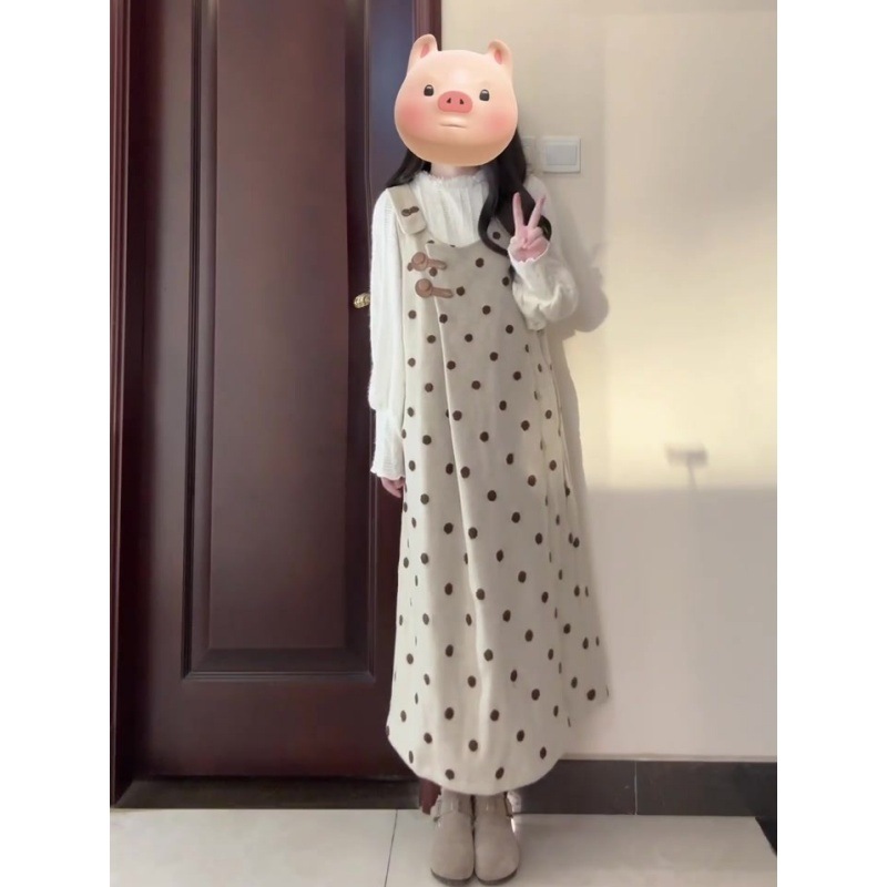 봄은 여성 학생 레이스베이스 셔츠 투피스 세트 원피스 부드러운 스타일의 웨이브 포인트 조끼 세트를 착용합니다.