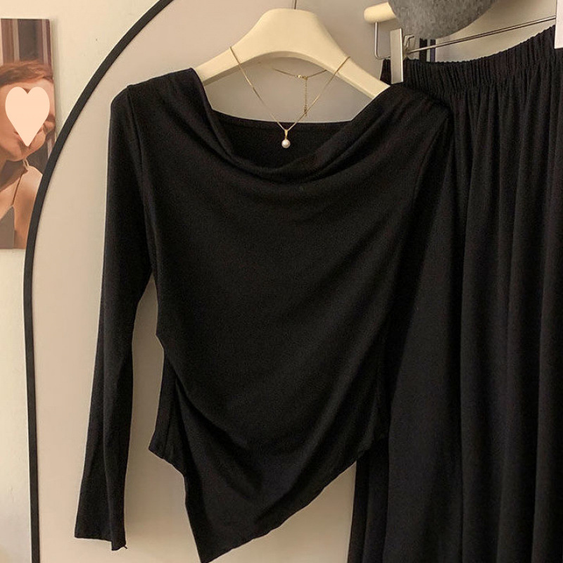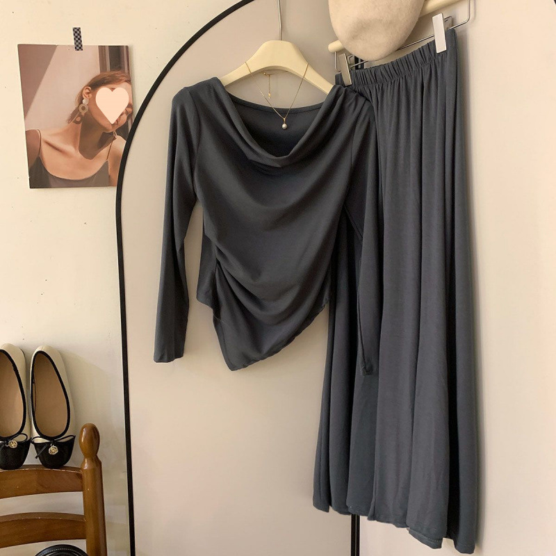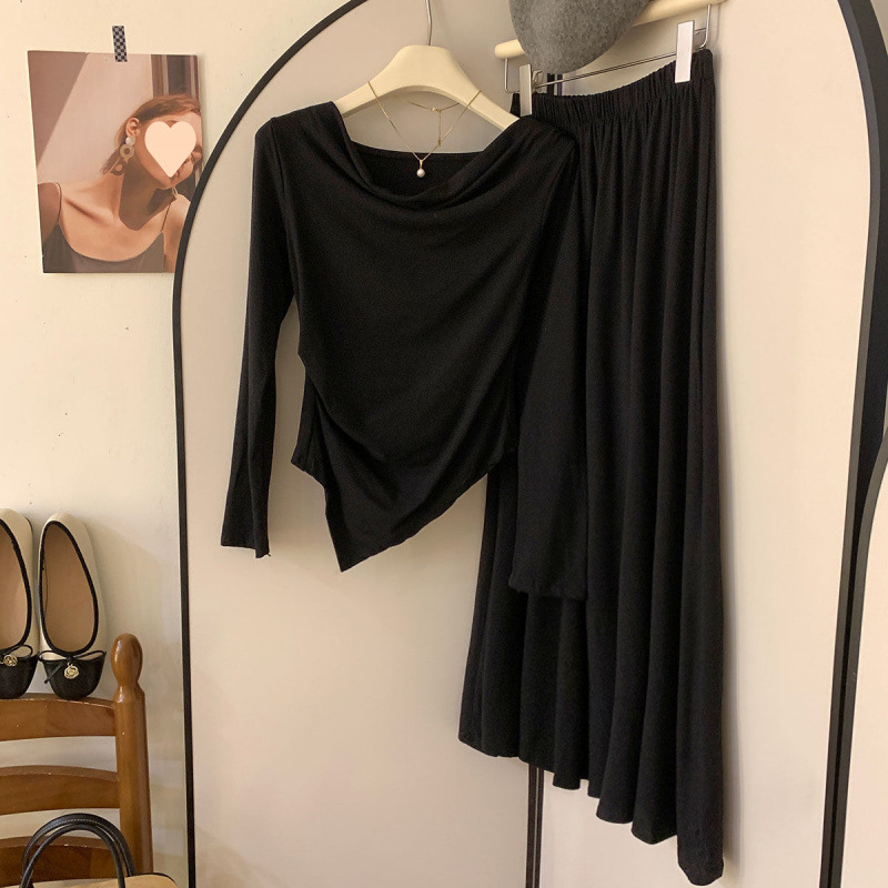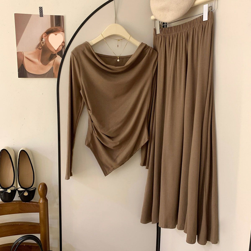 이른 가을 불규칙한 허리 어깨 셔츠 드레이프 긴 원피스 패션 캐주얼 투피스 세트