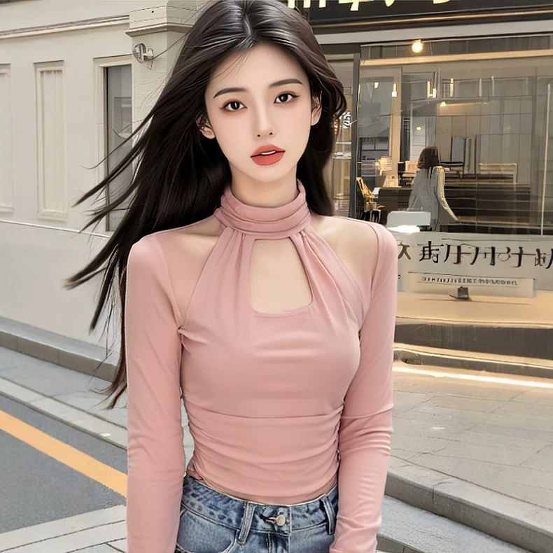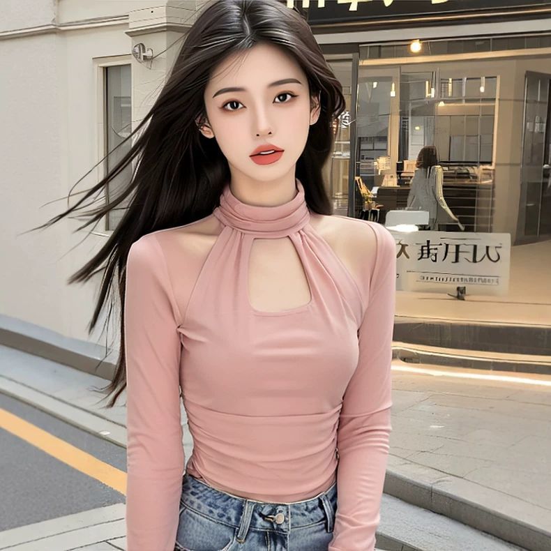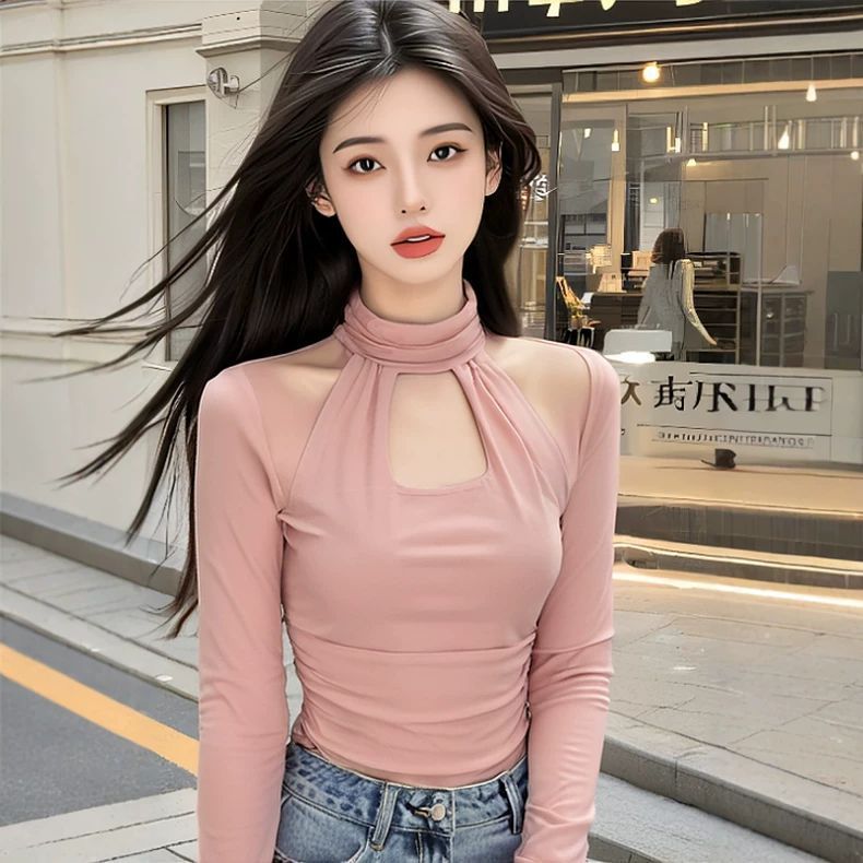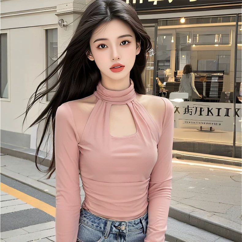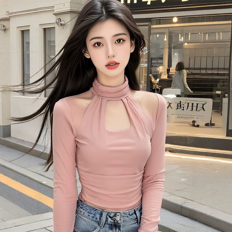 이른 가을 디자인 센스 중공 반 높이 목 하이 엔드 센스 핑크 넥 티셔츠 여성용 퓨어 슬림 핏 슬림 긴팔 탑스토어 가기