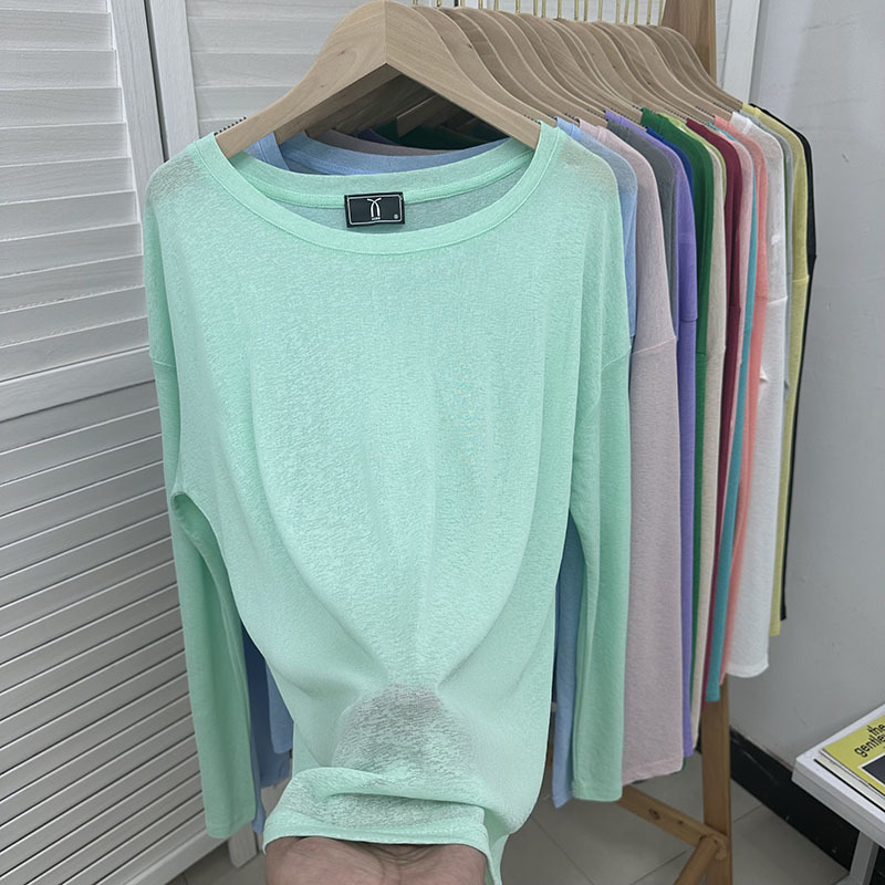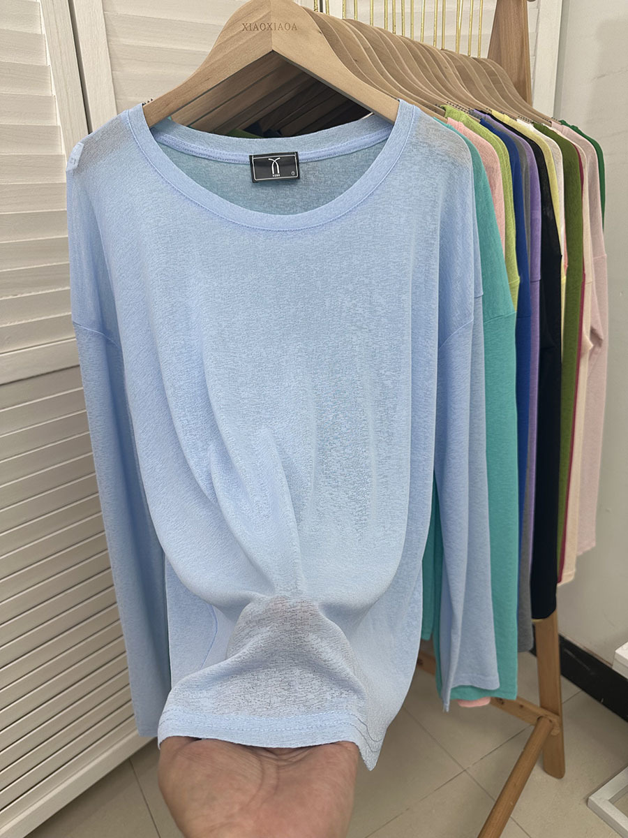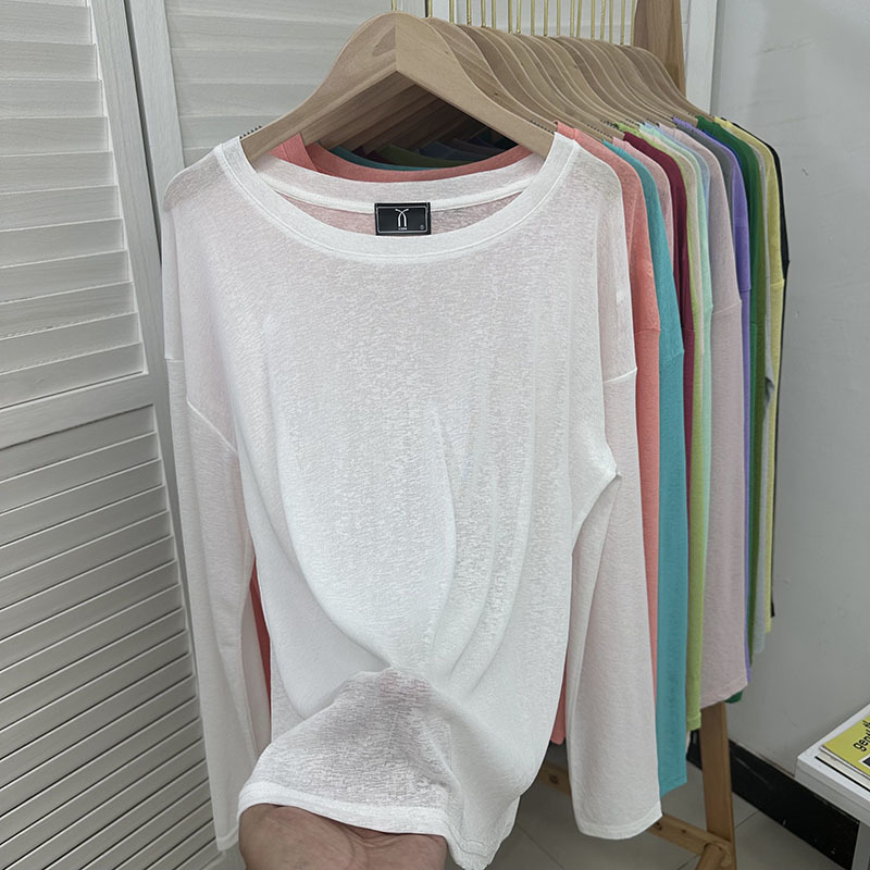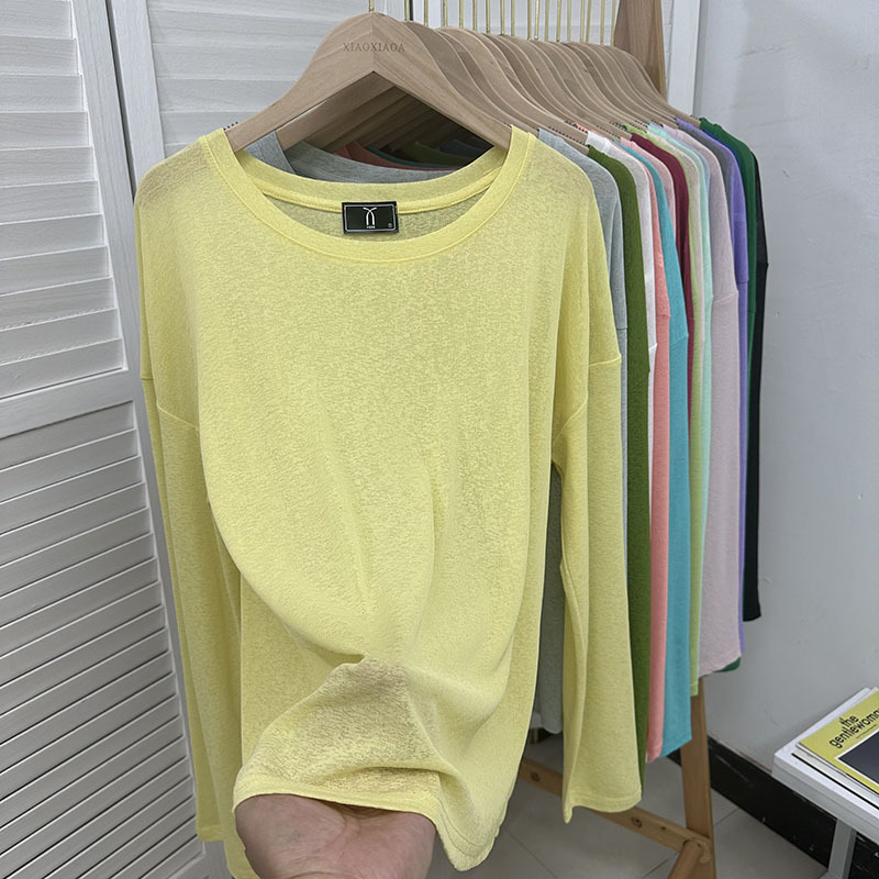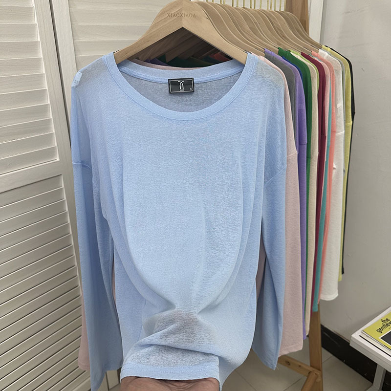 느슨한 긴팔 선 스크린 티셔츠 여성용 블라우스 에어컨 셔츠 여름 얇은 통기성 서양식 게으른 스타일 마이크로 투명 탑