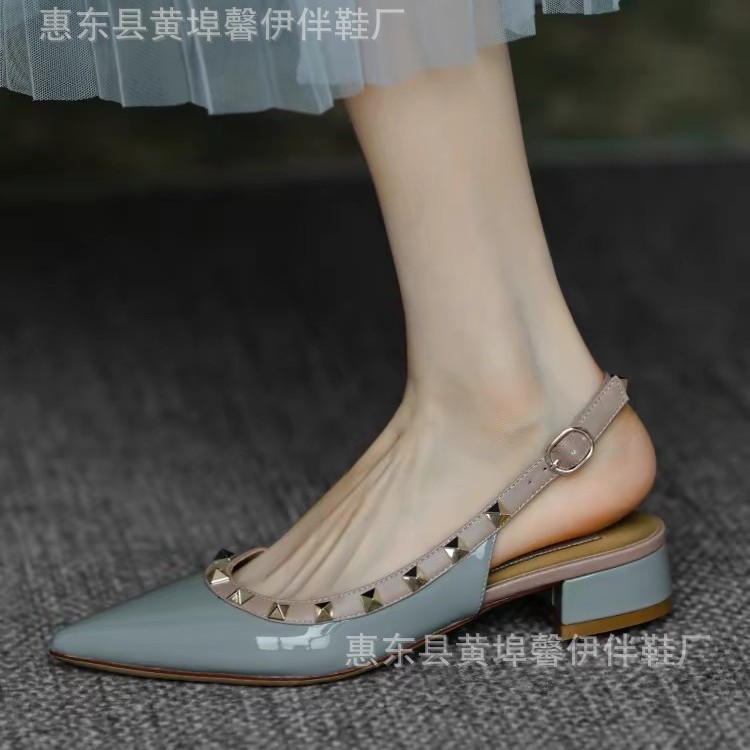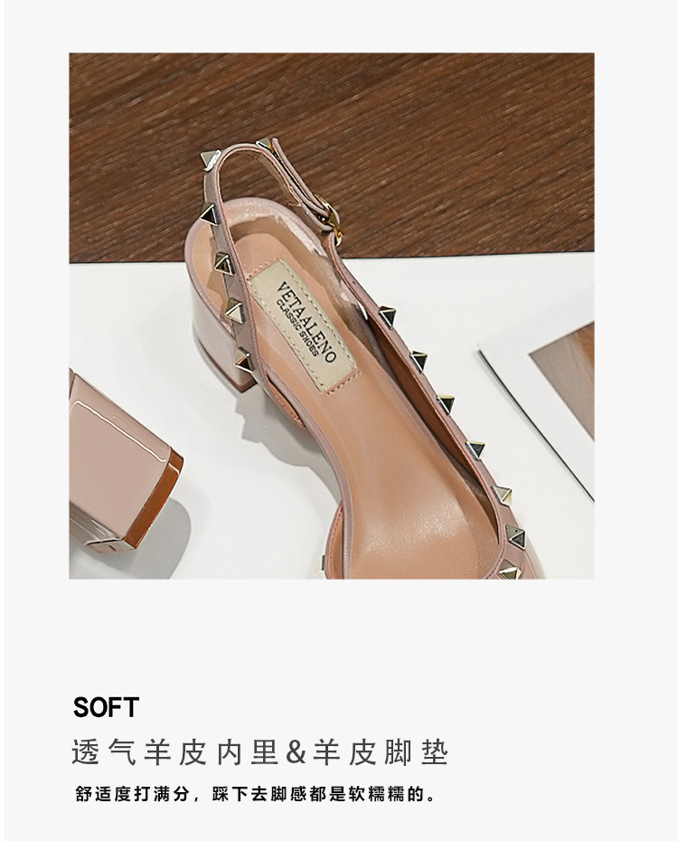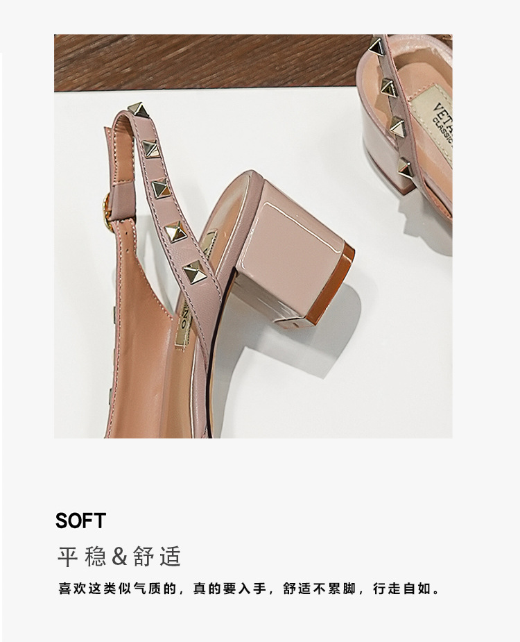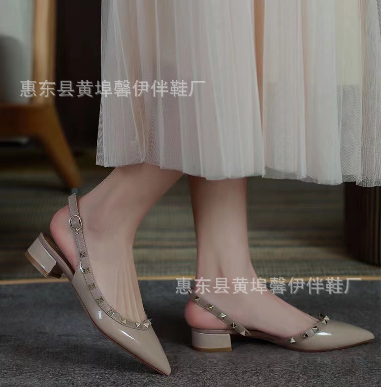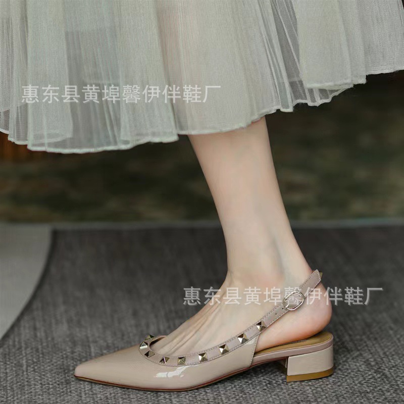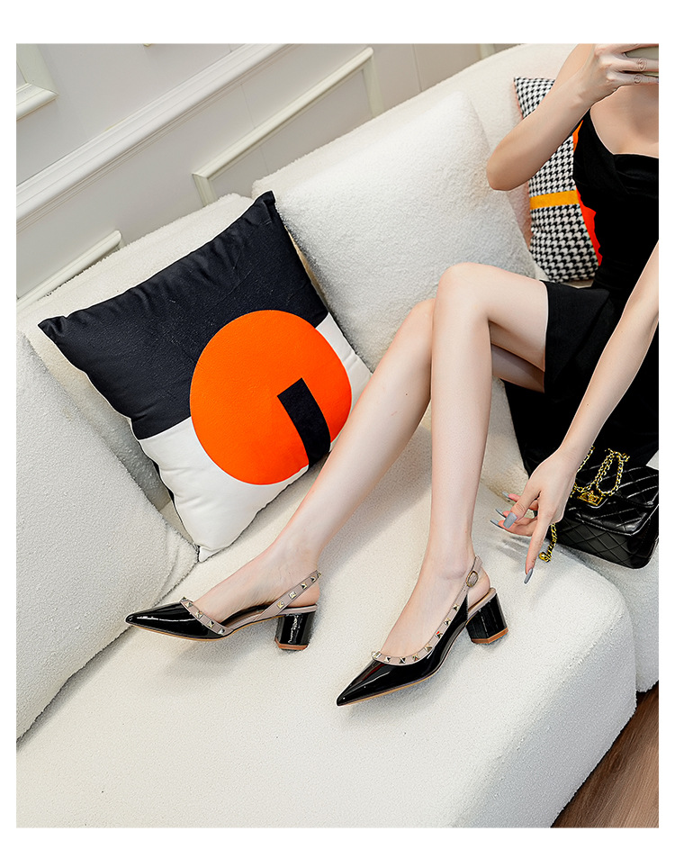 프랑스 뾰족한 리벳 청키 힐 신발 2025 봄과 여름 온라인 빨간 특허 가죽 누드 샌들 우아한 리어 에어 스퀘어 여성 다큐멘터리 신발