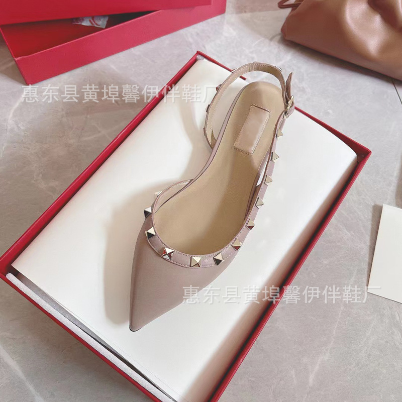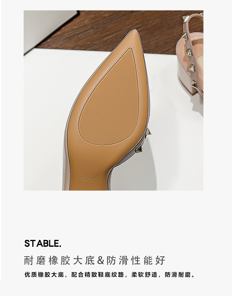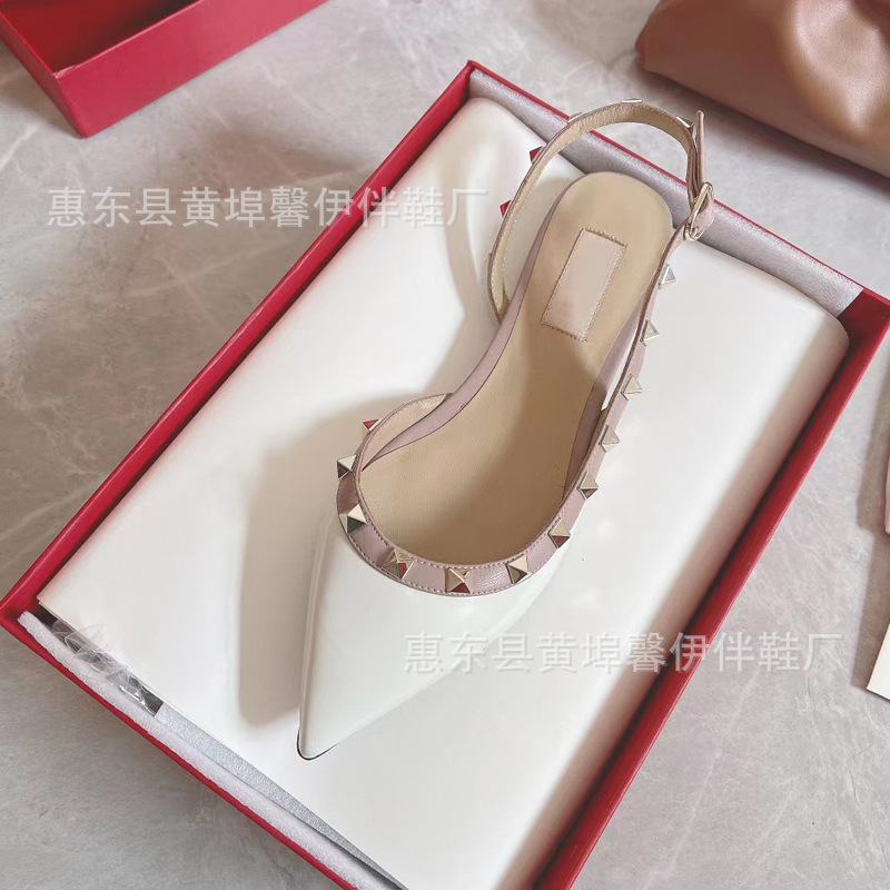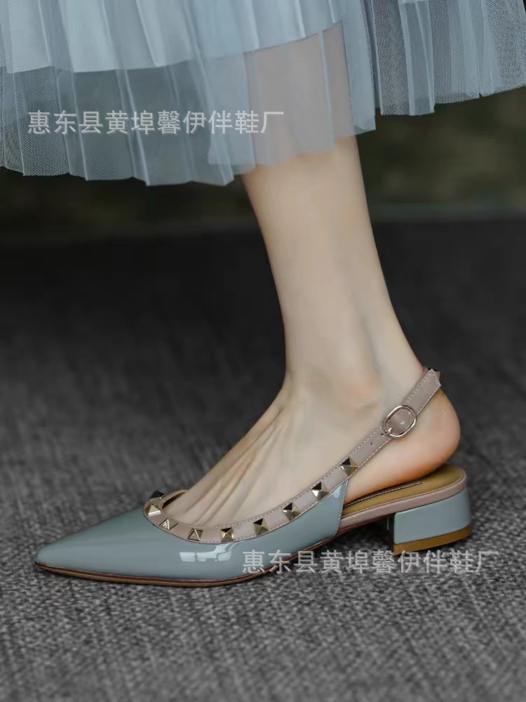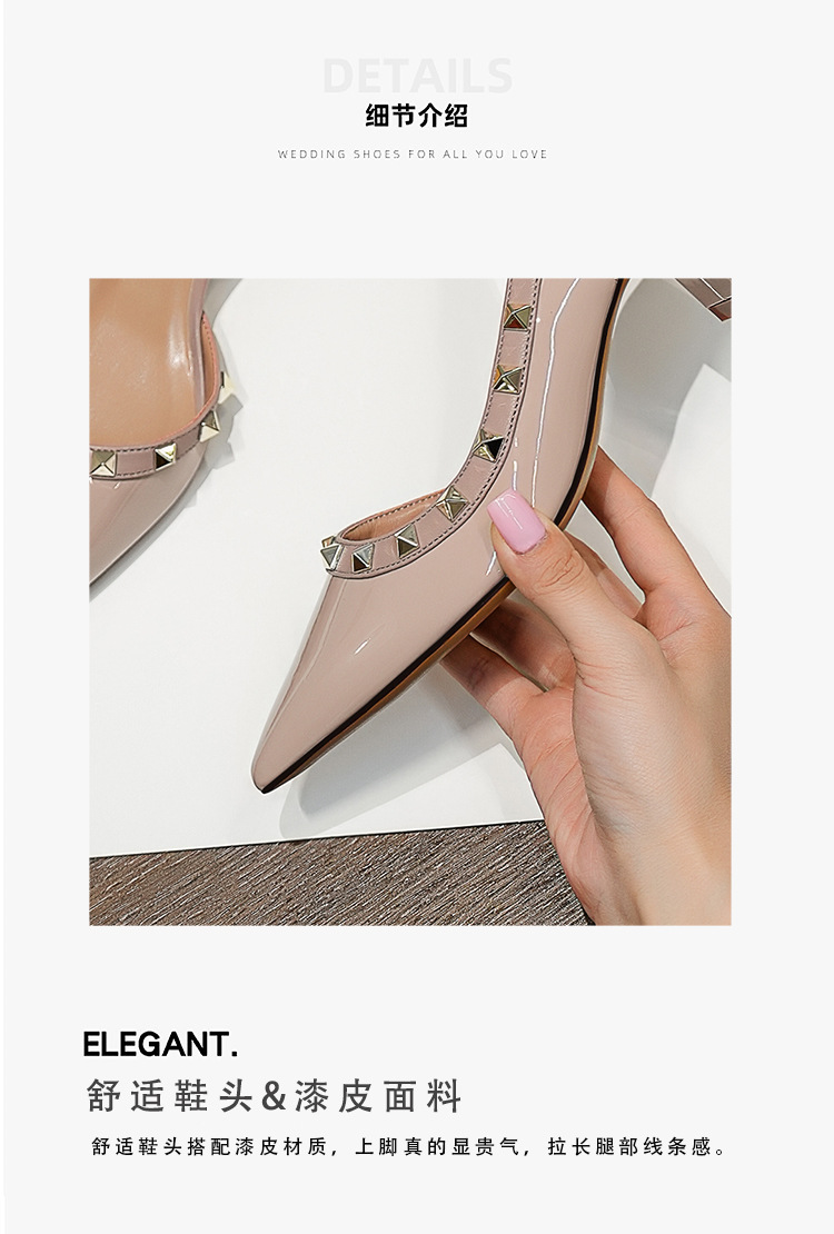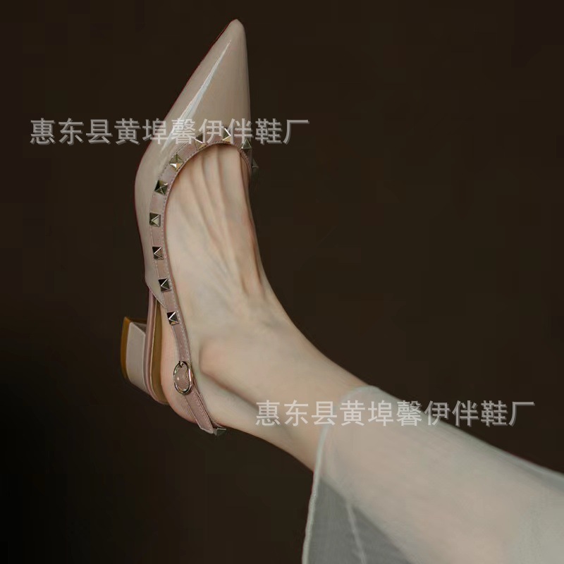 프랑스 뾰족한 리벳 청키 힐 신발 2025 봄과 여름 온라인 빨간 특허 가죽 누드 샌들 우아한 리어 에어 스퀘어 여성 다큐멘터리 신발