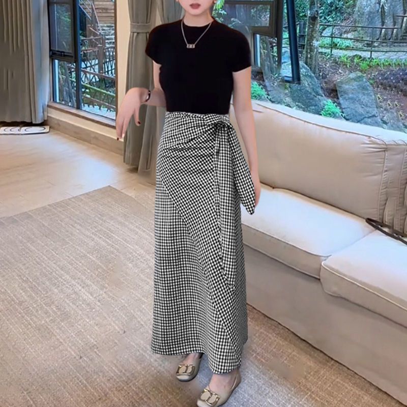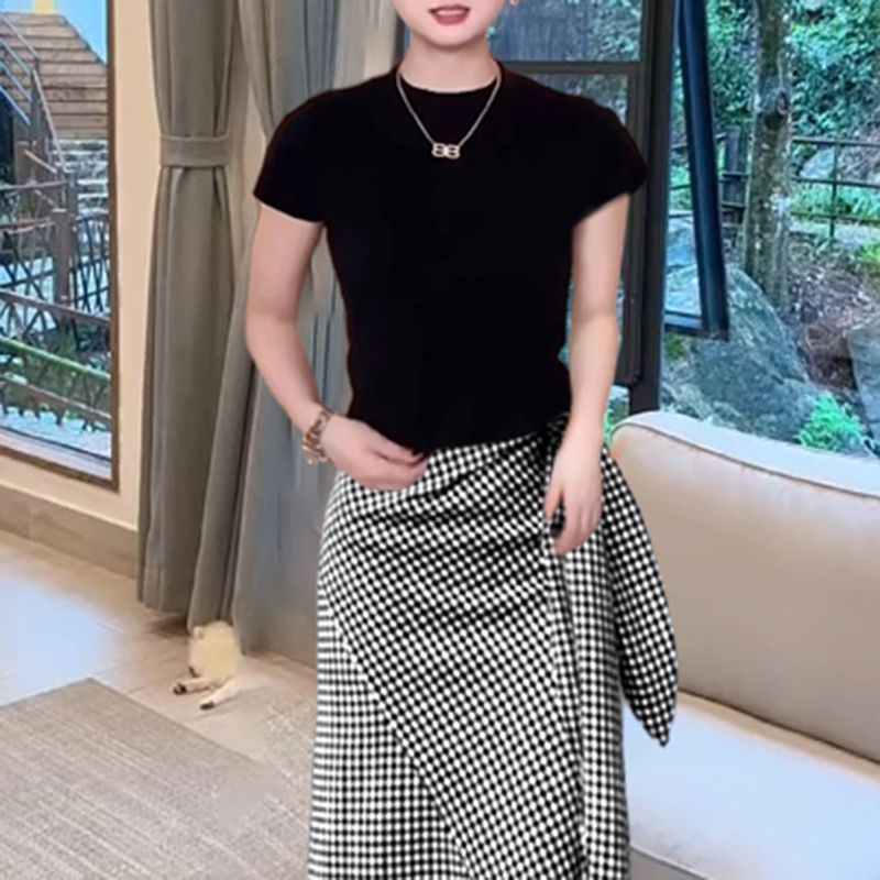 스트랩 디자인 높은 허리 느슨한 슬리밍 격자 무늬 스커트 여성의 간단한 단색 짧은 소매 최고 여름 투피스 세트