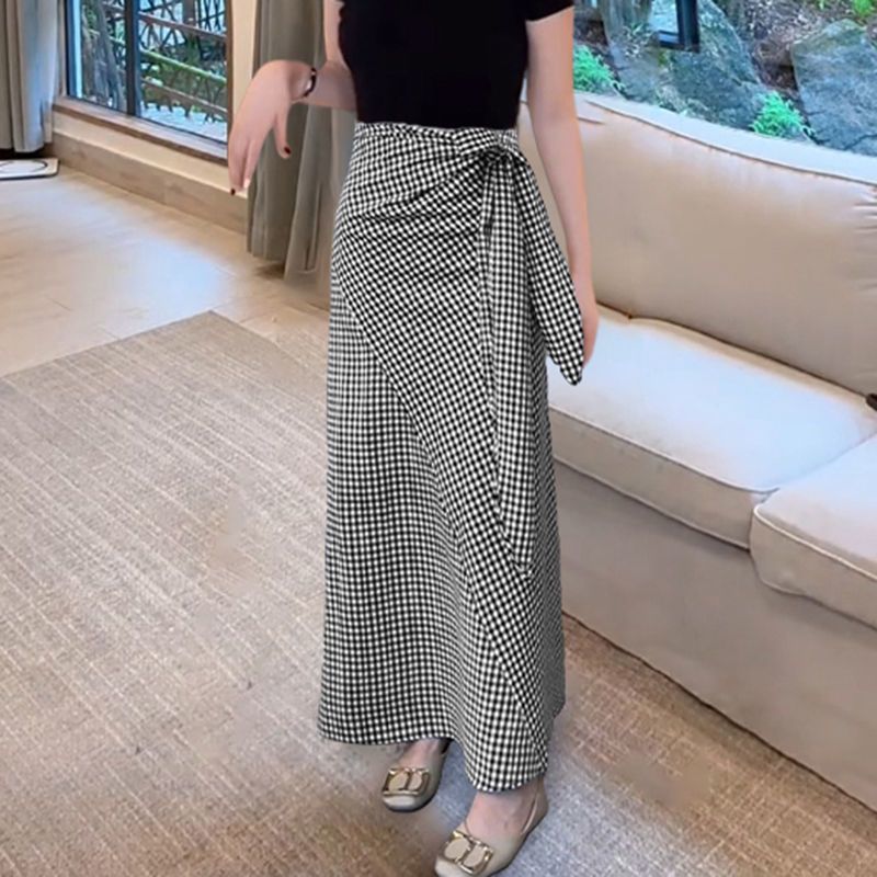 스트랩 디자인 높은 허리 느슨한 슬리밍 격자 무늬 스커트 여성의 간단한 단색 짧은 소매 최고 여름 투피스 세트스토어 가기