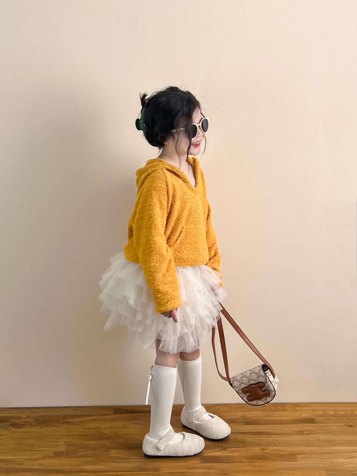 소녀의 봄 부드러운 왁스 피부 친화적 인 노란색 캐주얼 후드 탑 아이보리 케이크 절반 길이의 베일 스커트스토어 가기