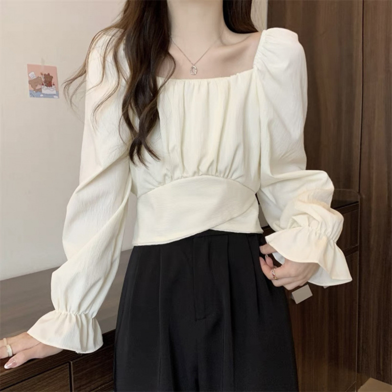 봄 2025 프랑스 쇄골 광장 칼라 버블 소매 셔츠 여성용 서양식 세련된 짧은 넥타이스토어 가기
