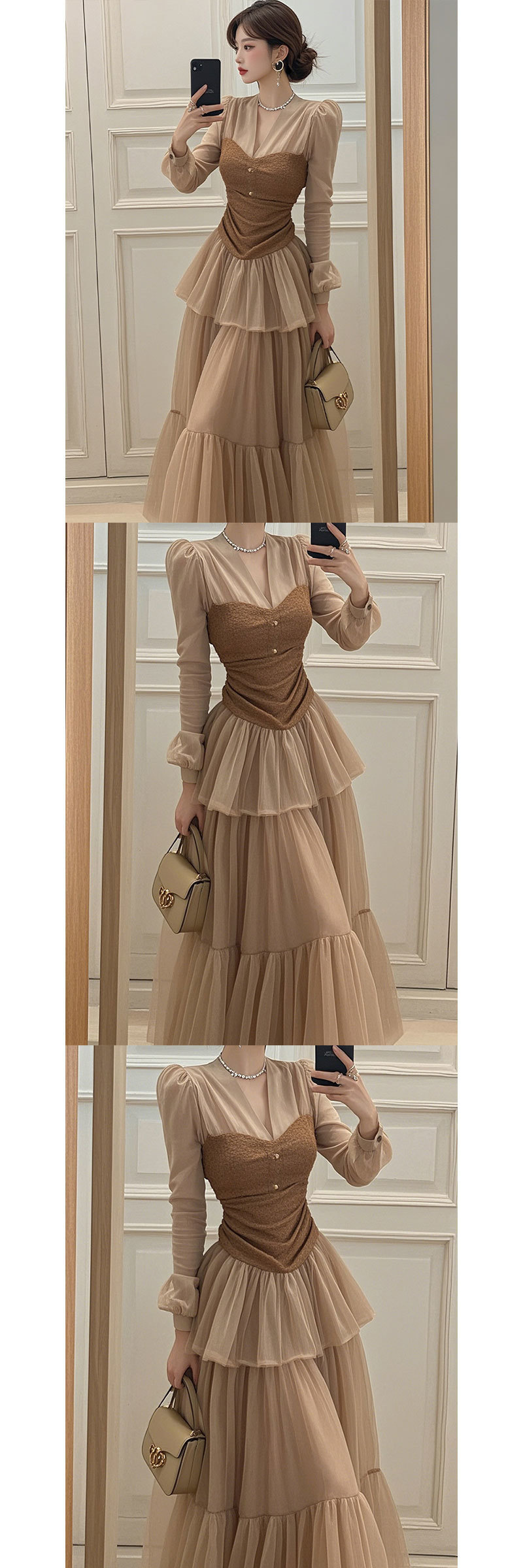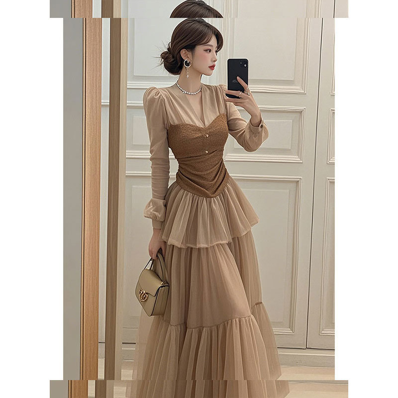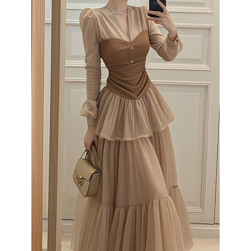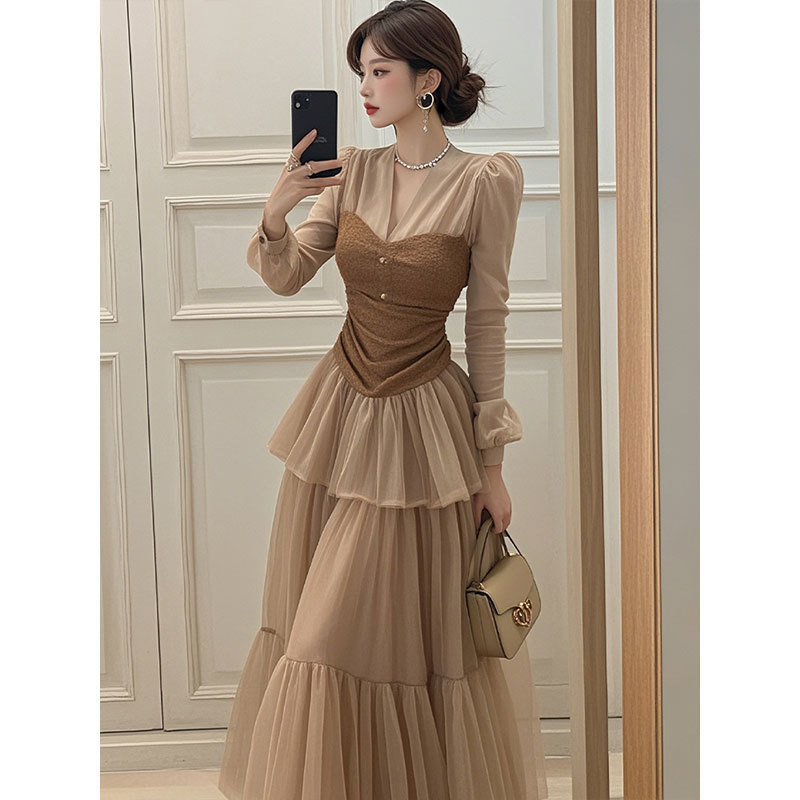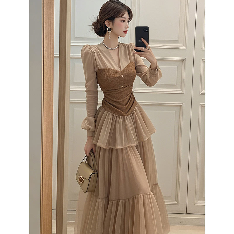 이른 봄 2025 새로운 여성복 다크 브라운 V-Neck 긴 소매 케이크 원피스스토어 가기
