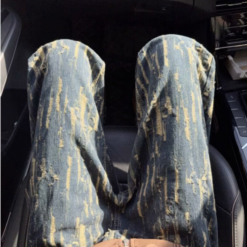 블루 스크레이프 자카드 청바지 남성 가을 및 겨울 미국 스타일 하이 스트리트 팬츠 스트레이트 배럴 느슨한 마이크로 와이드 레그 팬츠 하이 스트리트스토어 가기