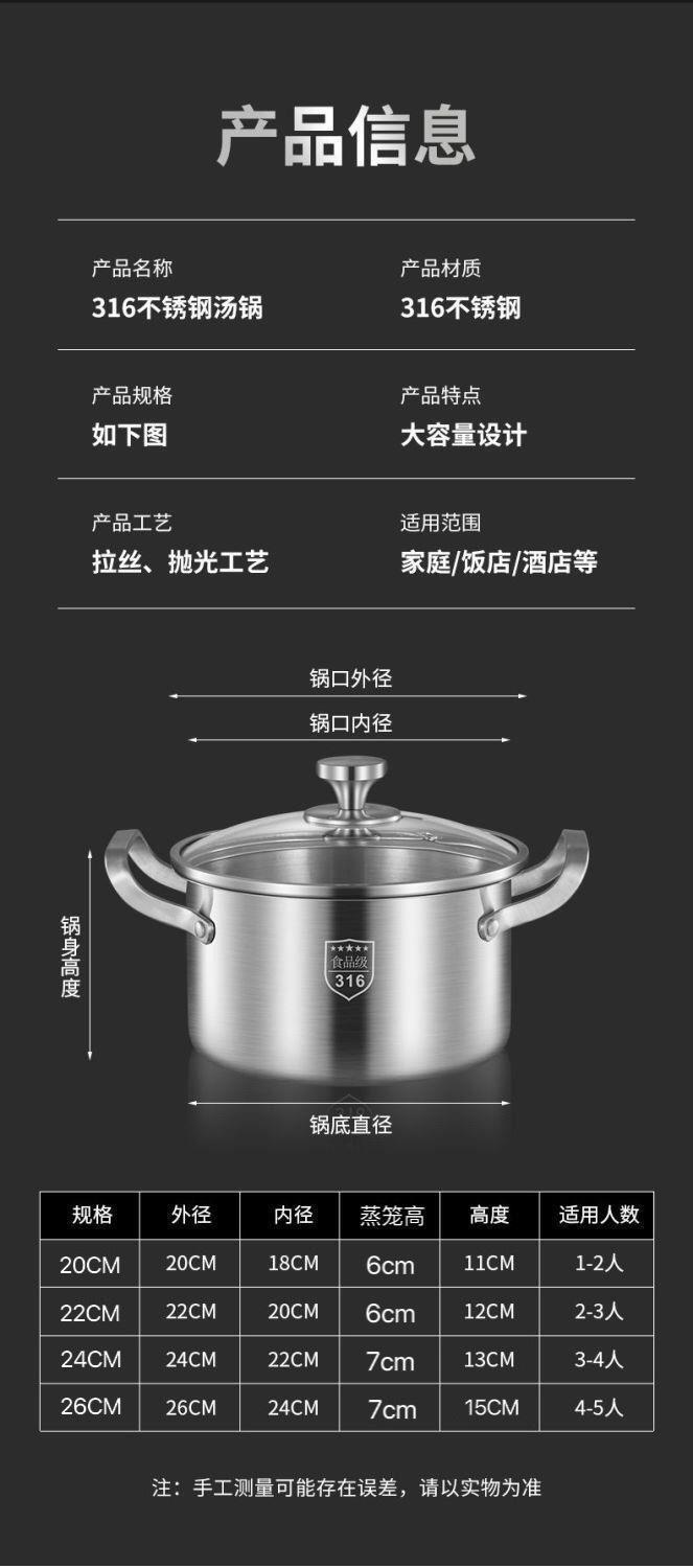 316 스테인레스 스틸 수프 냄비 두꺼운 가정용 기선 죽 냄비 스튜 냄비 바이노럴 가스 스토브 유도 쿠커를위한 특별