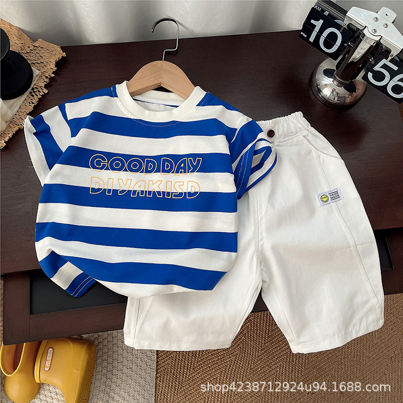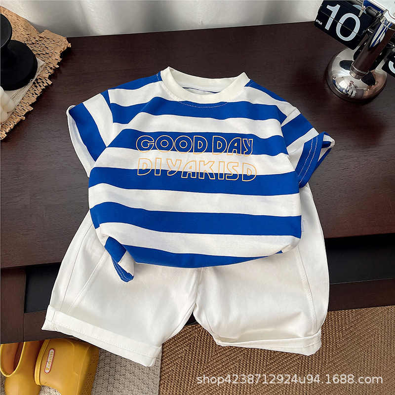 2025 새로운 소년 여름 영어 은색 반팔 세트 유행 소년 아기 옷 어린이 투피스 세트스토어 가기