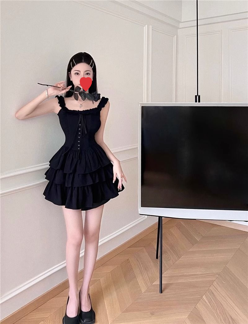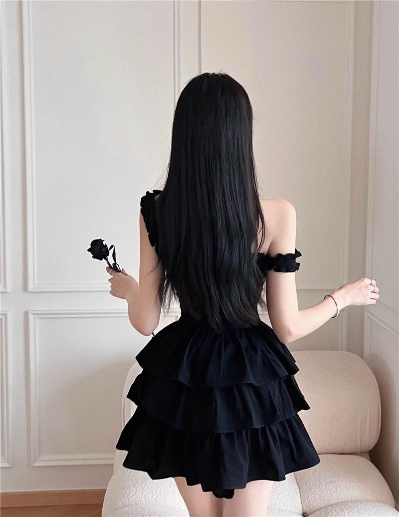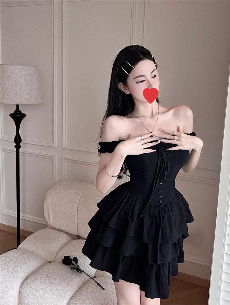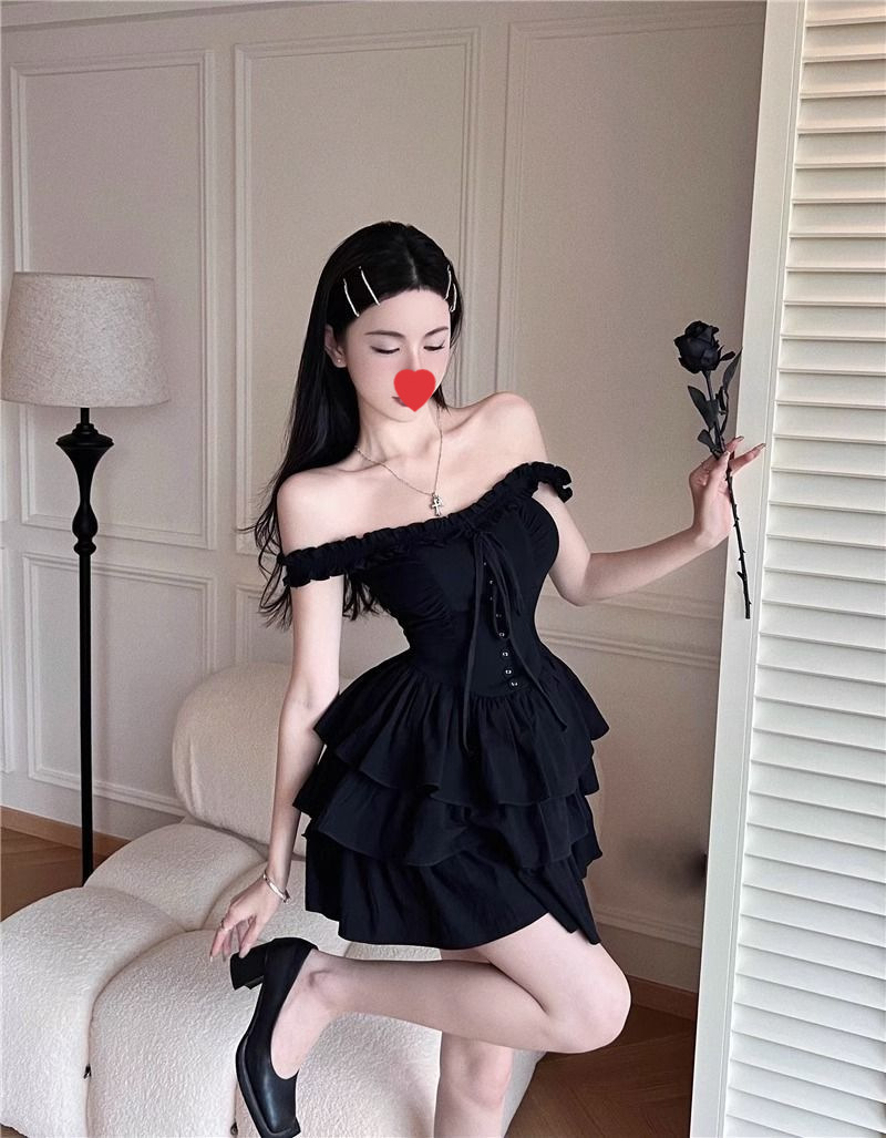 밀크 후푸 원피스 허리 달콤한 시원한 뜨거운 소녀 스타일 오프 숄더 하이 엔드 블랙 스트랩 푹신한 케이크 스커트 여성 패션스토어 가기
